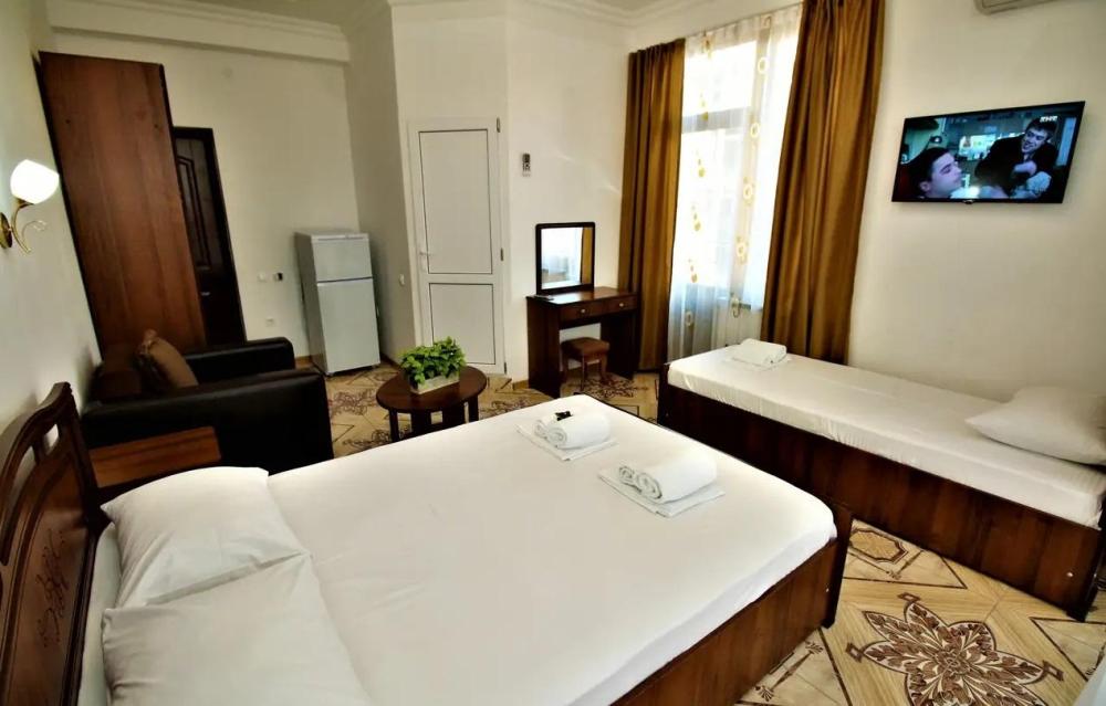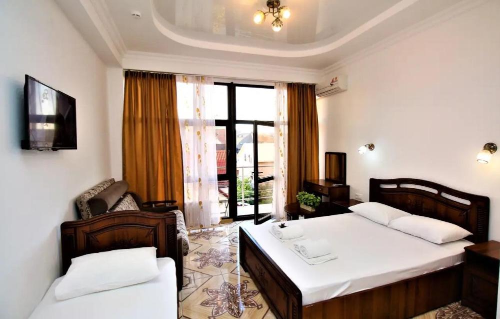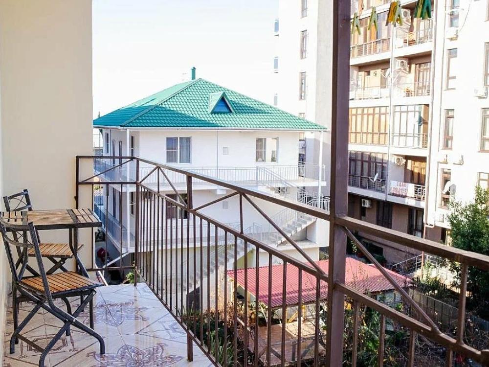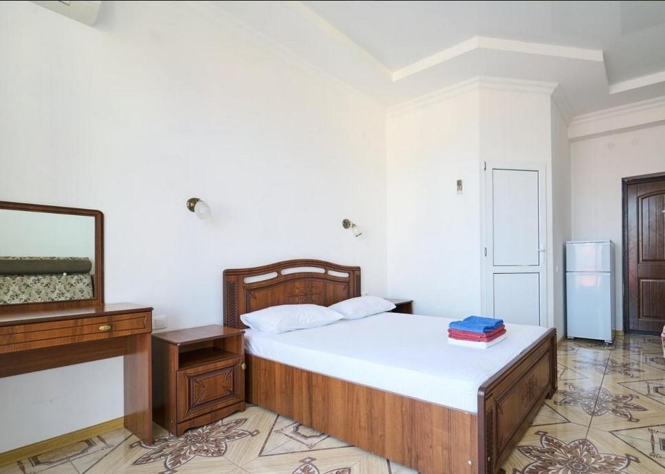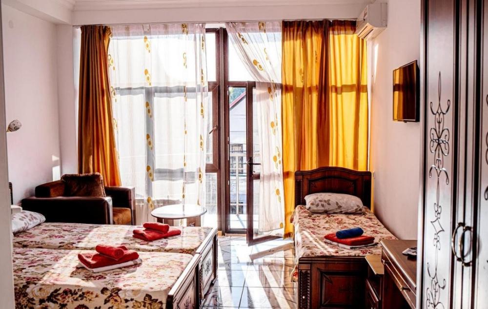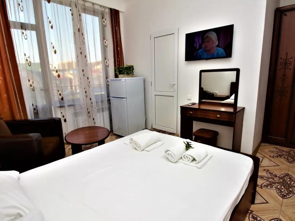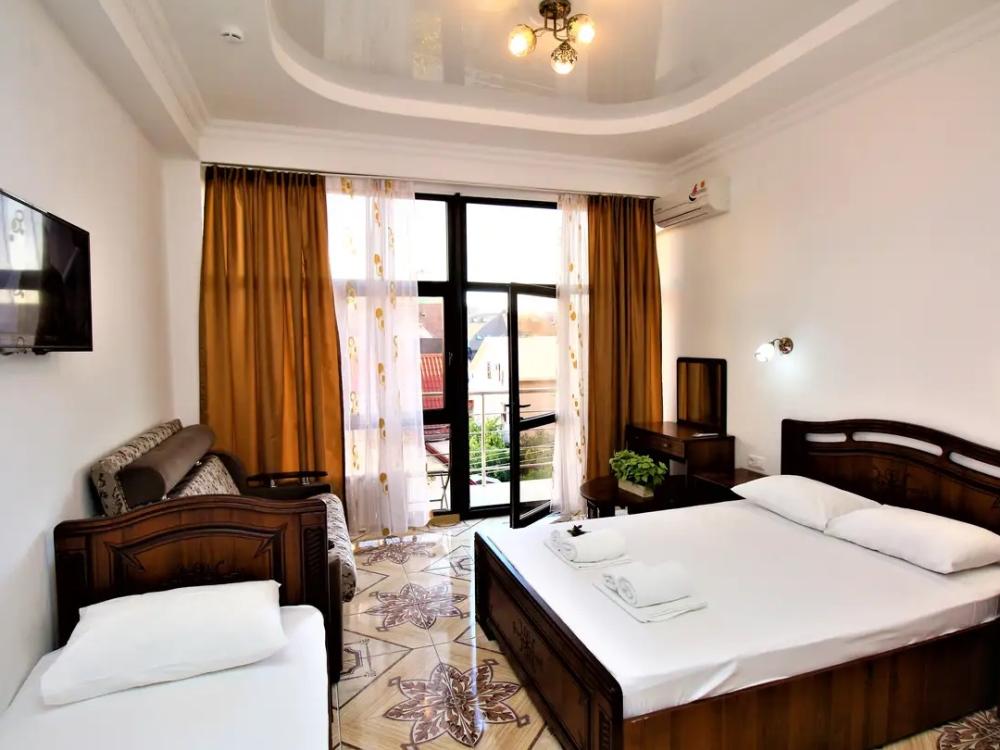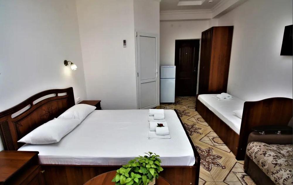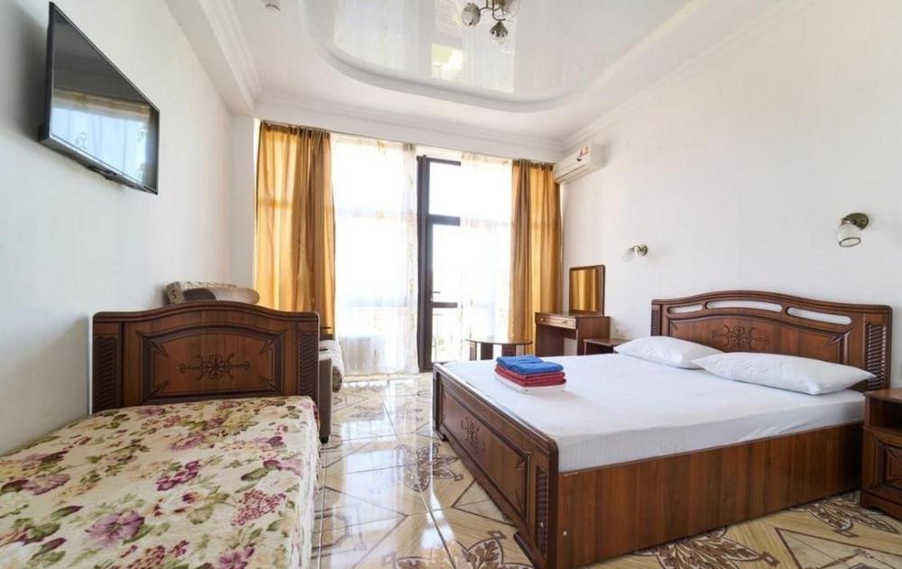 Просторная комната стандарт с балконом площадью 25 кв.м. для размещения до 4-х гостей. Для комфортного проживания гостей номер оснащен всем необходимым: двухспальная кровать, раскладной диван, односпальная кровать, прикроватные тумбочки, шкаф, кондиционер, холодильник, ванная комната с душем, туалетно-гигиенические принадлежности, набор полотенец.