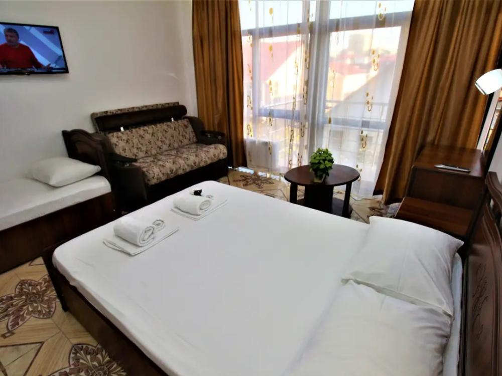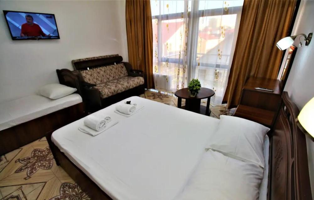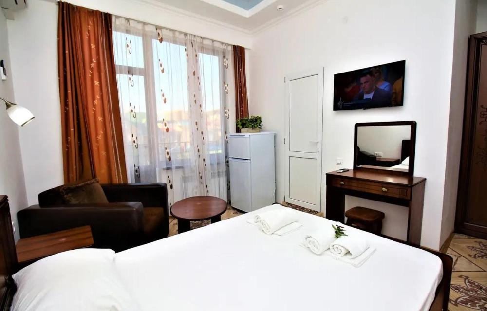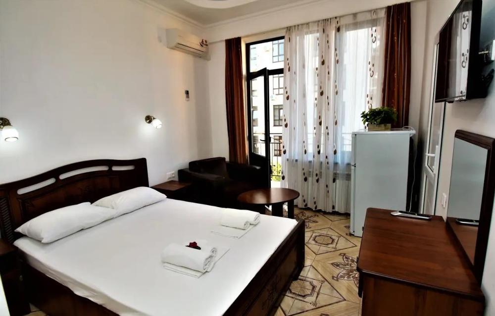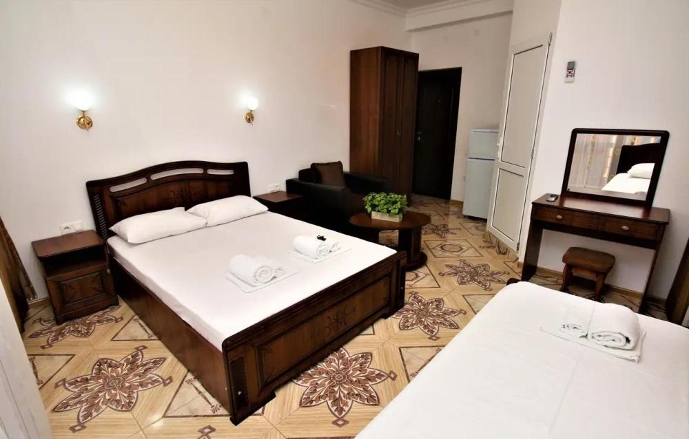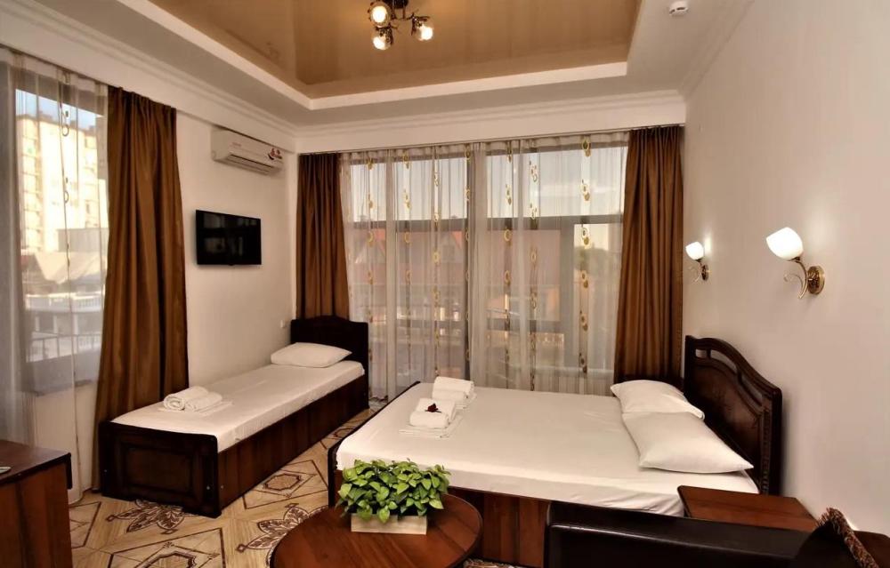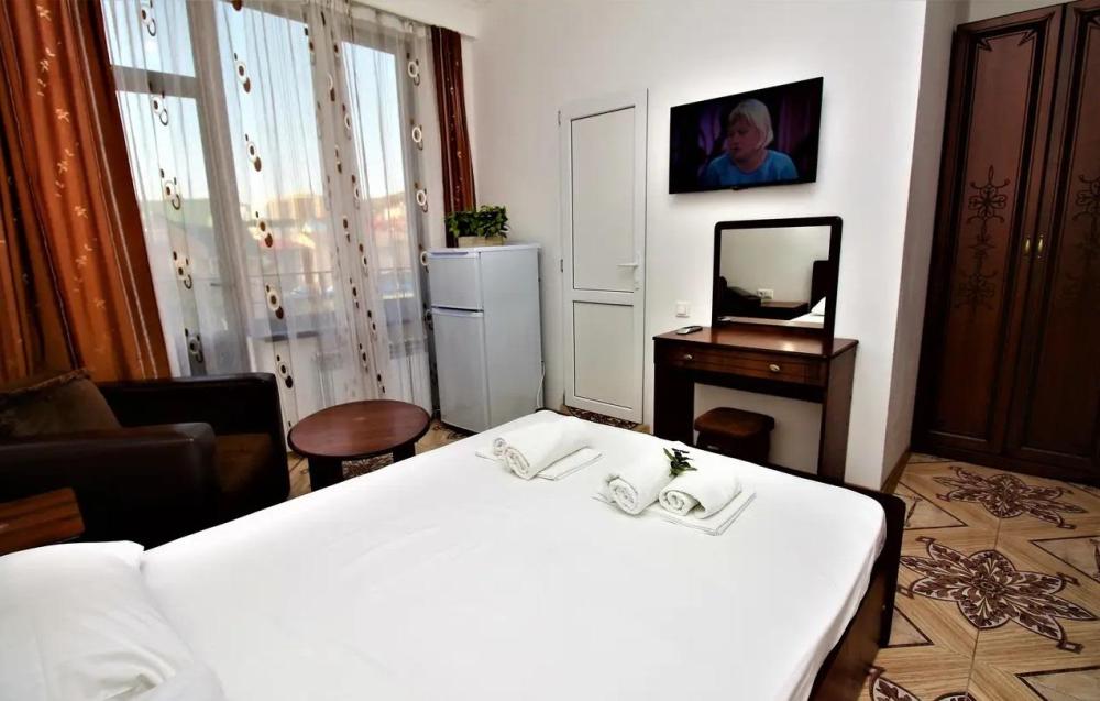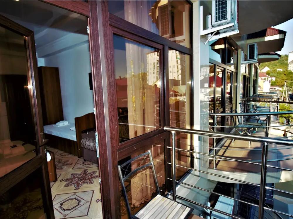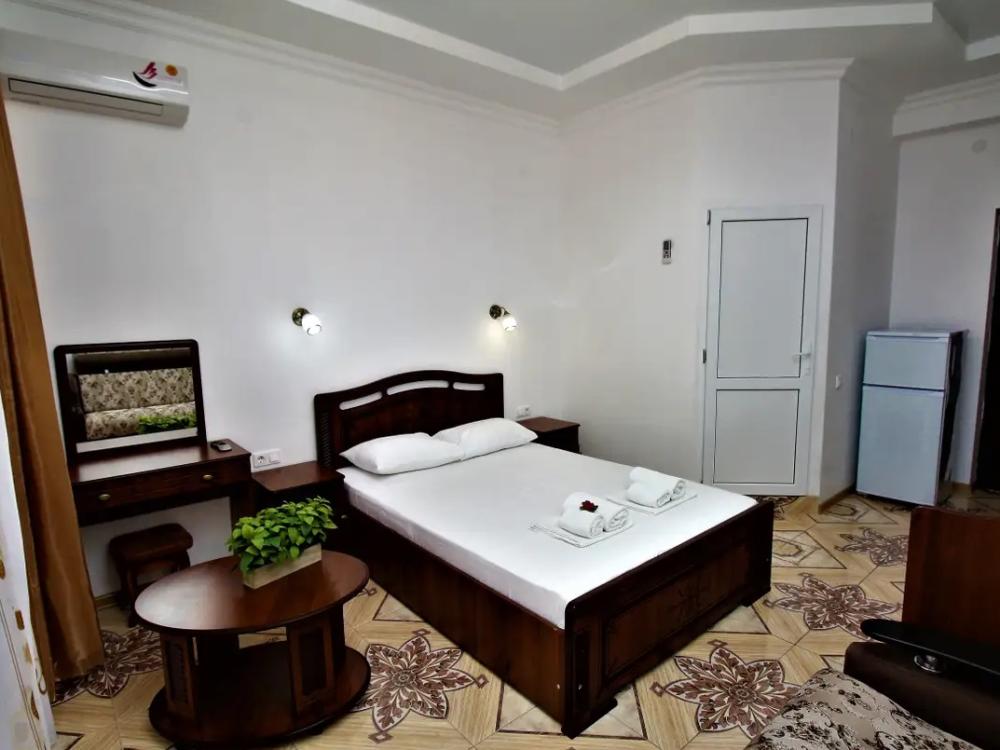 Просторная комната стандарт с балконом площадью 25 кв.м. для размещения до 4-х гостей. Для комфортного проживания гостей номер оснащен всем необходимым: двухспальная кровать, раскладной диван, односпальная кровать, прикроватные тумбочки, шкаф, кондиционер, холодильник, ванная комната с душем, туалетно-гигиенические принадлежности, набор полотенец.