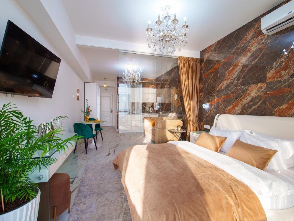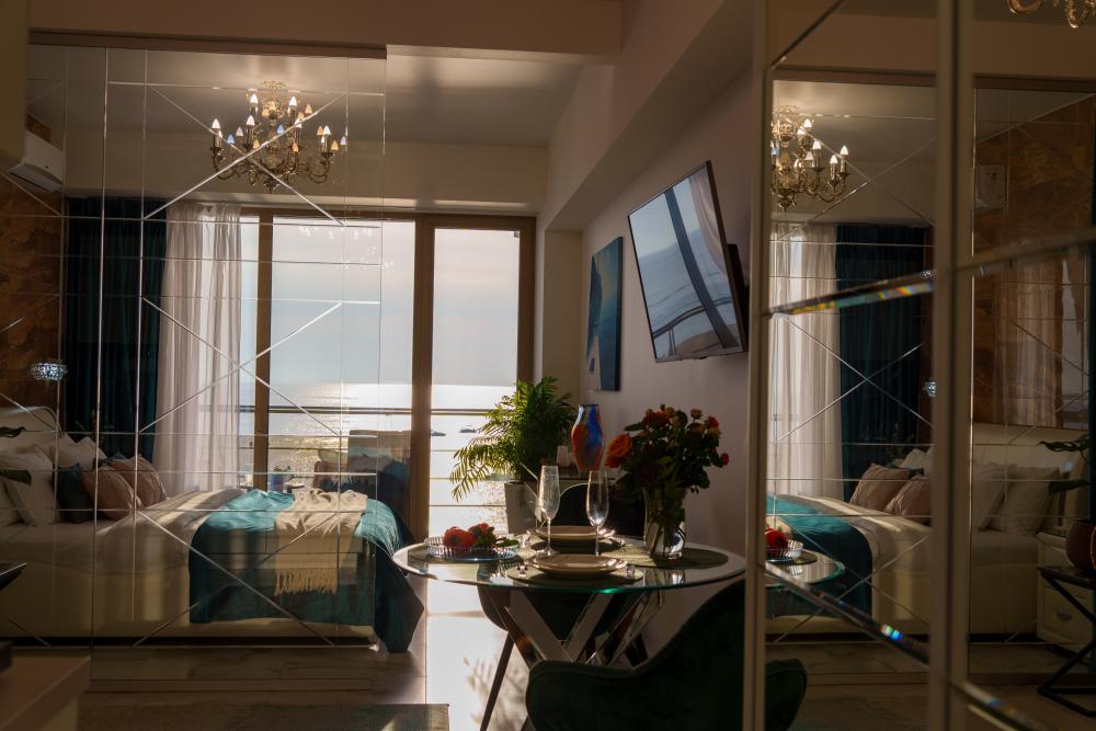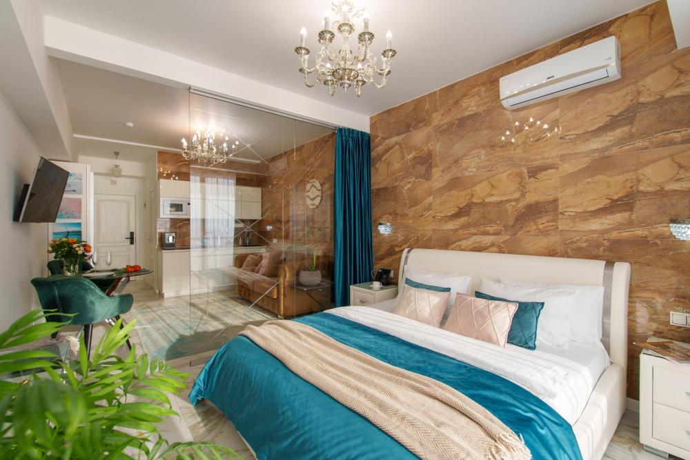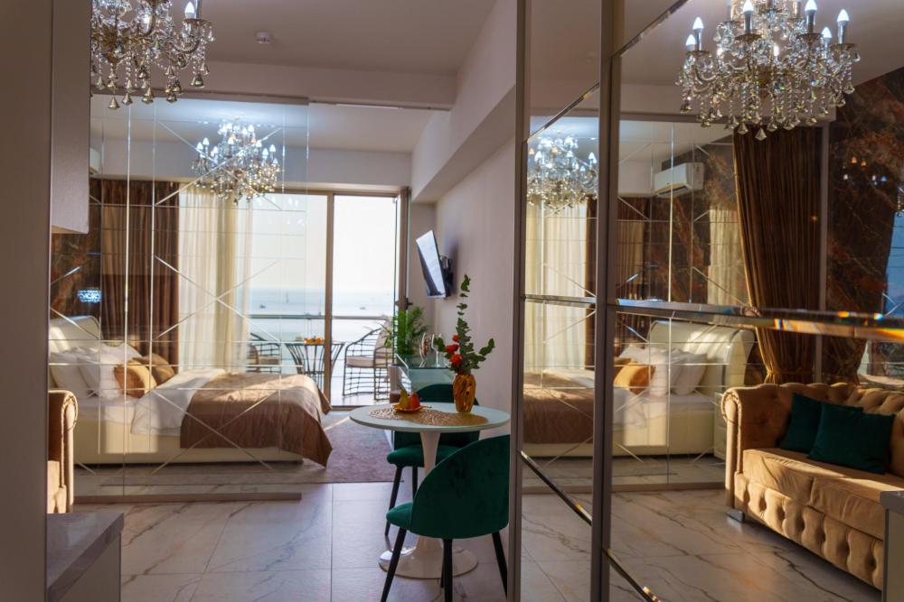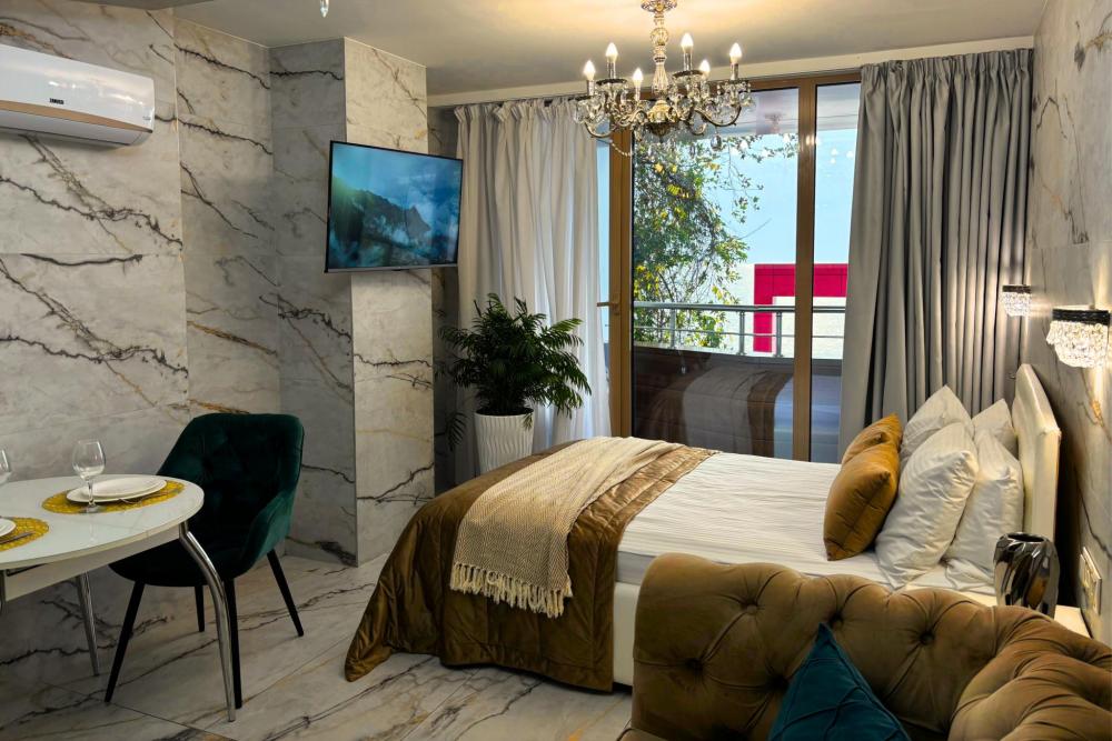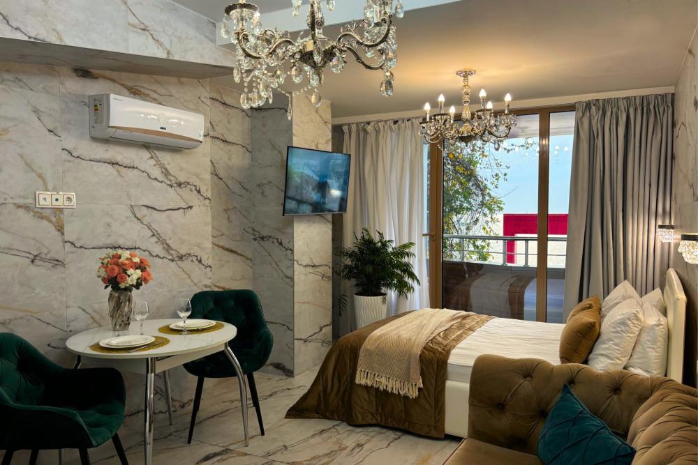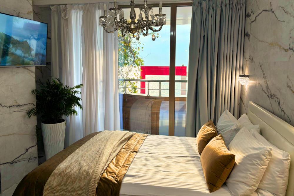 Просторный апартамент 38 кв.м. с изысканным дизайном с элементами арт-деко сочетает в себе лаконичные геометрические формы, благородные материалы и контрастные цветовые решения, создающие атмосферу стильной современности с характерным акцентом на комфортный отдых гостей. Яркие акценты, стекло и хрусталь наполняют интерьер дневном светом, солнечными бликами и усиливают впечатление от морской акварели волн за окном. Интерьер наполнен мягким сиянием и располагает к неспешному отдыху. Эргономичная и продуманная планировка номера позволит любоваться морским горизонтом прямо из кровати или отлично провести вечер в удобной зоне отдыха на балконе с видом на незабываемый закат. На кухне, полностью оснащенной современной бытовой техникой, вы сможете с удовольствием готовить любимые блюда и наслаждаться ими в уютной обеденной зоне. Быстрый Wi-Fi и цифровое телевидение формируют идеальные условия для отдыха или работы, позволяя вам чувствовать себя комфортно и расслабленно в любое время. В апартаментах вас ждёт атмосфера заботы. Мягкие махровые халаты и премиальный текстиль создают ощущение роскоши и комфорта. В ванной комнате вы найдёте всю необходимую косметику, чтобы почувствовать себя как дома. Каждая деталь продумана для вашего идеального отдыха.
