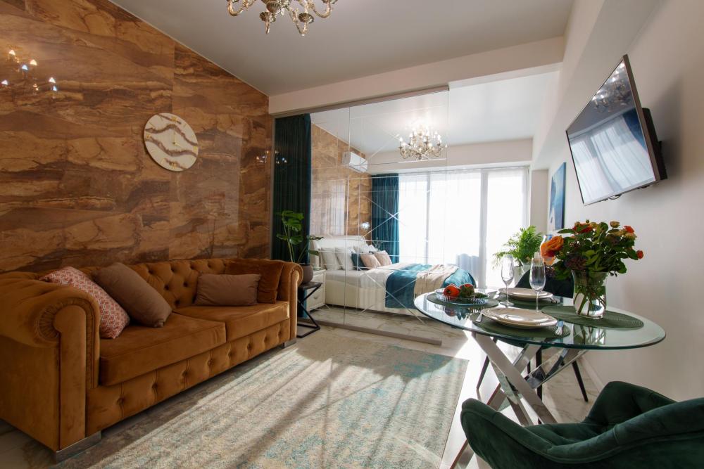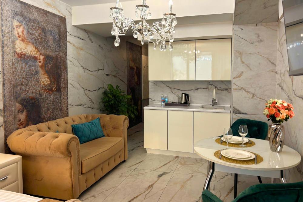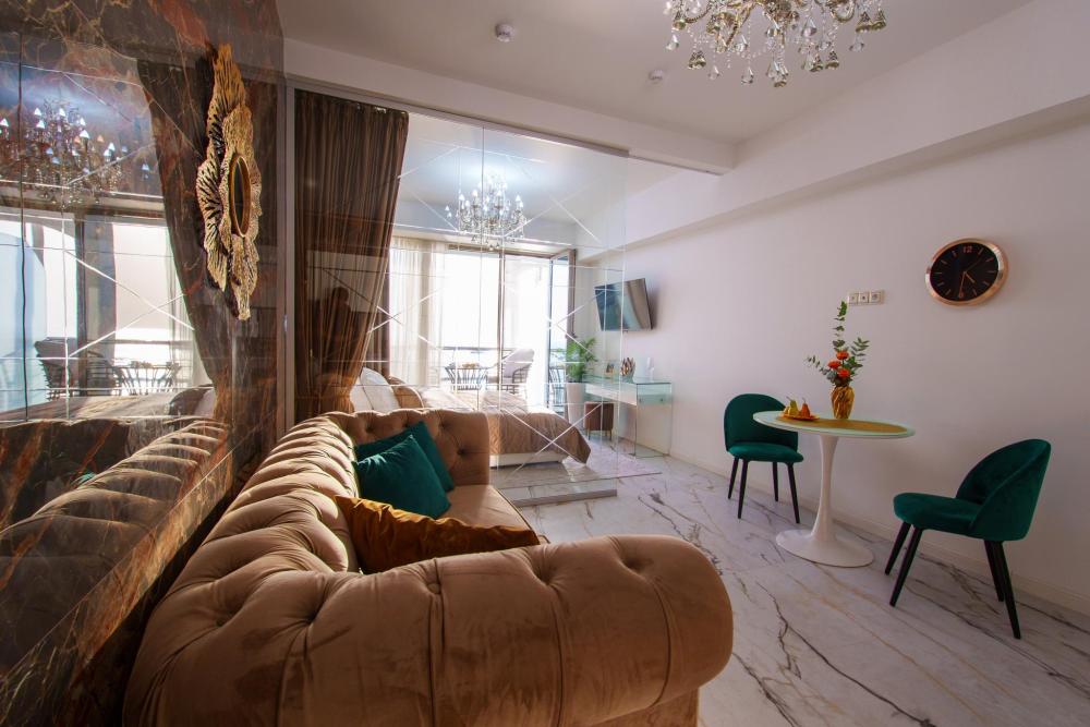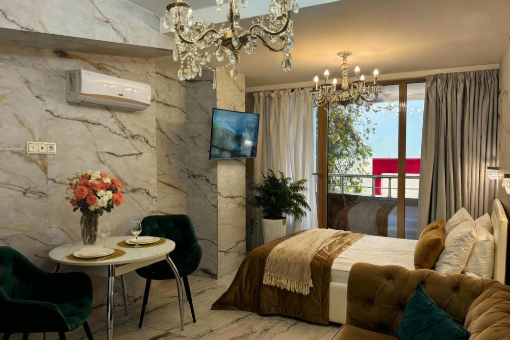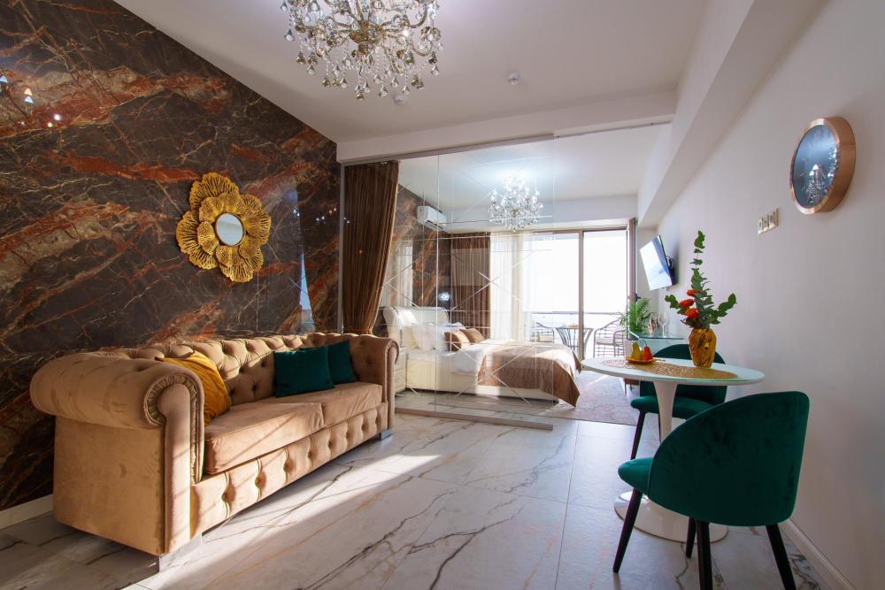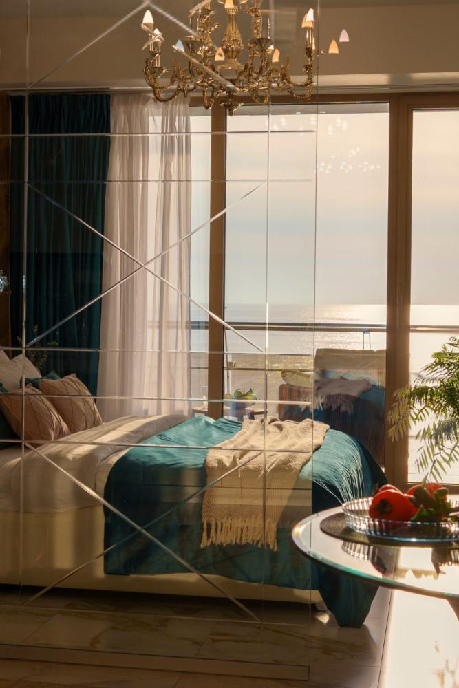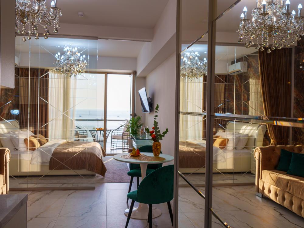 Просторный апартамент 38 кв.м. с изысканным дизайном с элементами арт-деко сочетает в себе лаконичные геометрические формы, благородные материалы и контрастные цветовые решения, создающие атмосферу стильной современности с характерным акцентом на комфортный отдых гостей. Яркие акценты, стекло и хрусталь наполняют интерьер дневном светом, солнечными бликами и усиливают впечатление от морской акварели волн за окном. Интерьер наполнен мягким сиянием и располагает к неспешному отдыху. Эргономичная и продуманная планировка номера позволит любоваться морским горизонтом прямо из кровати или отлично провести вечер в удобной зоне отдыха на балконе с видом на незабываемый закат. На кухне, полностью оснащенной современной бытовой техникой, вы сможете с удовольствием готовить любимые блюда и наслаждаться ими в уютной обеденной зоне. Быстрый Wi-Fi и цифровое телевидение формируют идеальные условия для отдыха или работы, позволяя вам чувствовать себя комфортно и расслабленно в любое время. В апартаментах вас ждёт атмосфера заботы. Мягкие махровые халаты и премиальный текстиль создают ощущение роскоши и комфорта. В ванной комнате вы найдёте всю необходимую косметику, чтобы почувствовать себя как дома. Каждая деталь продумана для вашего идеального отдыха.