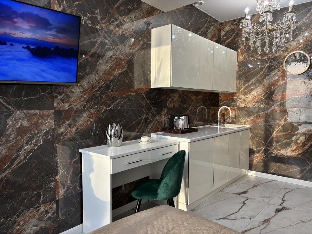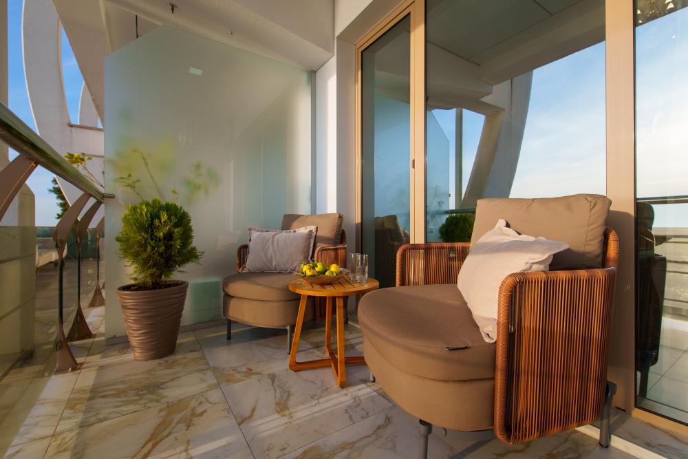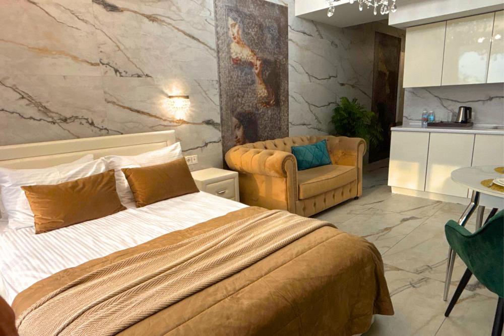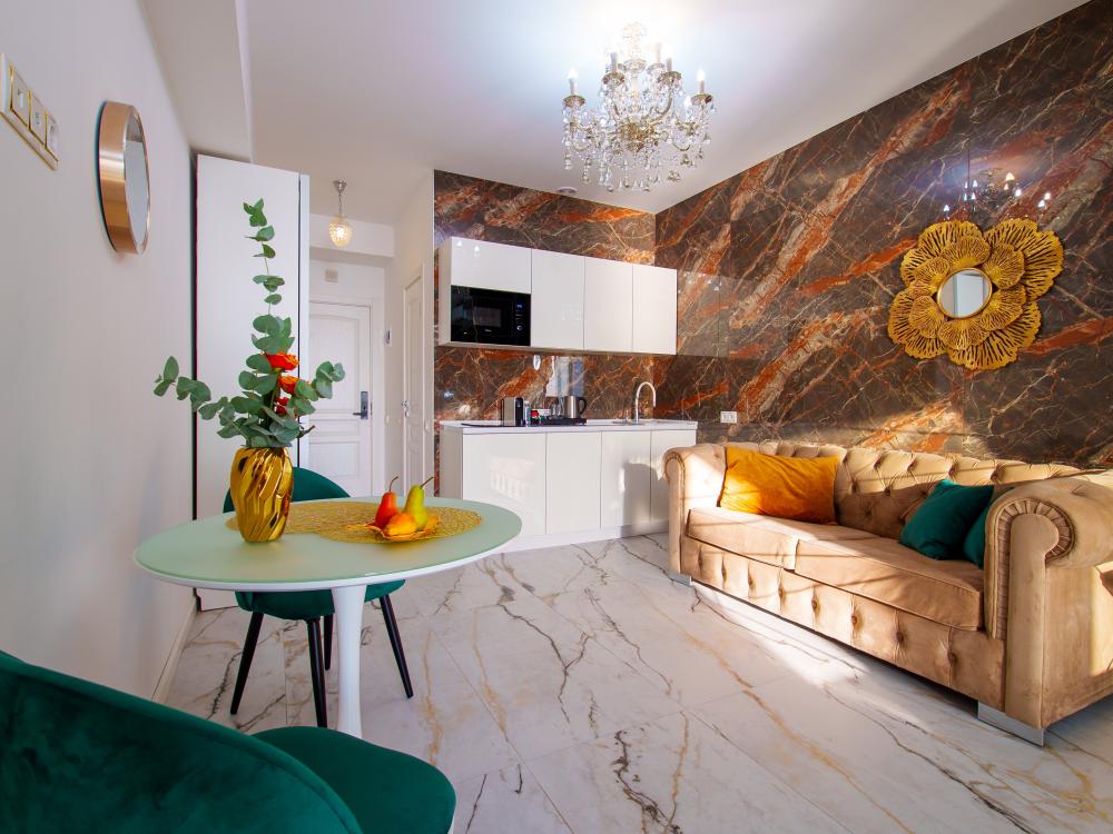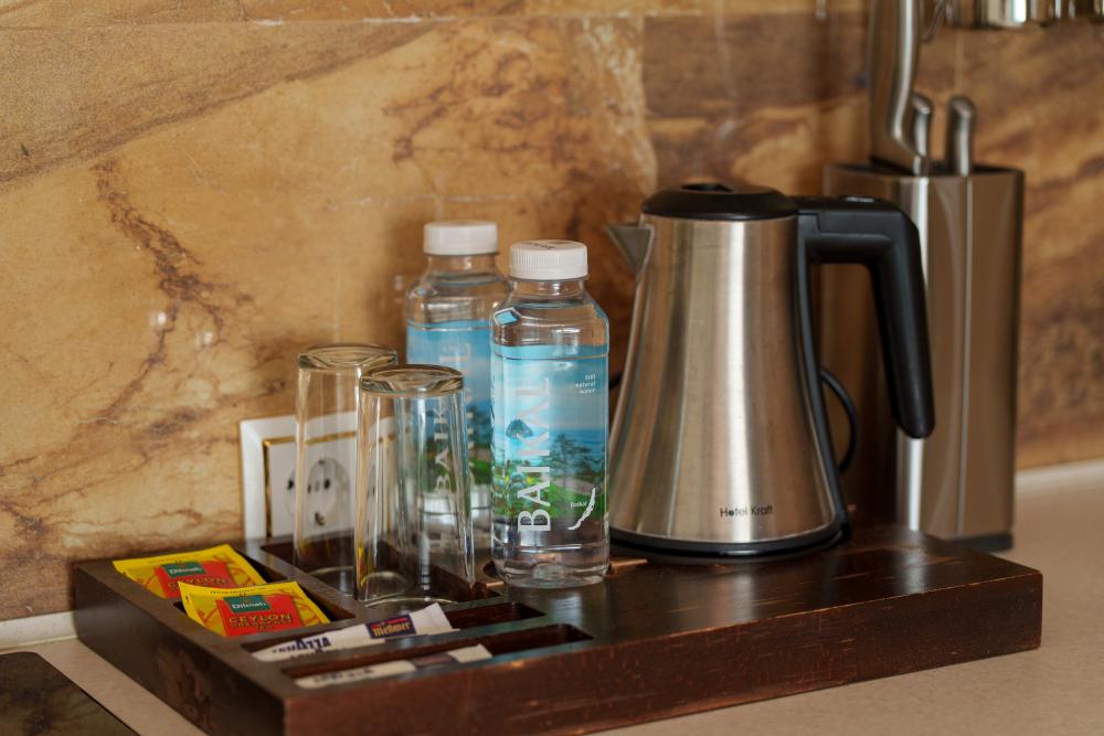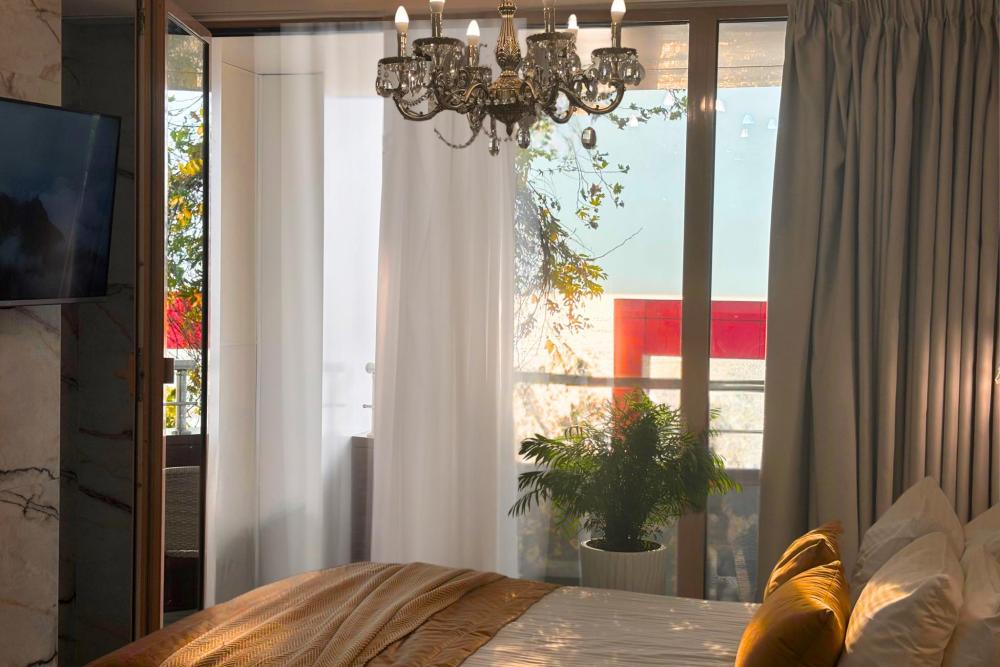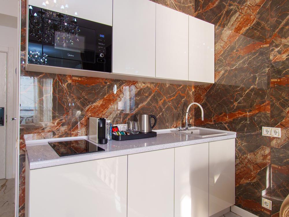 Просторный апартамент 38 кв.м. с изысканным дизайном с элементами арт-деко сочетает в себе лаконичные геометрические формы, благородные материалы и контрастные цветовые решения, создающие атмосферу стильной современности с характерным акцентом на комфортный отдых гостей. Яркие акценты, стекло и хрусталь наполняют интерьер дневном светом, солнечными бликами и усиливают впечатление от морской акварели волн за окном. Интерьер наполнен мягким сиянием и располагает к неспешному отдыху. Эргономичная и продуманная планировка номера позволит любоваться морским горизонтом прямо из кровати или отлично провести вечер в удобной зоне отдыха на балконе с видом на незабываемый закат. На кухне, полностью оснащенной современной бытовой техникой, вы сможете с удовольствием готовить любимые блюда и наслаждаться ими в уютной обеденной зоне. Быстрый Wi-Fi и цифровое телевидение формируют идеальные условия для отдыха или работы, позволяя вам чувствовать себя комфортно и расслабленно в любое время. В апартаментах вас ждёт атмосфера заботы. Мягкие махровые халаты и премиальный текстиль создают ощущение роскоши и комфорта. В ванной комнате вы найдёте всю необходимую косметику, чтобы почувствовать себя как дома. Каждая деталь продумана для вашего идеального отдыха.