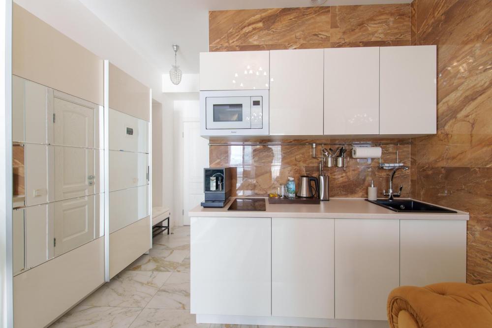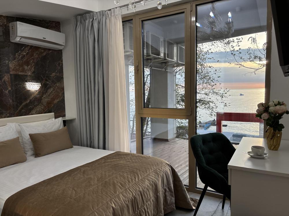 Апартаменты с видом на море рассчитаны на 2 гостей - Вас ждет двуспальная кровать King Size с ортопедическим матрасом. Рады семьям с детьми, по запросу предоставляется детская кроватка для малышей до года. Есть кухня, большой холодильник, электрический чайник, вся необходимая посуда. А также есть возможность заказать обслуживание в номер или посетить прекрасные рестораны и кафе, расположенные в паре минут от комплекса. Для удобства проживания номер оборудован гладильными принадлежностями и сушилкой для белья. Отличный телевизор, быстрый вайфай позволят вам и отдохнуть, и поработать при необходимости. Ванная комната оснащена душевой кабиной, теплым полом, снабжена всеми необходимыми косметическими средствами.
