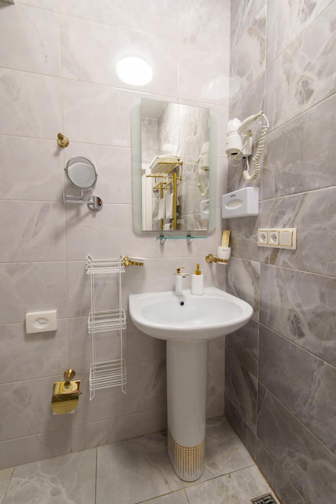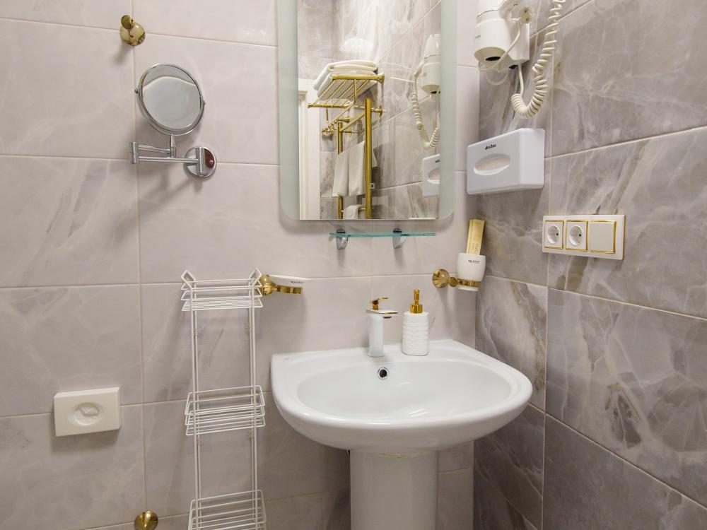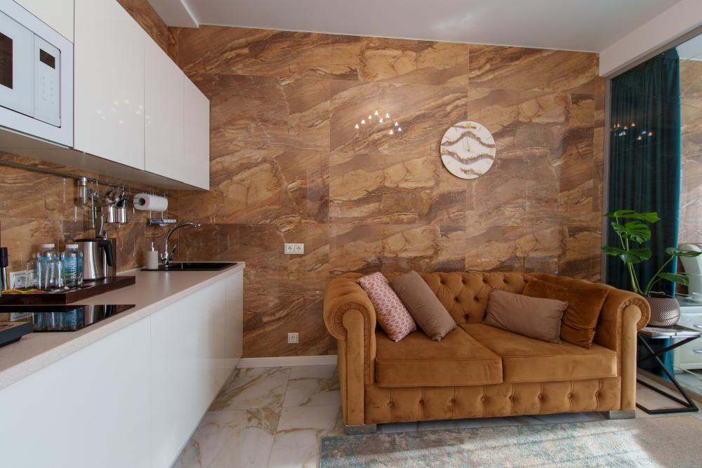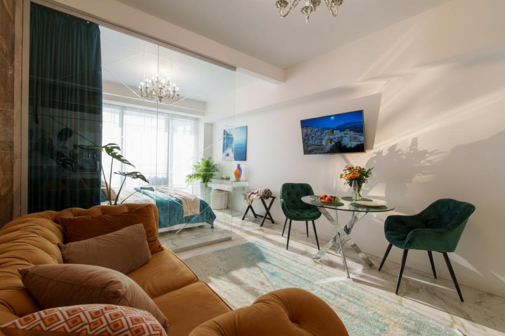 Апартаменты рассчитаны на 3 гостей- Вас ждут двуспальная кровать King Size в спальне и удобный раскладной диван в зоне гостиной. Рады семьям с детьми, по запросу предоставляется детская кроватка для малышей до года. Есть кухня, большой холодильник, микроволновая печь, вся необходимая посуда, для тех, кто любит есть то, что приготовлено своими руками. А также есть возможность заказать обслуживание в номер или посетить прекрасные рестораны и кафе, расположенные в паре минут от комплекса. Для удобства проживания апартаменты оснащены гладильными принадлежностями. Отличный телевизор, быстрый вайфай позволят вам и отдохнуть, и поработать при необходимости. Ванная комната оснащена душевой кабиной, теплым полом, снабжена всеми необходимыми косметическими средствами.