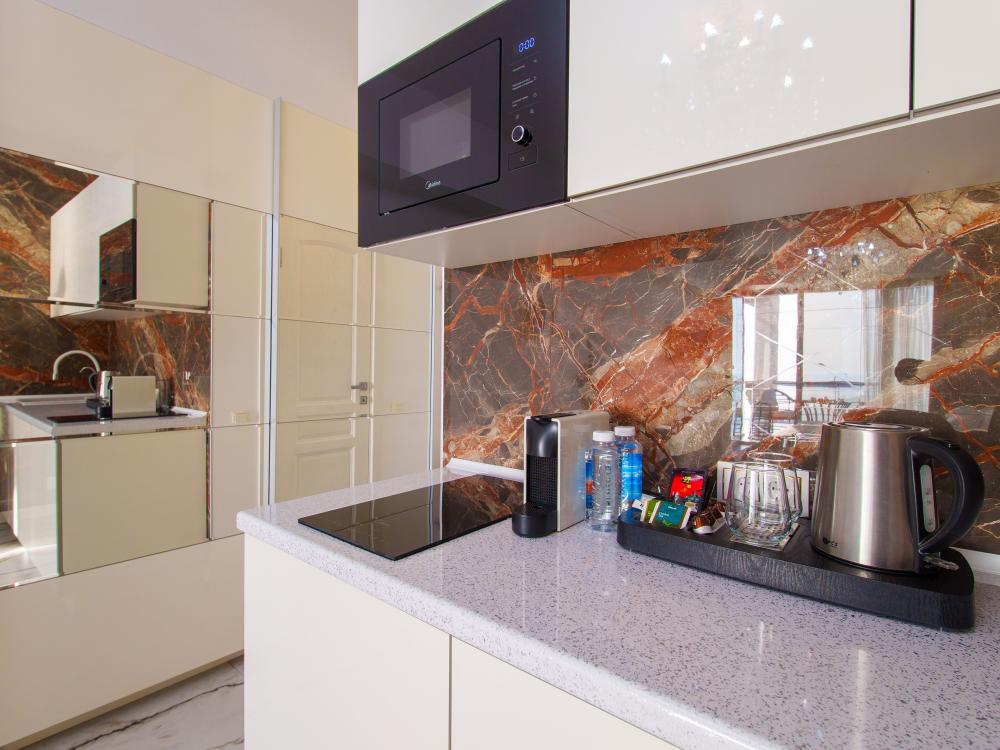Апартаменты рассчитаны на 4 гостей. Вас ждут двуспальная кровать в спальне и большой удобный раскладной диван в зоне гостиной. Рады семьям с детьми, по запросу предоставляется детская кроватка для малышей. Есть кухня, большой холодильник, микроволновая печь, вся необходимая посуда, для тех, кто любит есть то, что приготовлено своими руками. А также есть возможность заказать обслуживание в номер или посетить прекрасные рестораны и кафе, расположенные в паре минут от комплекса. Стиральная машинка для удобства проживания, гладильные принадлежности. Отличный телевизор, быстрый Wi-Fi позволят вам и отдохнуть, и поработать при необходимости. Ванная комната оснащена душевой кабиной, снабжена всеми необходимыми косметическими средствами. На просторной террасе Вы можете выпить утренний кофе и насладиться шикарным видом на море. Возможно бесконтактное заселение гостей.