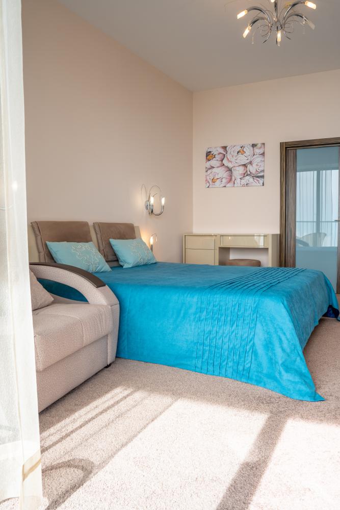 Квартира в ЖК «Актер Гэлакси» с двумя спальнями, просторной кухней-гостиной, террасой и гардеробной. Из квартиры открывается вид на море. В квартире есть все необходимое для проживания. На кухне есть: посуда, приборы, чайник, плита, духовой шкаф, посудомоечная машина, холодильник. В спальнях: постельное белье 6 комплектов, полотенца на 6 человек; в гардеробной: пылесос, гладильная доска, утюг, приборы для уборки. ЖК «Актер Гэлакси» - это элитный комплекс с закрытой, охраняемой территорией. На территории два ресторана, кафе, минимаркет, салон красоты, барбершоп, спа-салон, бассейн открытый (сезонный, работает с мая по октябрь) с зонтиками, шезлонгами, детская площадка, спортивная площадка, сад с реликтовыми деревьями. Для жильцов комплекса действует благоустроенный пляж санатория Актер, на пляже работает ресторан.⚠️ Дополнительно: Оплачивается клининг в размере 6 000 рублей.