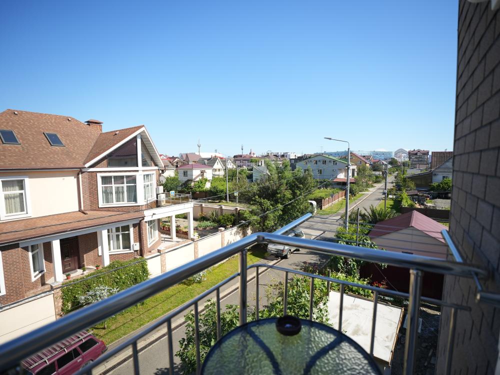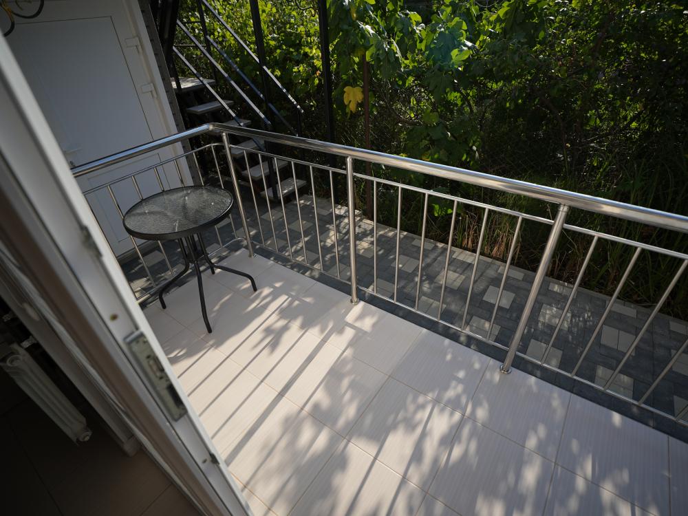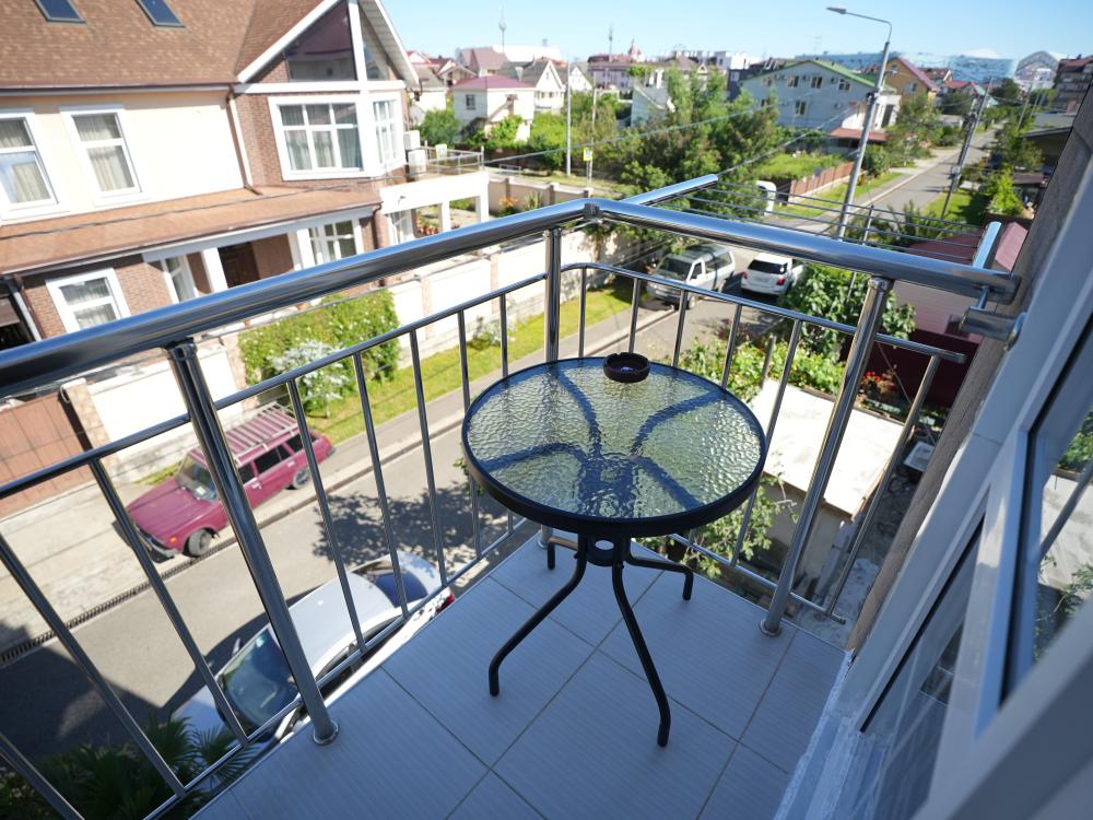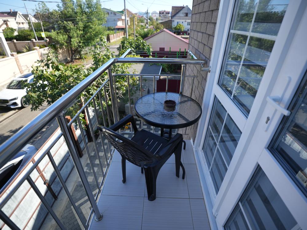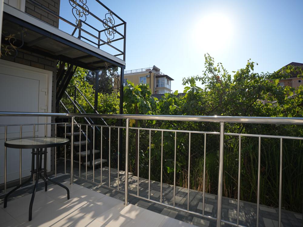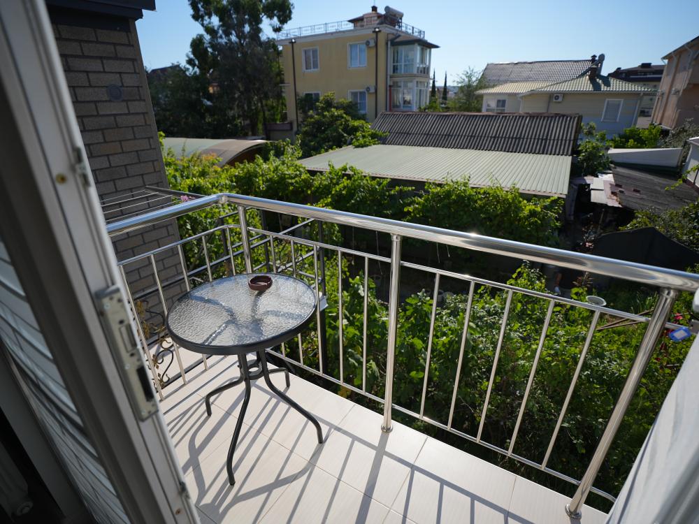 Данный номер находится на третьем этаже. Новая мебель, диваны, кровати, кондиционер, ортопедические матрасы, свежее постельное белье, полотенца, утюг, фен, бесплатный Wi-Fi, телевизор, микроволновая печь, холодильник. В каждом гостевом номере есть мини-кухня, где можно приготовить себе еду самостоятельно. После, можно разместиться на своем балконе за удобным столиком, с видом на зеленый сад и горы.