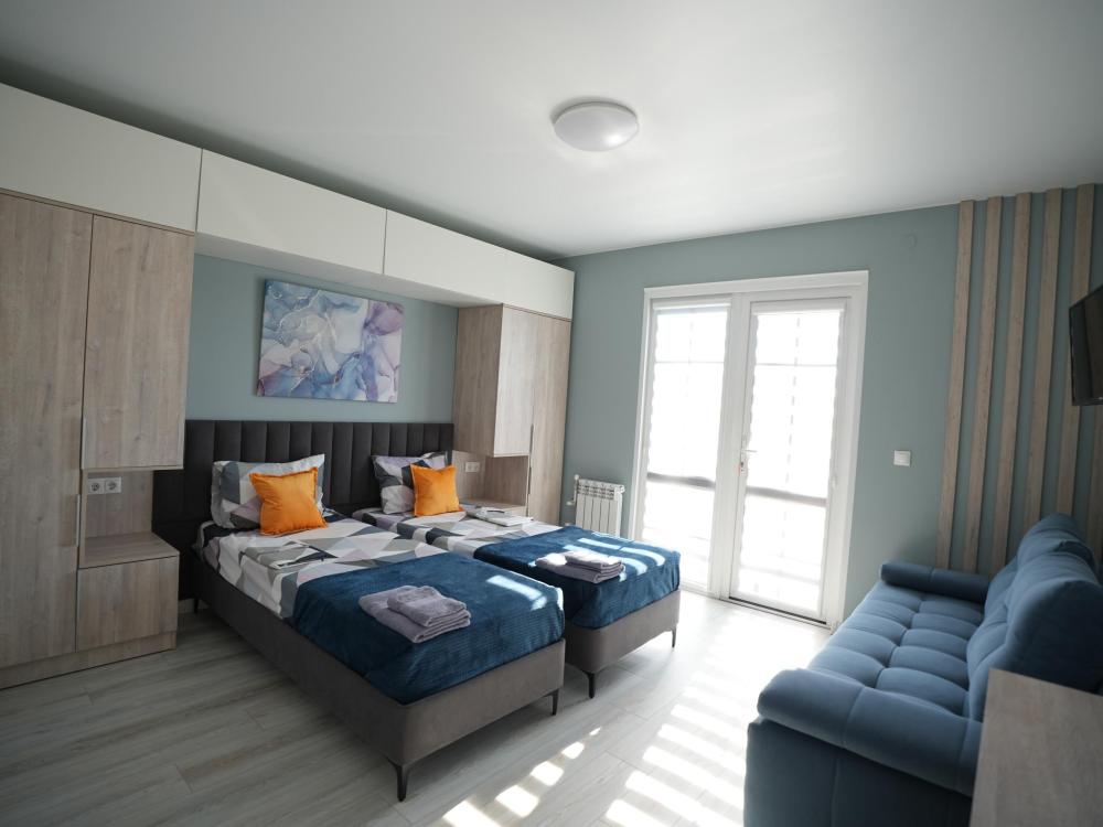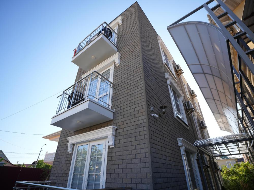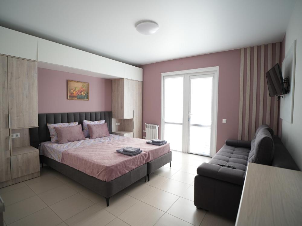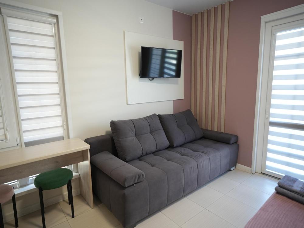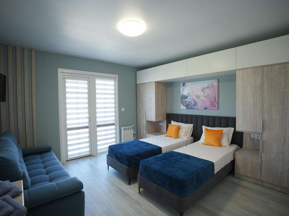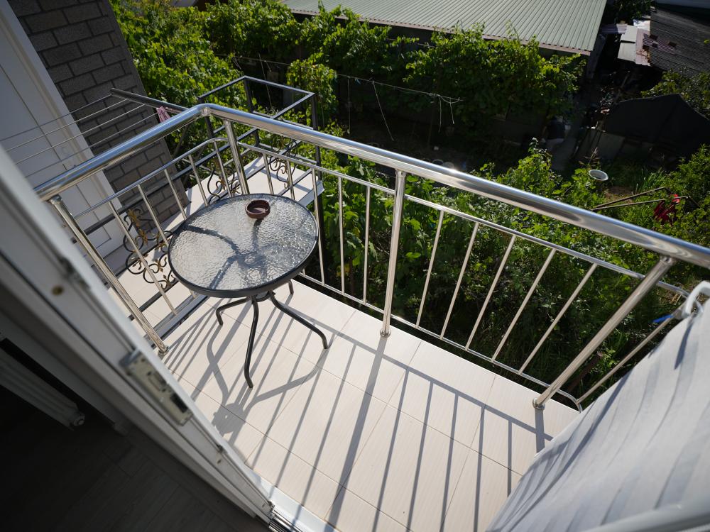 Данный номер находится на третьем этаже. Новая мебель, диваны, кровати, кондиционер, ортопедические матрасы, свежее постельное белье, полотенца, утюг, фен, бесплатный Wi-Fi, телевизор, микроволновая печь, холодильник. В каждом гостевом номере есть мини-кухня, где можно приготовить себе еду самостоятельно. После, можно разместиться на своем балконе за удобным столиком, с видом на зеленый сад и горы.