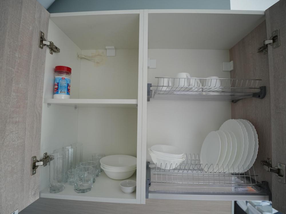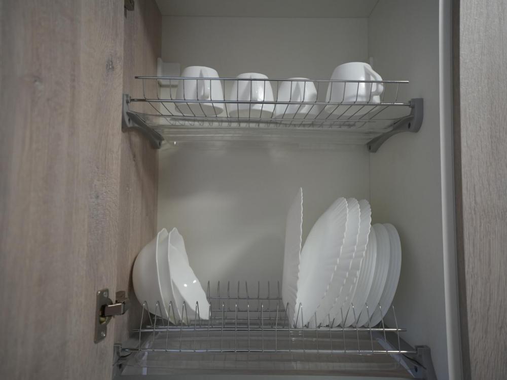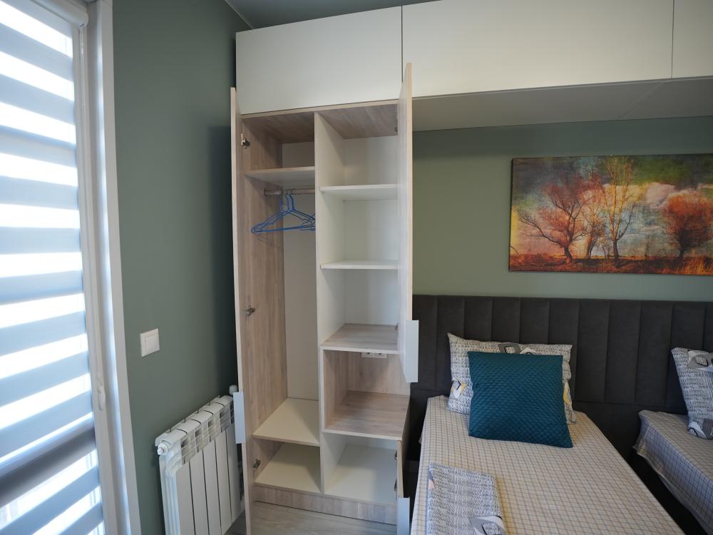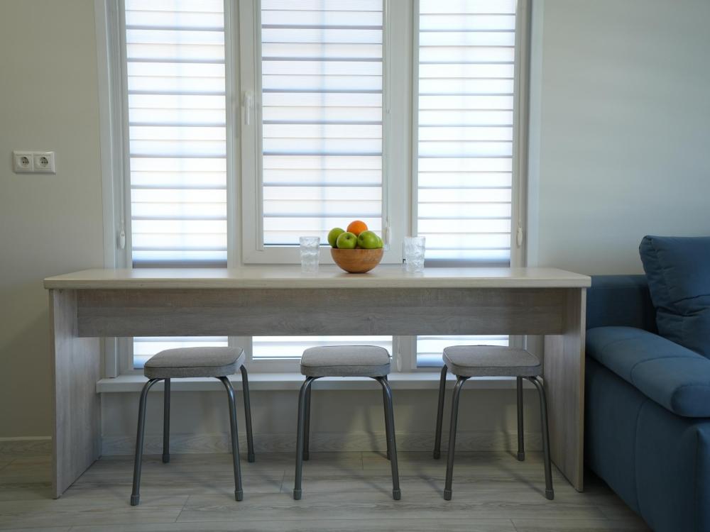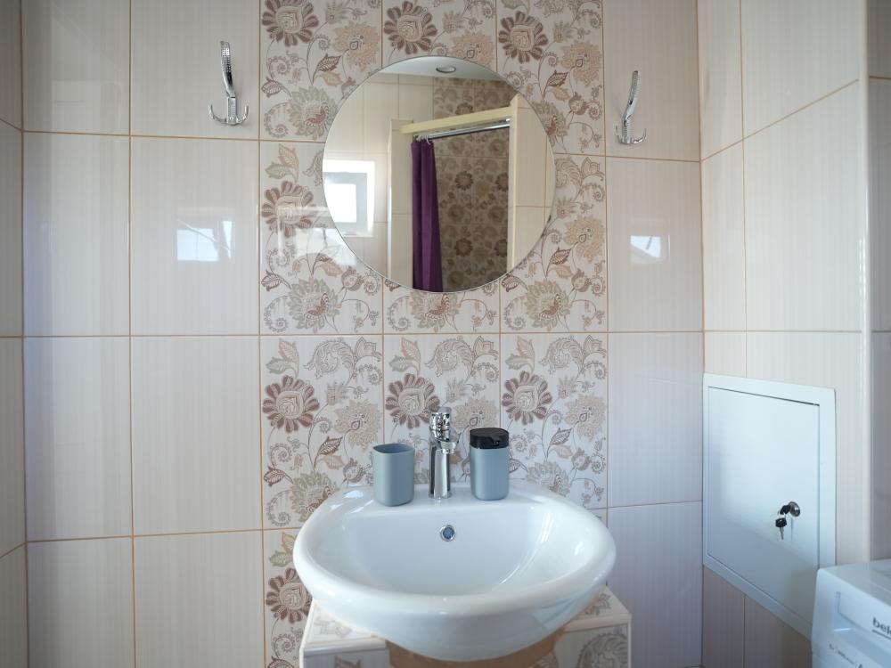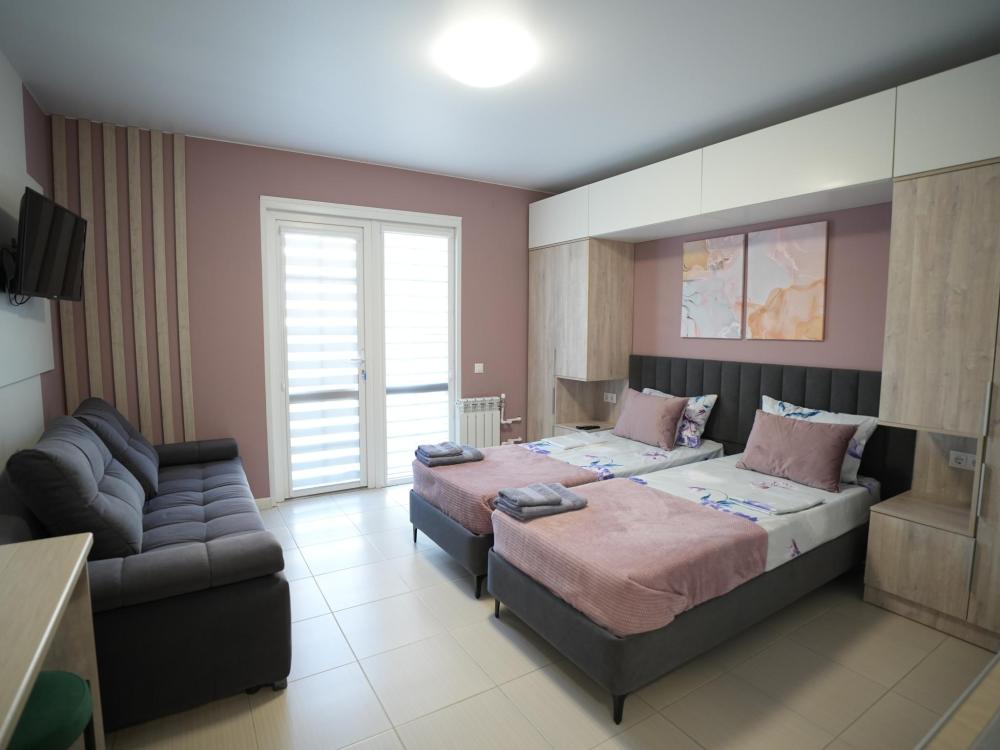 Данный номер находится на третьем этаже. Новая мебель, диваны, кровати, кондиционер, ортопедические матрасы, свежее постельное белье, полотенца, утюг, фен, бесплатный Wi-Fi, телевизор, микроволновая печь, холодильник. В каждом гостевом номере есть мини-кухня, где можно приготовить себе еду самостоятельно. После, можно разместиться на своем балконе за удобным столиком, с видом на зеленый сад и горы.