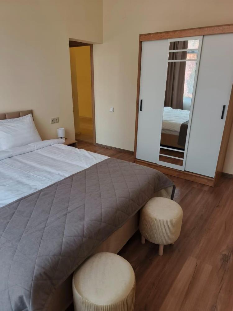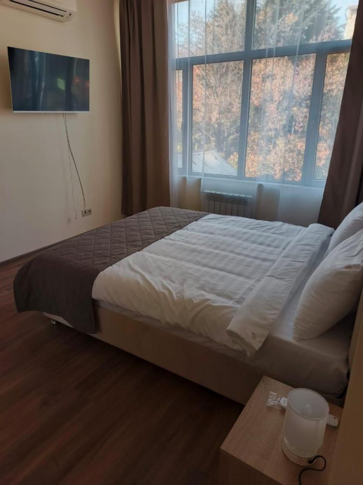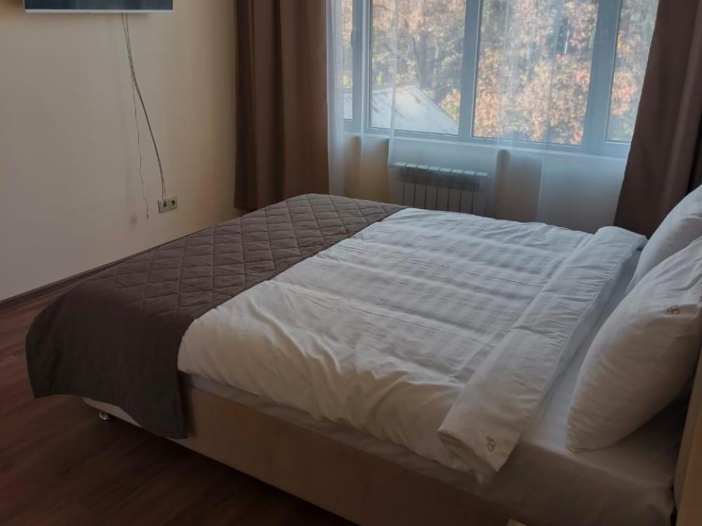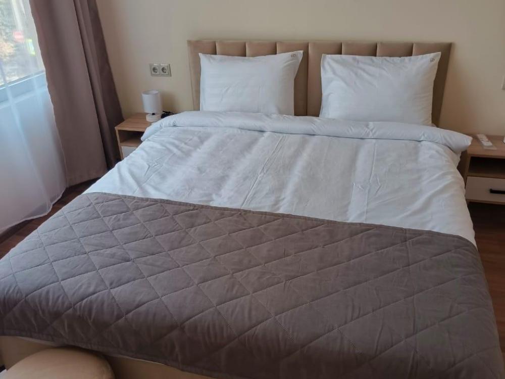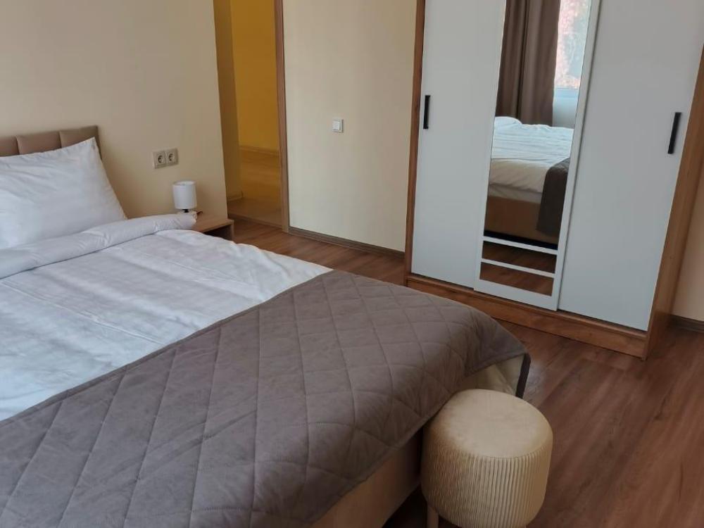 Апартамент двухкомнатный площадью 60 кв.м с видом на город. Подходит для размещения 6 человек (4 основных места и 2 дополнительных). Имеет спальню с приятным интерьером. В номере: 1 двуспальная кровать, 1 двуспальный диван, телевизор, кондиционер, отопление, фен, шкаф, вешалка, посуда, столовые приборы, холодильник, микроволновая печь, электрический чайник, электрическая плита, обеденный стол, туалетный столик, стулья. Индивидуальная ванная комната: душ, раковина, туалет. В стоимость входит: постельное бельё, полотенца, халат, тапочки, ванные принадлежности (шампунь, гель для душа, мыло, зубной набор). WI-Fi бесплатно на всей территории.