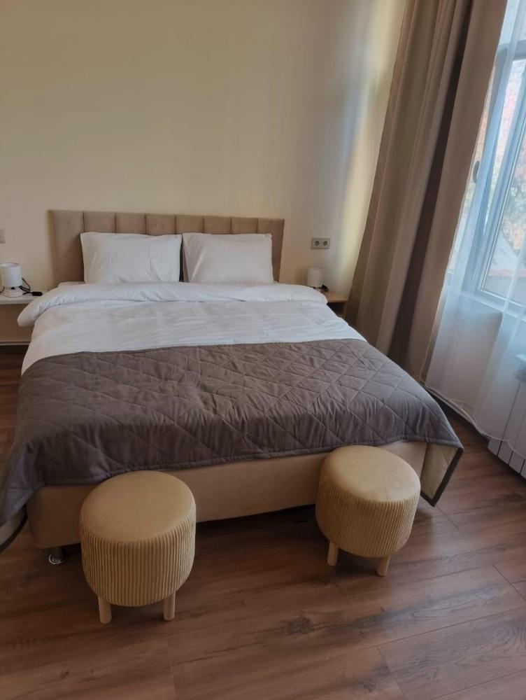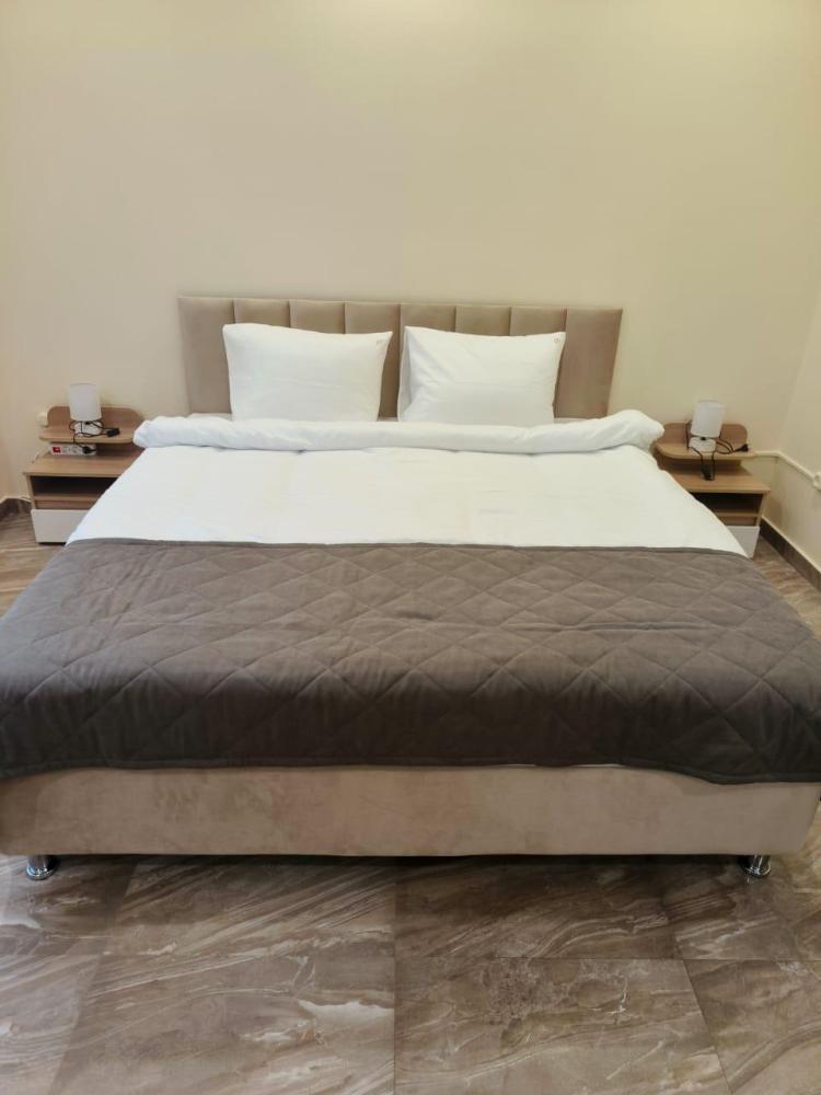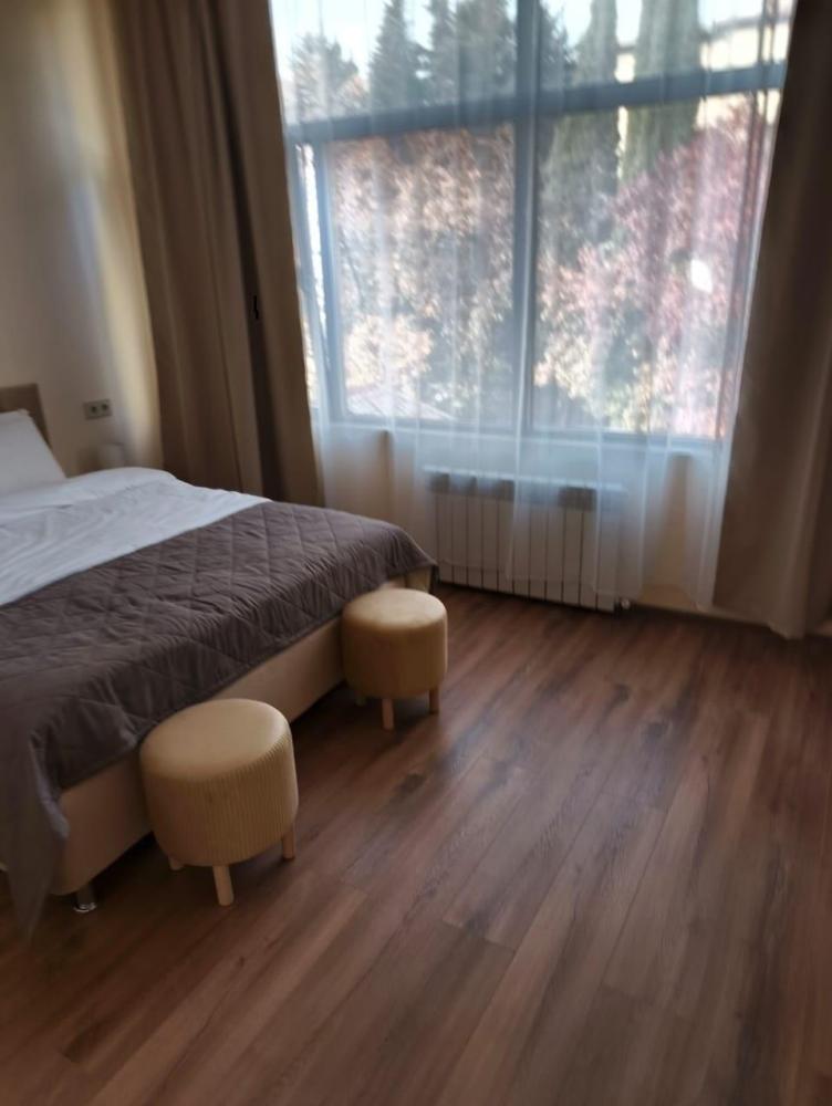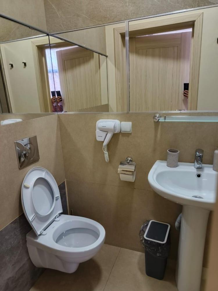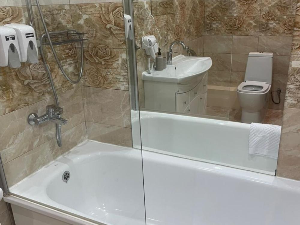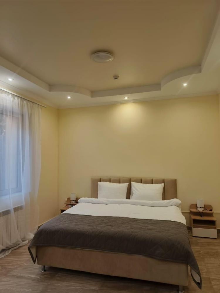 Апартамент двухкомнатный площадью 60 кв.м с видом на город. Подходит для размещения 6 человек (4 основных места и 2 дополнительных). Имеет спальню с приятным интерьером. В номере: 1 двуспальная кровать, 1 двуспальный диван, телевизор, кондиционер, отопление, фен, шкаф, вешалка, посуда, столовые приборы, холодильник, микроволновая печь, электрический чайник, электрическая плита, обеденный стол, туалетный столик, стулья. Индивидуальная ванная комната: душ, раковина, туалет. В стоимость входит: постельное бельё, полотенца, халат, тапочки, ванные принадлежности (шампунь, гель для душа, мыло, зубной набор). WI-Fi бесплатно на всей территории.