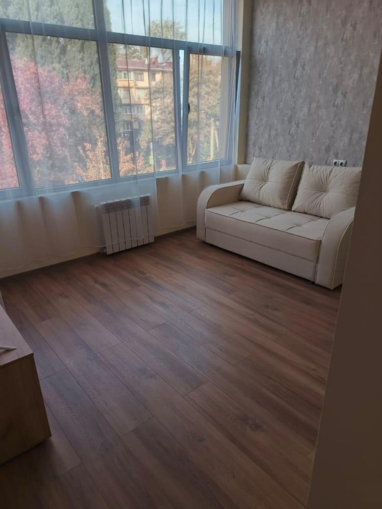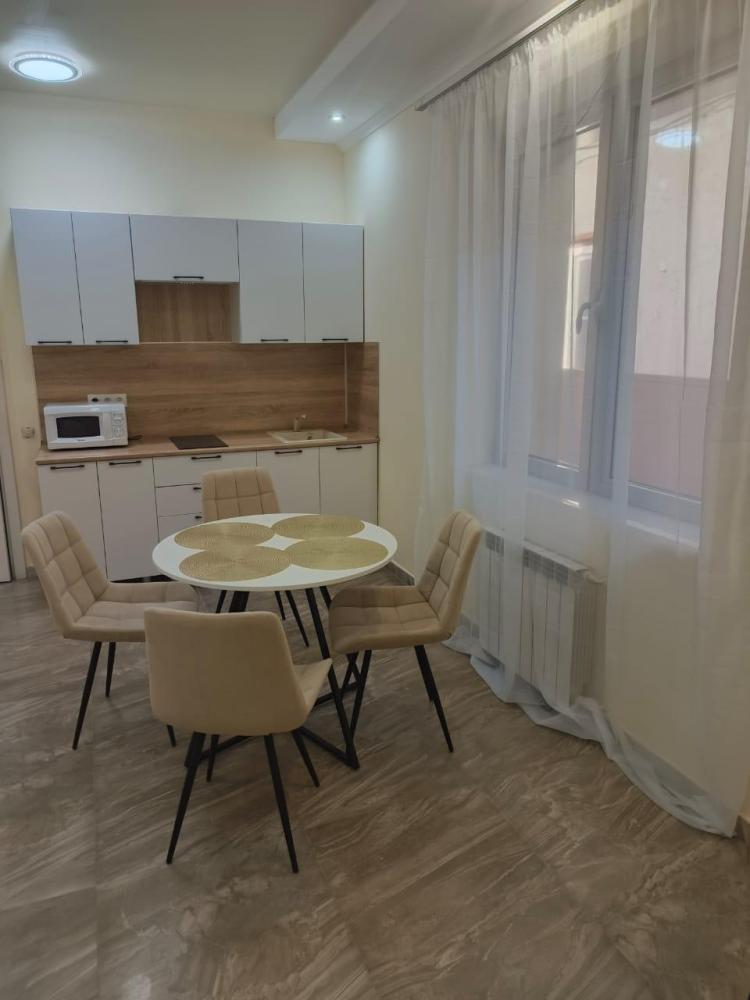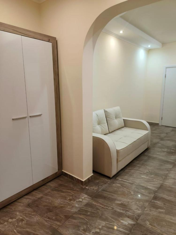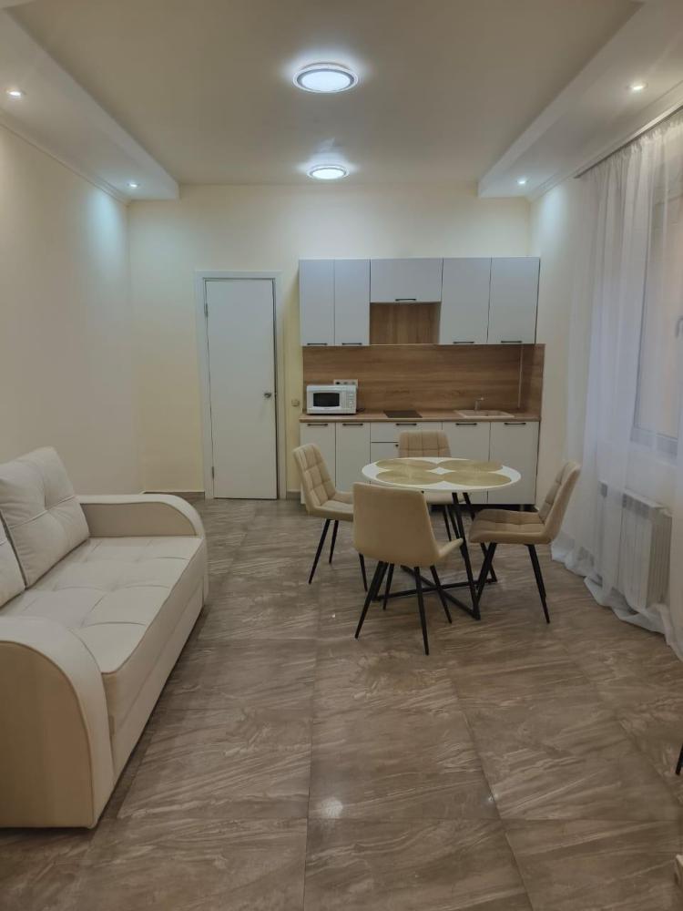 Апартамент студио площадью 49 кв.м с видом на город. Подходит для размещения 5 человек (4 основных места и 1 дополнительное). Имеет спальню с приятным интерьером. В номере: 1 двуспальная кровать, 1 двуспальный диван, 1 кресло-кровать, телевизор, кондиционер, отопление, фен, шкаф, вешалка, кухня, посуда, столовые приборы, холодильник, микроволновая печь, электрический чайник, электрическая плита, обеденный стол, туалетный столик, стулья. Индивидуальная ванная комната: душ, раковина, туалет. В стоимость входит: постельное бельё, полотенца, халат, тапочки, ванные принадлежности (шампунь, гель для душа, мыло, зубной набор). WI-Fi бесплатно на всей территории.