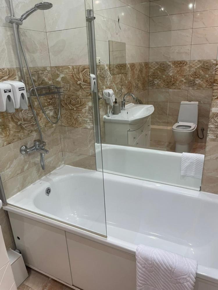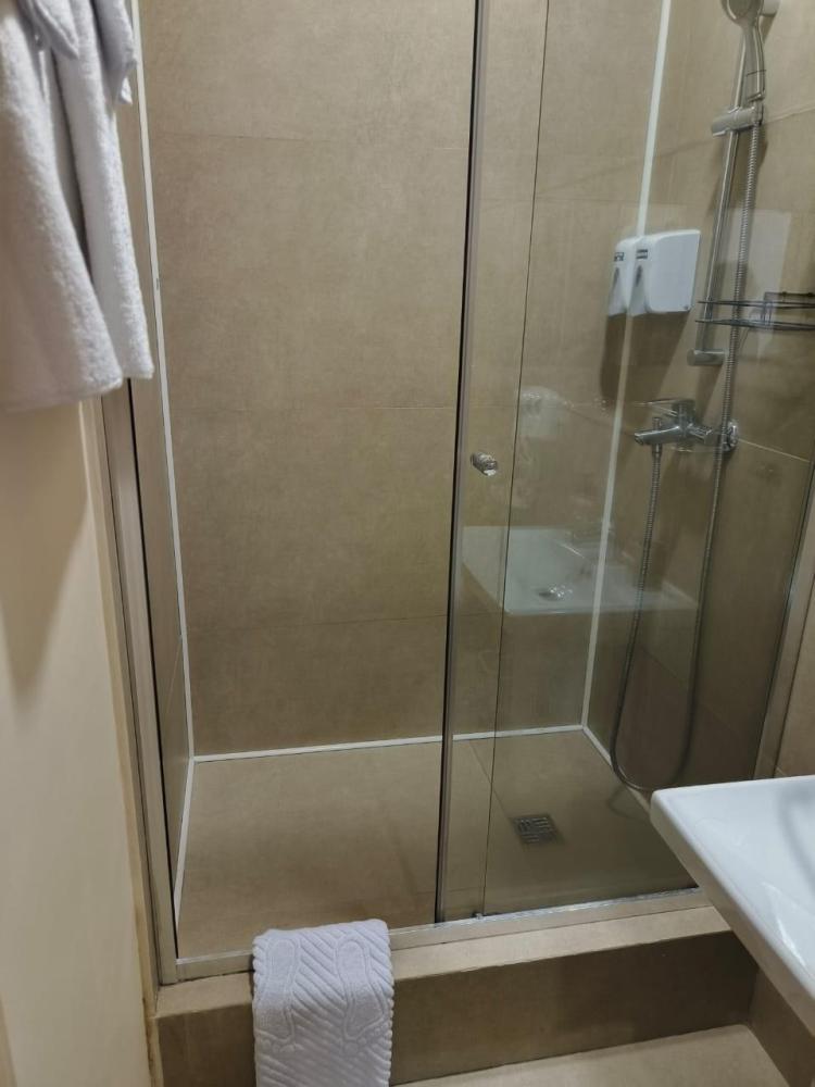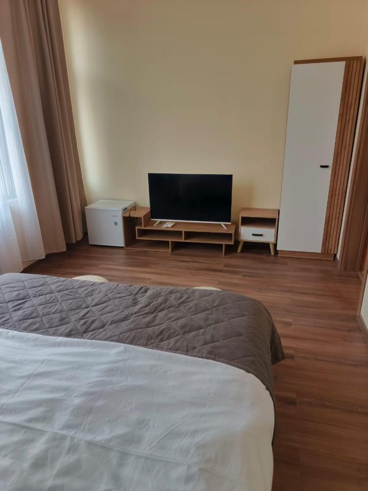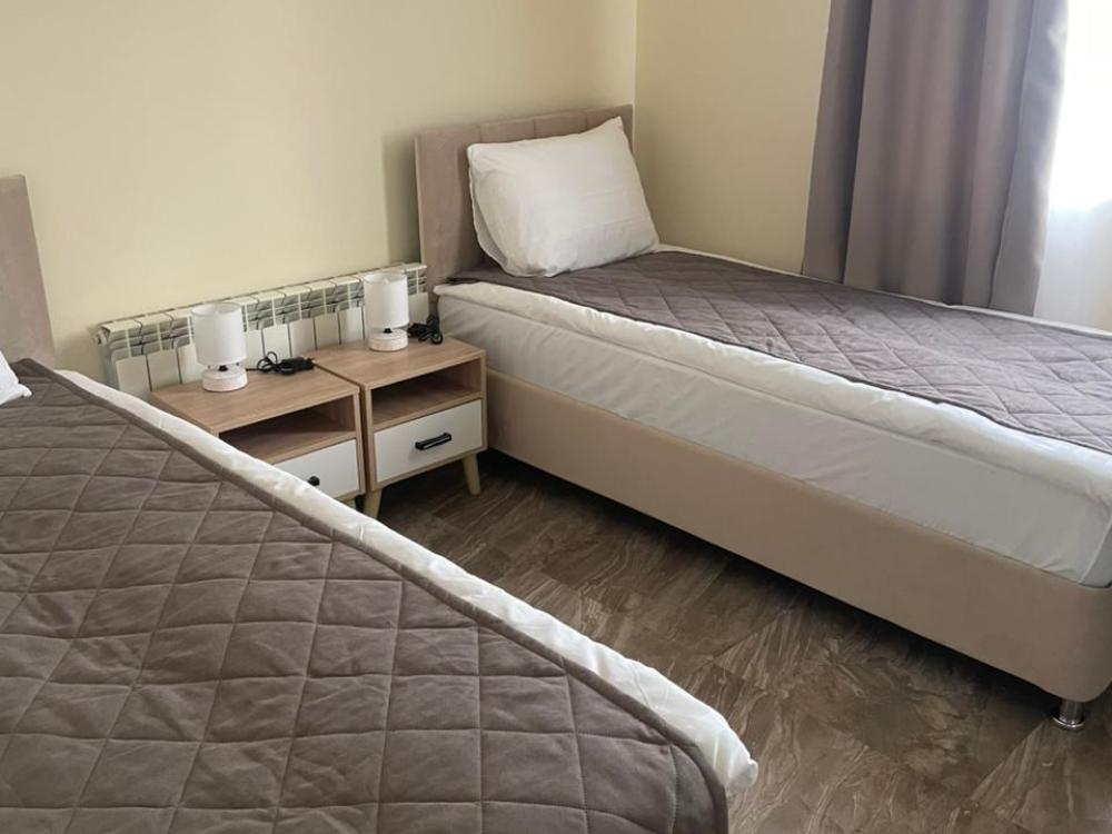 Семейная двухкомнатная комната площадью 49 кв.м с видом на город. Подходит для размещения 5 человек (4 основных места и 1 дополнительное) Оснащение: 1 двуспальная кровать, 1 двуспальный диван, телевизор, кондиционер, отопление, шкаф, вешалка, холодильник, фен, туалетный столик, стулья. Индивидуальная ванная комната: душ, раковина, туалет. В стоимость входит: постельное бельё, полотенца, халат, тапочки, ванные принадлежности (шампунь, гель для душа, мыло, зубной набор). WI-Fi бесплатно на всей территории.