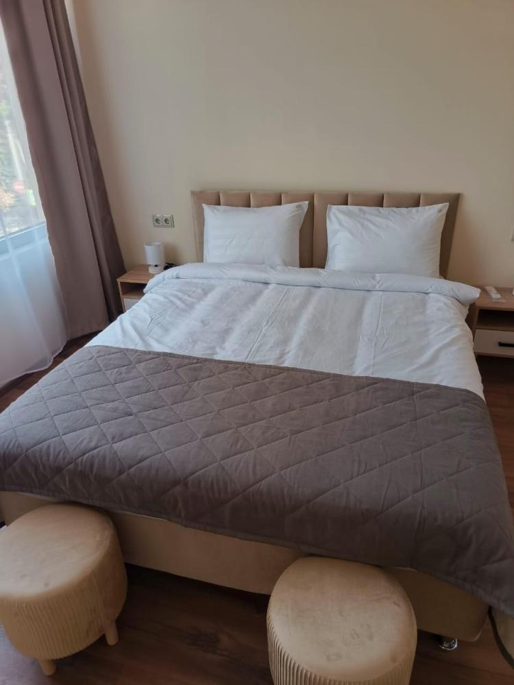Двухместная стандартная комната площадью 29 кв.м с видом на город. Подходит для размещения 3 человек (2 основных места и 1 дополнительное). Оснащение: 1 двуспальная кровать, телевизор, кондиционер, отопление, шкаф, вешалка, холодильник, фен, туалетный столик, стулья, ванна или душ, раковина, туалет. В стоимость входит: постельное бельё, полотенца, халат, тапочки, ванные принадлежности (шампунь, гель для душа, мыло, зубной набор). WI-Fi бесплатно на всей территории.