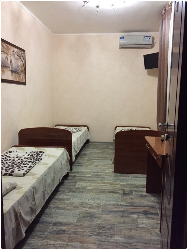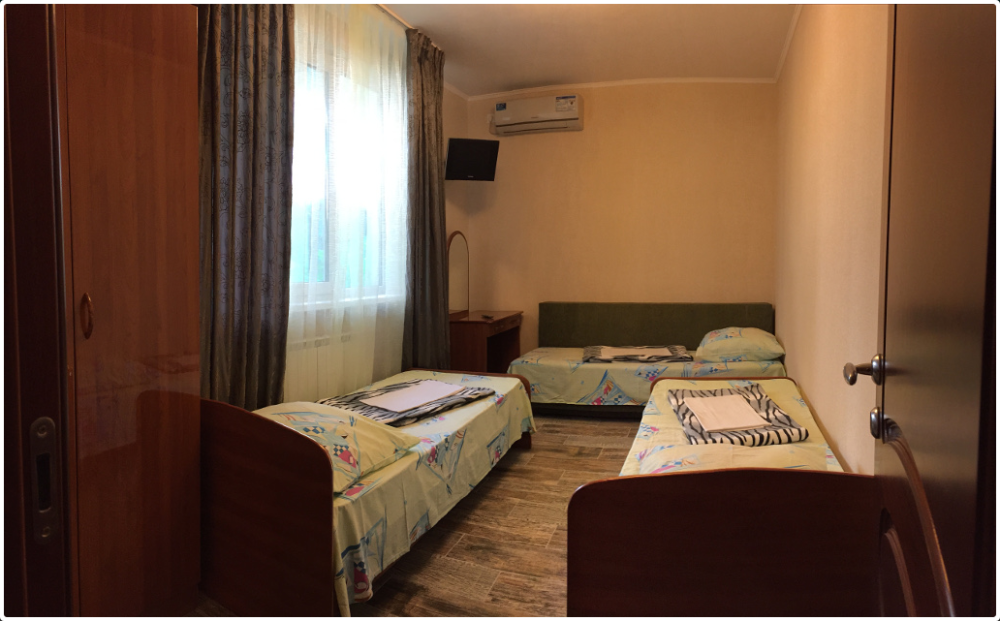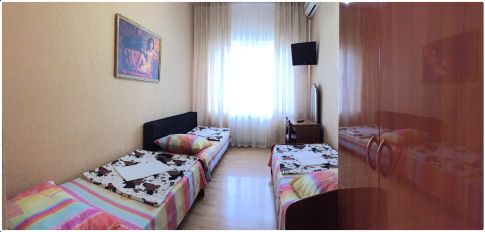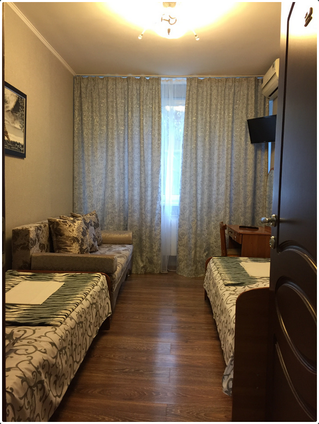 Уютная комната 20 кв.м. с односпальными кроватями и раскладным диваном, удобства на этаже, в комнате телевизор, шкаф, стол, кондиционер, интернет (Wi-Fi) с видом во внутренний двор.