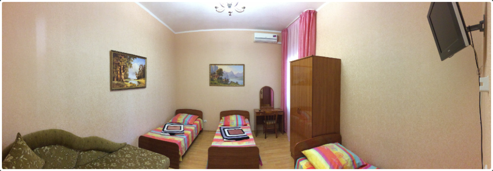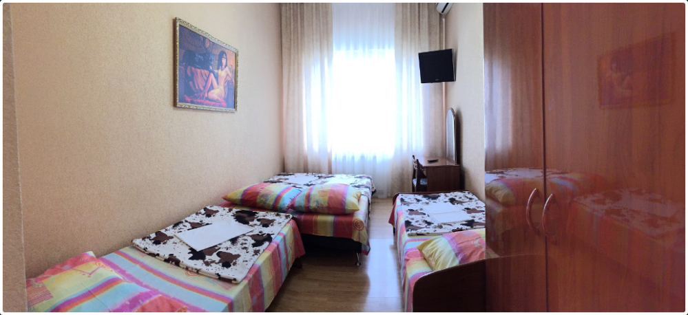 Уютная команата 23 кв.м. с двуспальной кроватью и раскладным диваном, располагающий всем необходимым для комфортного проживания небольшой семьи. В комнате санузел (туалет, душевая кабинка), фен, телевизор, электрочайник, стаканы, шкаф, стол, кондиционер, холодильник, интернет (Wi-Fi) с видом во внутренний двор.