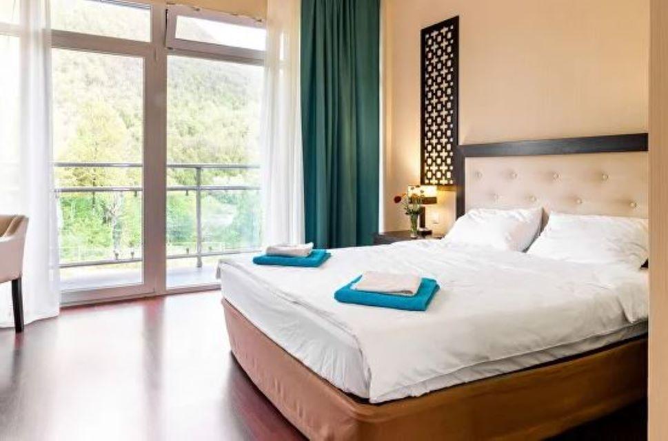 Просторный номер площадью от 26кв.м с панорамным остеклением, балконом и видом на горы. Отличный вариант для семьи с ребенком или небольшой компании до 3 человек.