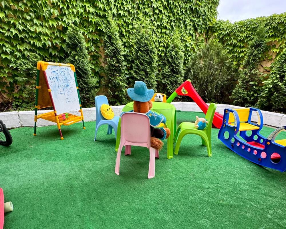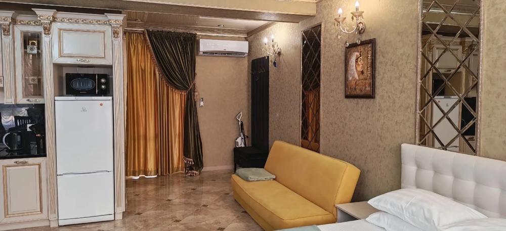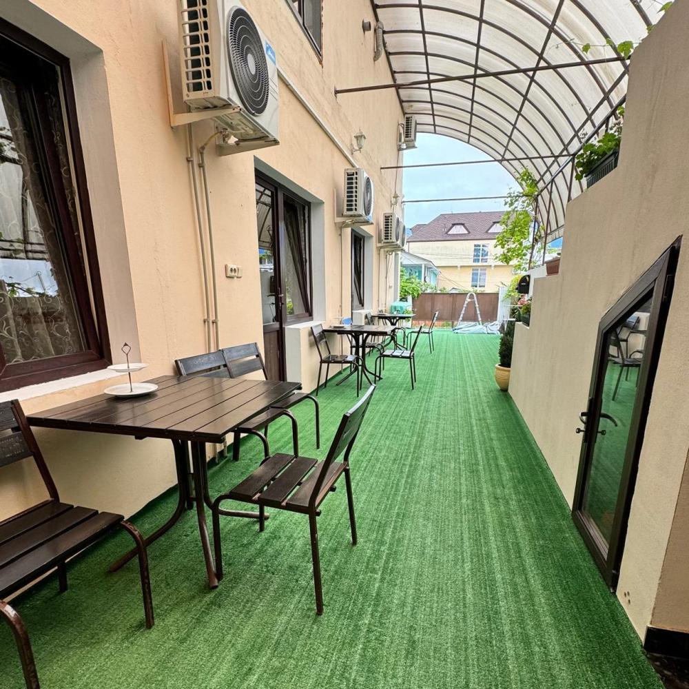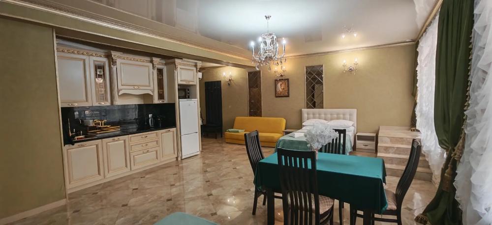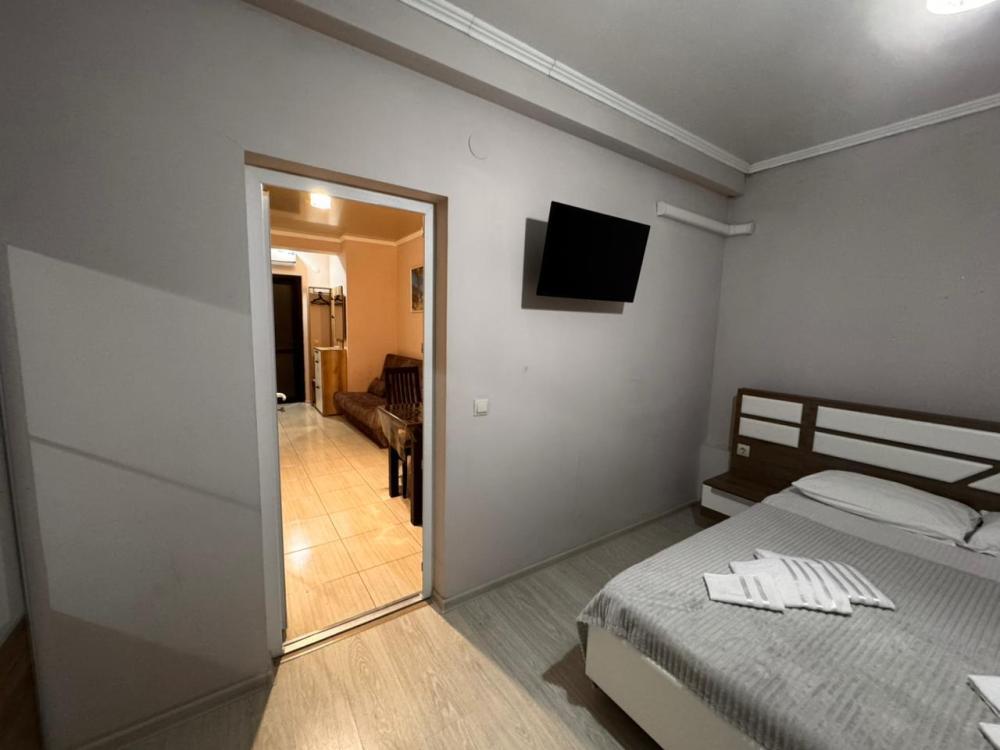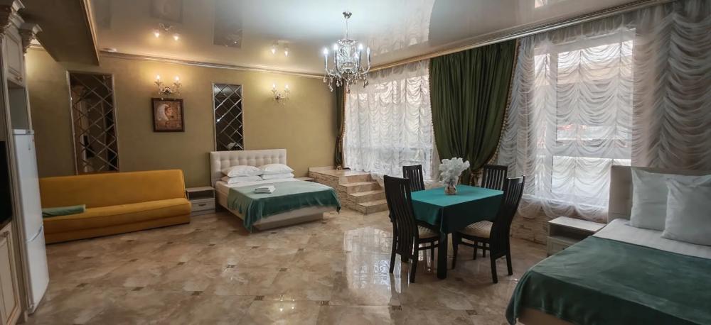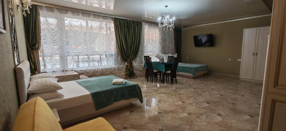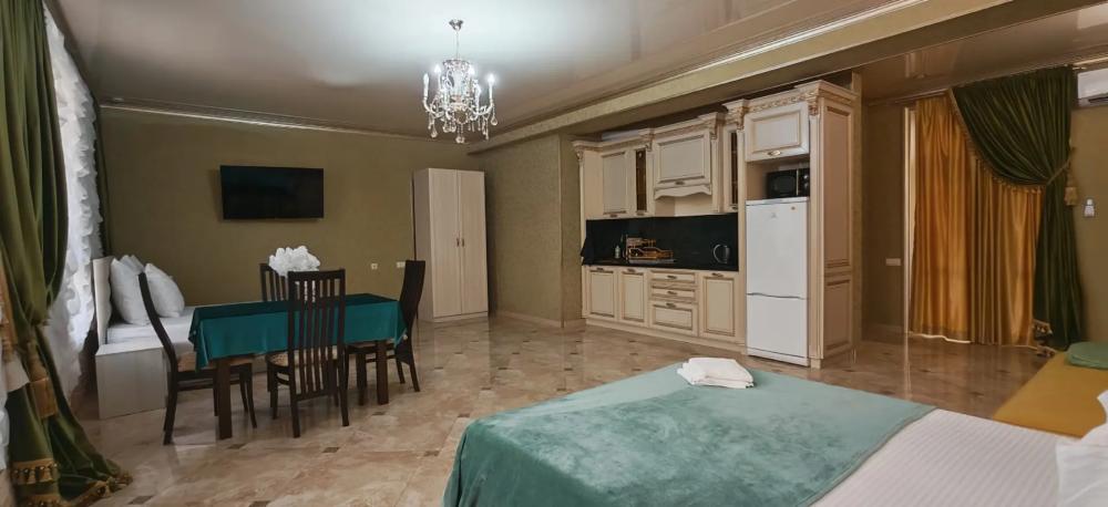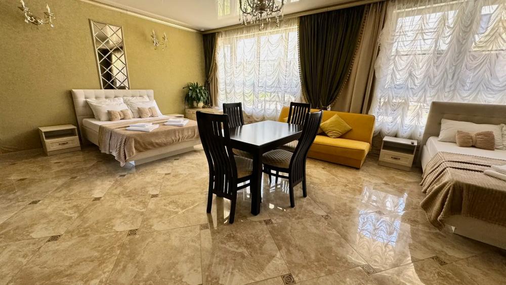 Просторный номер из двух комнат (35 м²), идеально подходящий для большой семьи или компании друзей. Вместимость 5 основных мест; возможно бесплатно разместить ребёнка до 7 лет без дополнительного места. Спальные места двуспальная кровать (King Size); двуспальный раскладной диван — в гостиной зоне; кресло-кровать. Вид из окна Внутренний двор. Оснащение номера кондиционер; телевизор; Wi‑Fi; гостиная зона с раскладным диваном; обеденная группа (стол и стулья); шифонер(в спальне); прикроватные тумбочки; большое зеркало; комод в гостиной. Кухня плита; микроволновая печь; холодильник; электрический чайник; полный комплект посуды для приготовления и приёма пищи; кухонные принадлежности (ножи, разделочные доски, кастрюли, сковороды). Ванная комната душевая кабинка; туалет; раковина; зеркало; фен; комплект полотенец; гигиенические средства (мыло, шампунь, гель для душа, туалетная бумага, освежитель воздуха). На территории гостевого дома бесплатная парковка; бассейн с зоной отдыха; детская площадка; летняя кухня с мангалами; индивидуальный столик и комплект стульев у входа в номер; уютные лавки для отдыха в тени; оборудованная зона барбекю. Дополнительные преимущества зонирование пространства: спальня для родителей, детская/гостевая спальня; полностью оборудованная кухня с современной техникой; повышенный уровень комфорта и приватности; достаточно места для размещения группы гостей; всё необходимое для длительного и приятного проживания. Условия проживания заезд: с 14:00; выезд: до 12:00. Дополнительные услуги трансфер от/до аэропорта и ж/д вокзала (по договорённости); заказ экскурсий. Гостевой дом «Сакура» славится гостеприимством и уютной атмосферой, что подтверждается положительными отзывами гостей.