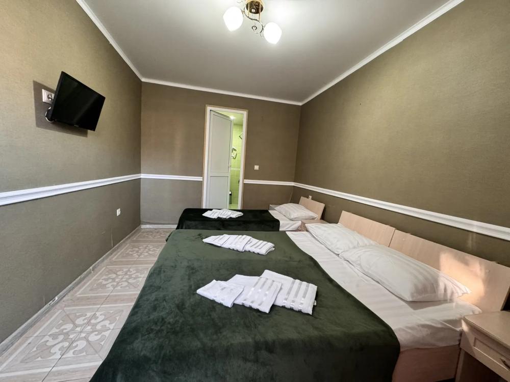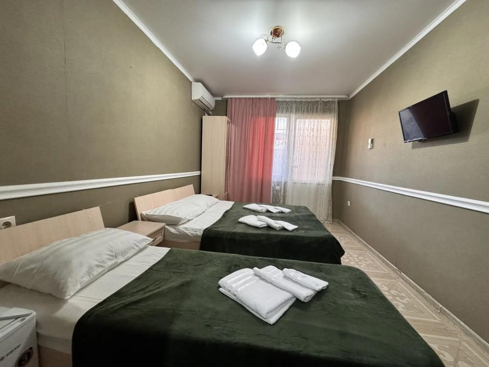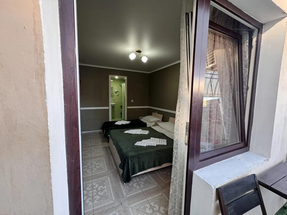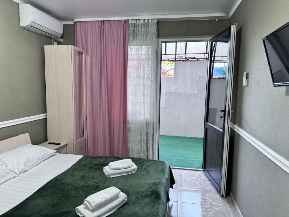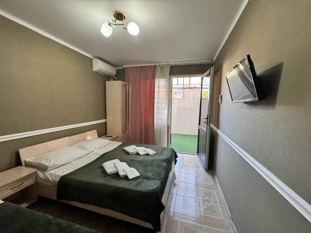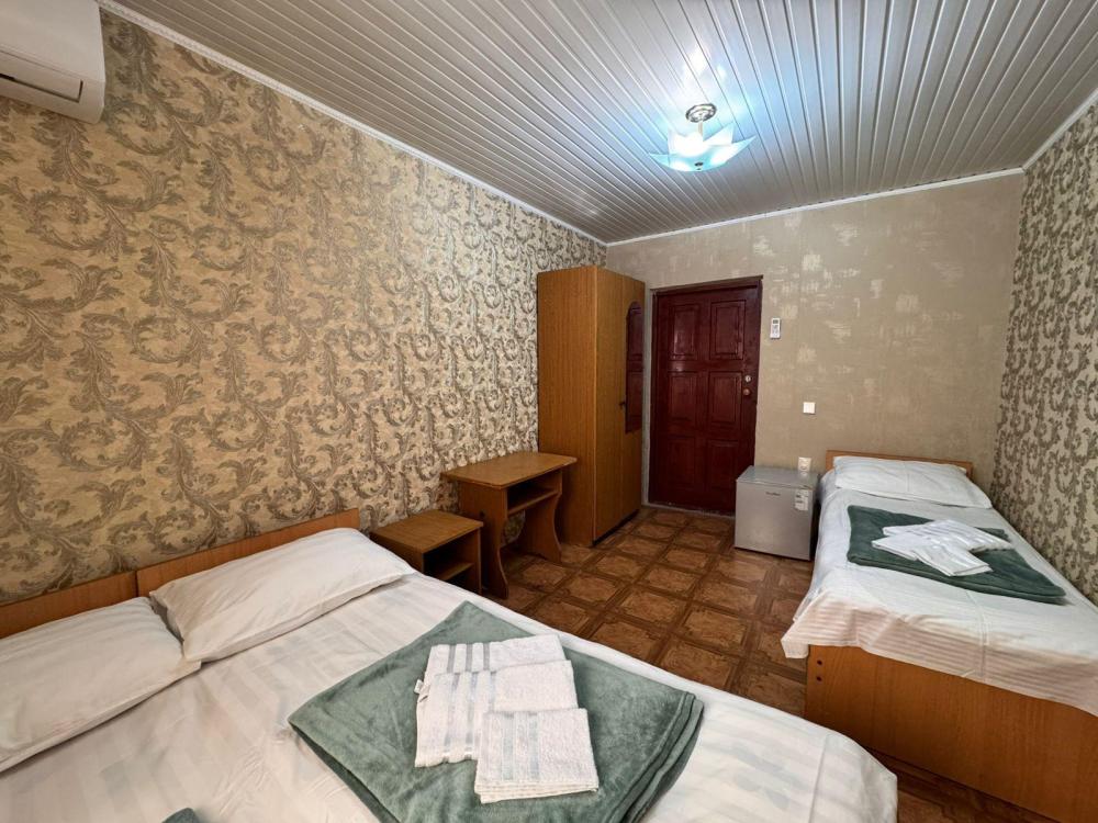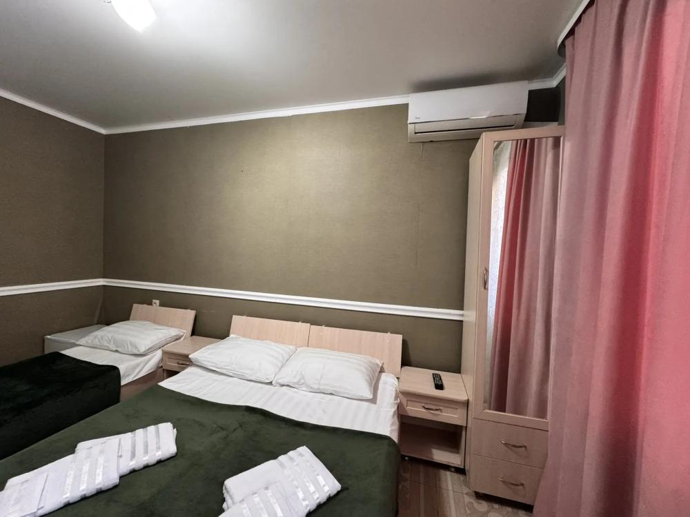 Уютный трехместный номер (19 м²) с общим балконом по доступной цене — отличный вариант для небольшой семьи или компании друзей. Вместимость 3 основных места; возможно бесплатно разместить ребёнка до 7 лет без дополнительного места. Спальные места двуспальная кровать; односпальная кровать. Вид из окна внутренний двор;. город. Оснащение номера кондиционер; холодильник; Wi‑Fi; стол; шкаф для одежды; прикроватные тумбочки. Общая кухня (расположена на этаже) плита; микроволновая печь; холодильник; чайник; комплект посуды для приготовления и приёма пищи. Общий санузел (расположен на этаже) душ; туалет; раковина; зеркало; комплект полотенец. На территории гостевого дома бесплатная парковка; бассейн; детская площадка; летняя кухня; оборудованные места для принятия солнечных ванн (шезлонги, зонты от солнца); лавки для отдыха; зона барбекю. Условия проживания заезд: с 14:00; выезд: до 12:00. Дополнительные услуги трансфер от/до аэропорта и ж/д вокзала (по договорённости). Гостевой дом «Сакура» славится гостеприимством и уютной атмосферой, что подтверждается положительными отзывами гостей.