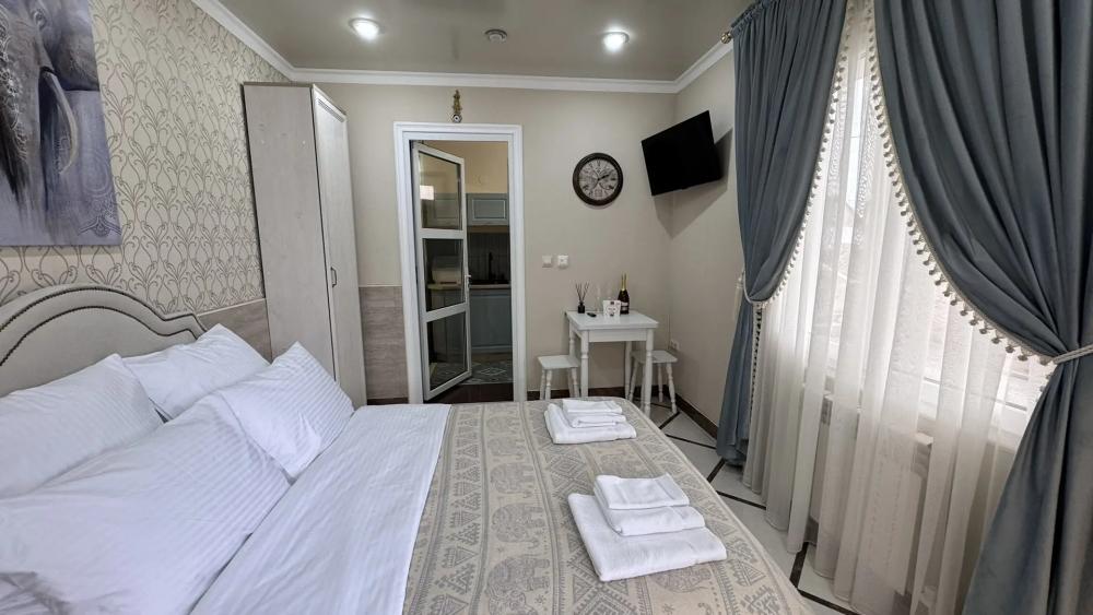 Двухместный «Стандарт улучшенный с кухней» — уютный однокомнатный номер, идеально подходящий для пары или двоих друзей. Площадь номера составляет 20 м². Вместимость 2 основных места; возможно бесплатно разместить ребёнка до 7 лет без дополнительного места. Спальные места одна двуспальная кровать (King Size). Вид из окна Внутренний двор. Оснащение номера кондиционер; телевизор; Wi‑Fi; стол и стулья; шкаф для одежды; прикроватные тумбочки. Кухня плита; микроволновая печь; холодильник; чайник; комплект посуды для приготовления и приёма пищи. Ванная комната душевая кабинка; туалет; раковина; зеркало; фен; комплект полотенец; гигиенические средства (мыло, туалетная бумага, освежитель воздуха). На территории гостевого дома бесплатная парковка; бассейн; детская площадка; летняя кухня; индивидуальный столик и комплект стульев у входа в номер; лавки для отдыха; зона барбекю. Дополнительные преимущества подходит для пар или компанией друзей; полностью оборудованная кухня для самостоятельного приготовления пищи; всё необходимое для приятного и длительного проживания. Условия проживания заезд: с 14:00; выезд: до 12:00. Дополнительные услуги трансфер от/до аэропорта и ж/д вокзала (по договорённости). Гостевой дом «Сакура» славится гостеприимством и уютной атмосферой, что подтверждается положительными отзывами гостей.