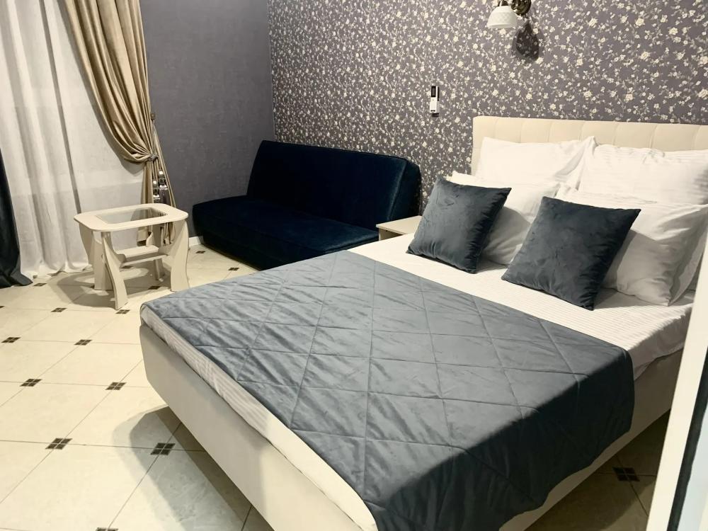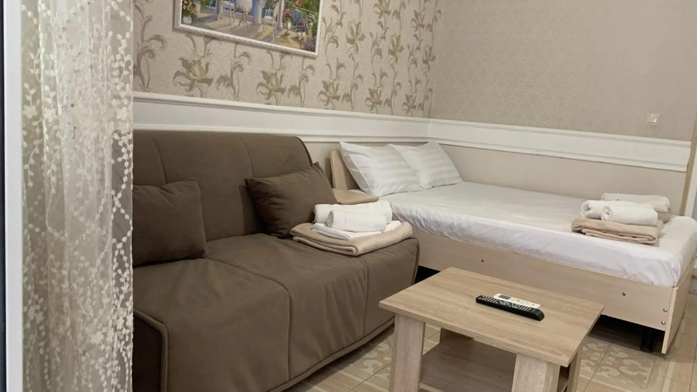 Просторный однокомнатный номер (20 м²) для семьи или небольшой компании. Вместимость 4 основных места; возможно бесплатно разместить ребёнка до 7 лет без дополнительного места. Спальные места двуспальная кровать (King Size); двуспальный раскладной диван. Вид из окна Внутренний двор. Оснащение номера кондиционер; телевизор; Wi‑Fi; стол и стулья; шкаф для одежды; прикроватные тумбочки. Кухня общая (рядом с номером) микроволновая печь; холодильник; чайник; комплект посуды для приготовления и приёма пищи. Ванная комната душевая кабинка; туалет; раковина; зеркало; фен; комплект полотенец; гигиенические средства (мыло, туалетная бумага, освежитель воздуха). На территории гостевого дома бесплатная парковка; бассейн; детская площадка; летняя кухня; индивидуальный столик и комплект стульев у входа в номер; лавки для отдыха; зона барбекю. Условия проживания заезд: с 14:00; выезд: до 12:00. Дополнительные услуги трансфер от/до аэропорта и ж/д вокзала (по договорённости). Гостевой дом «Сакура» славится гостеприимством и уютной атмосферой, что подтверждается положительными отзывами гостей.