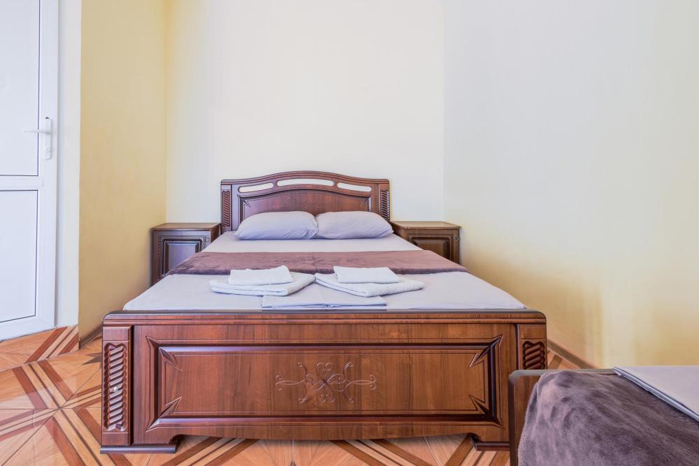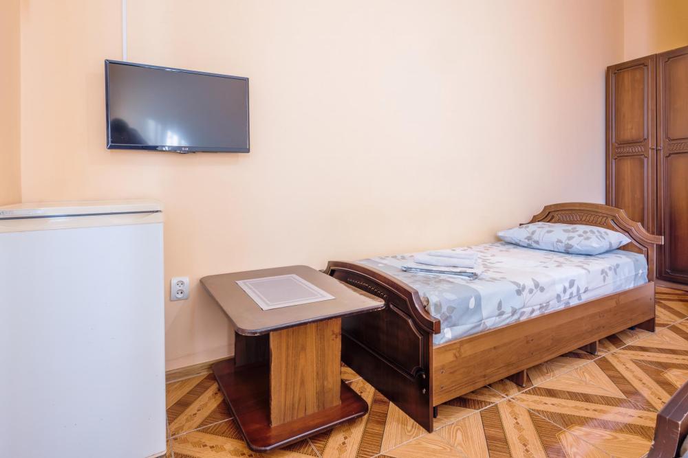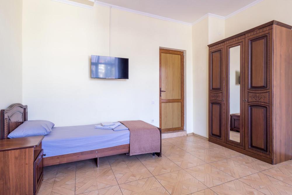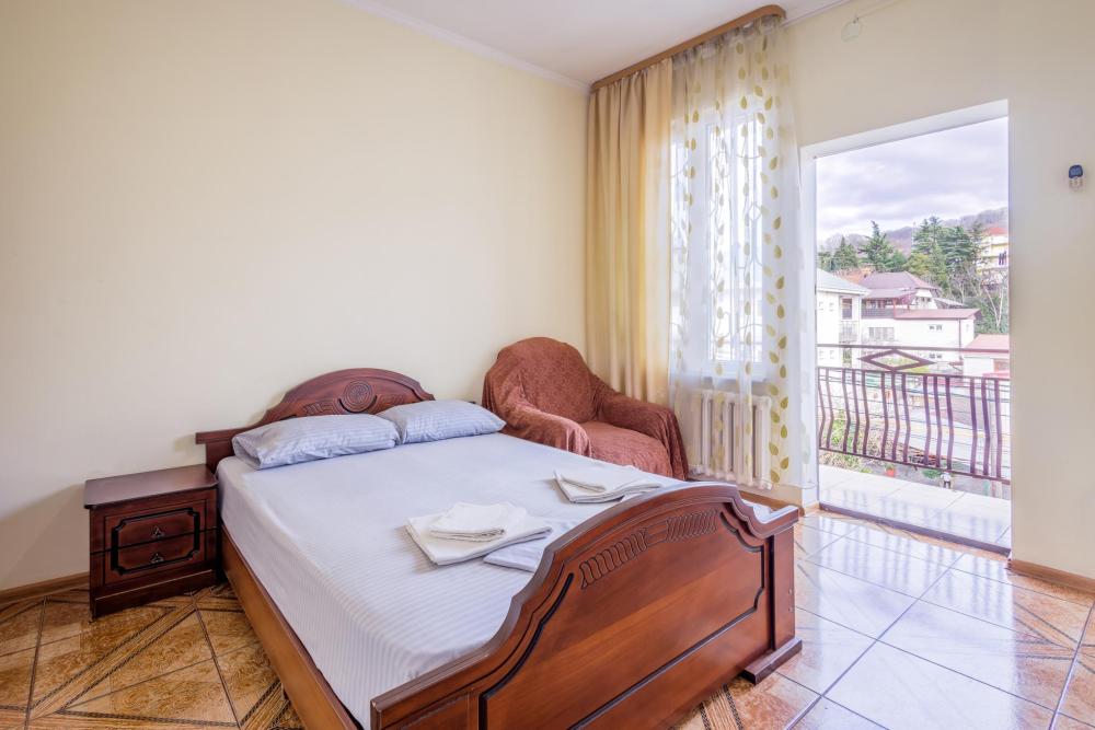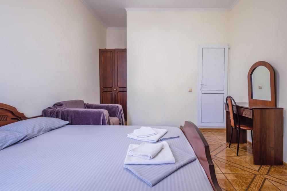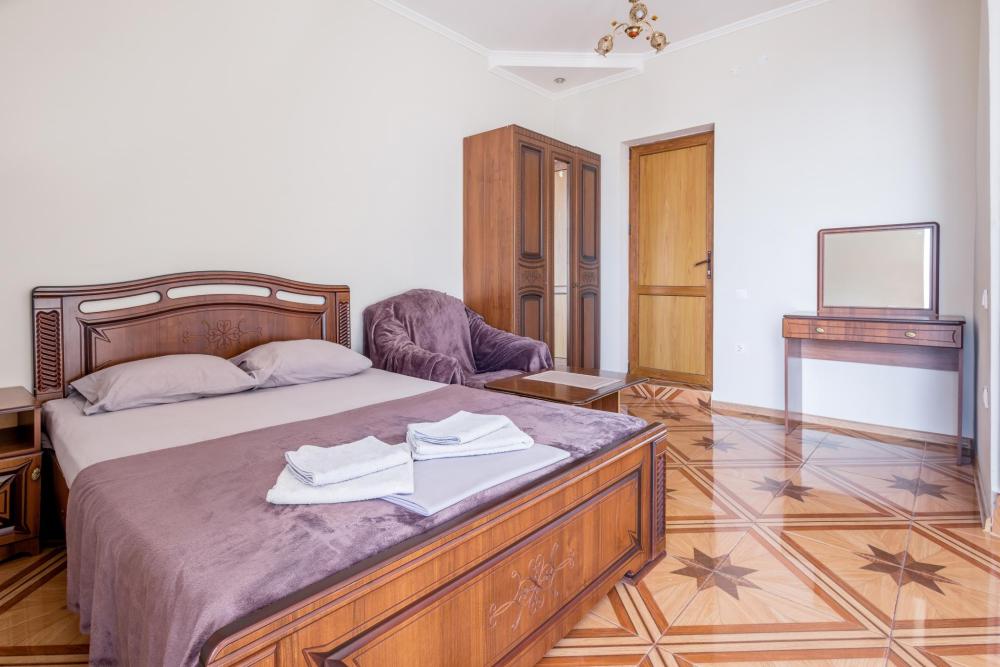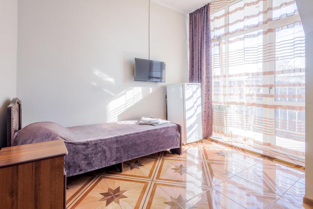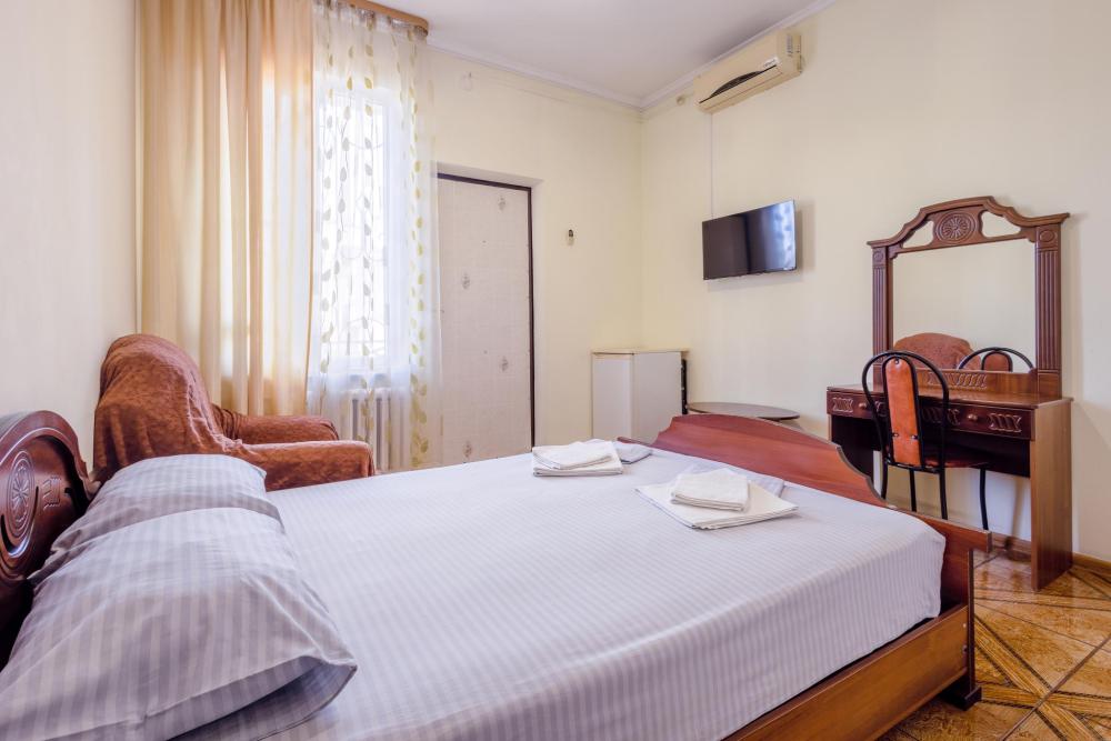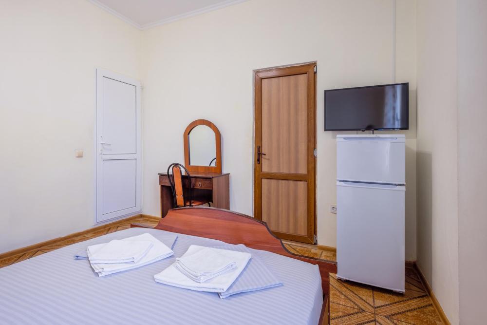 В номере двухспальная кровать. Все необходимое для комфортного пребывания. Холодильник, постельное белье, набор полотенец.