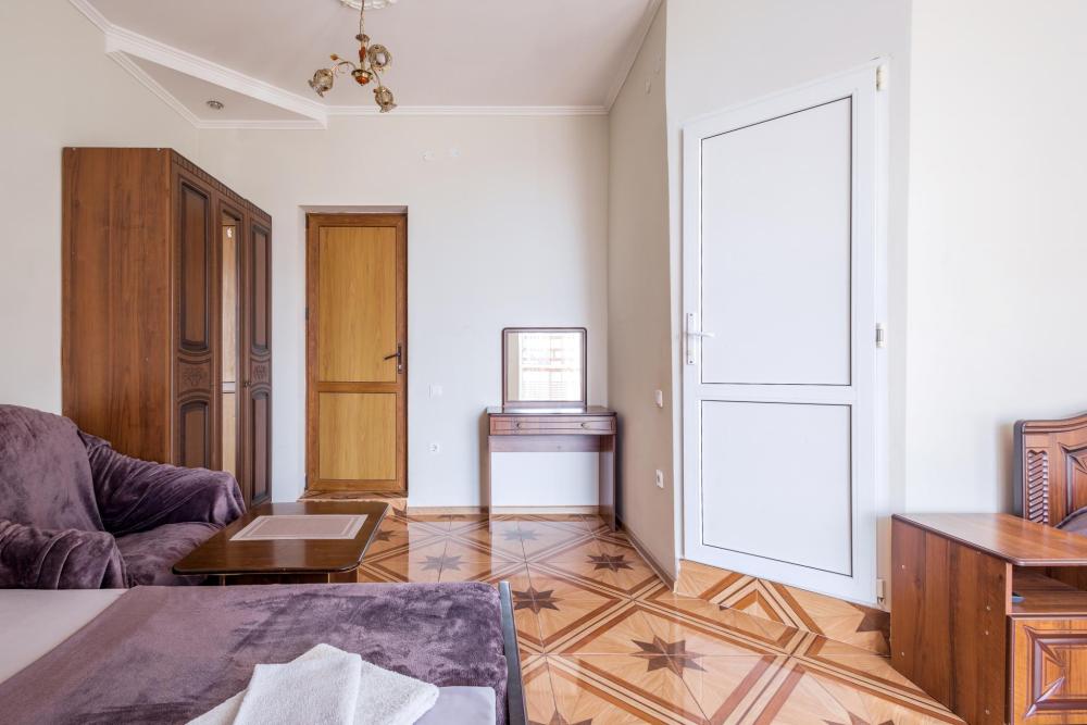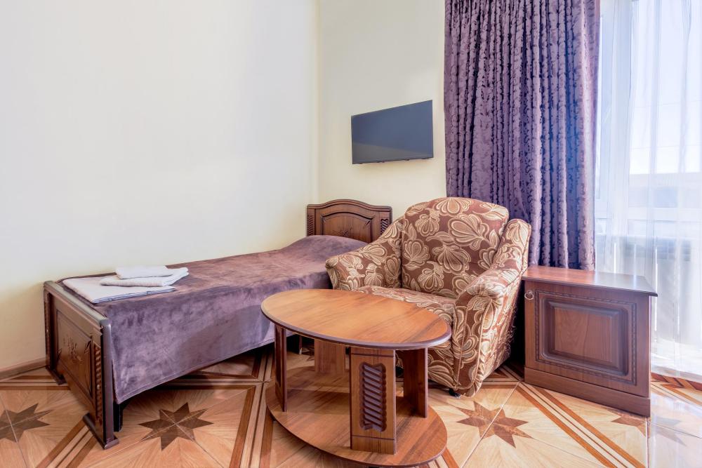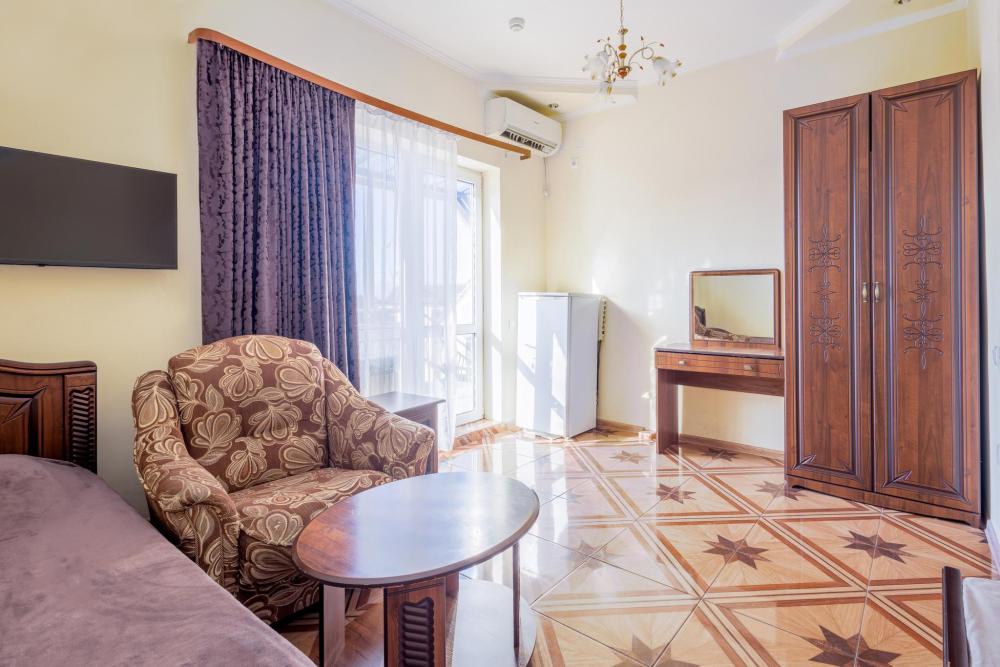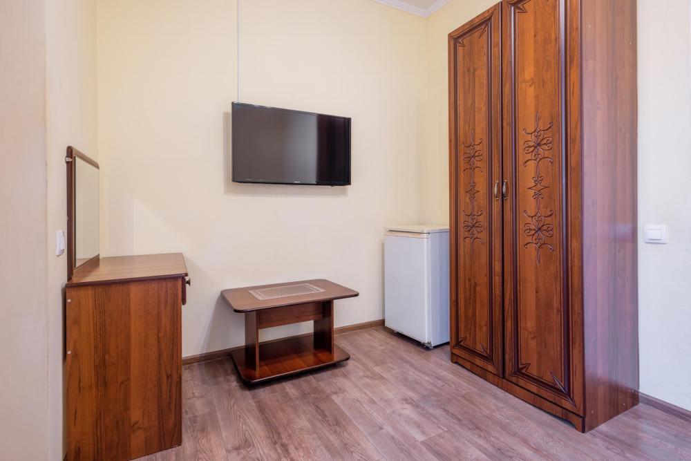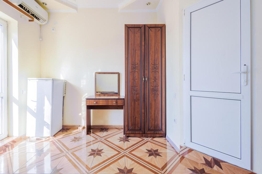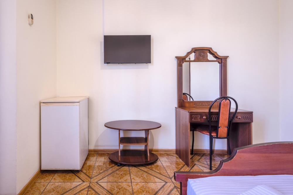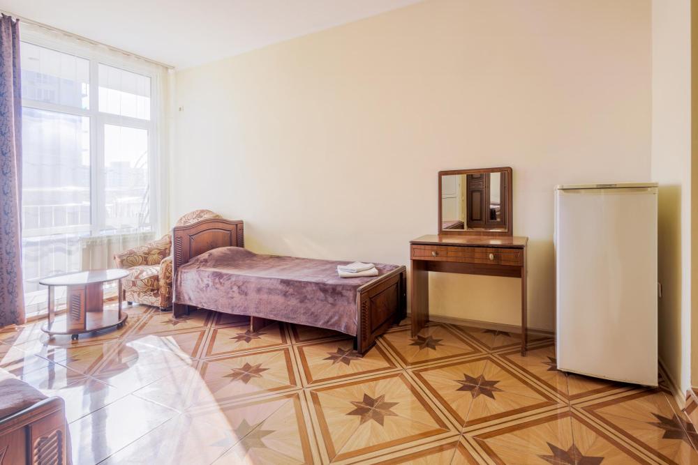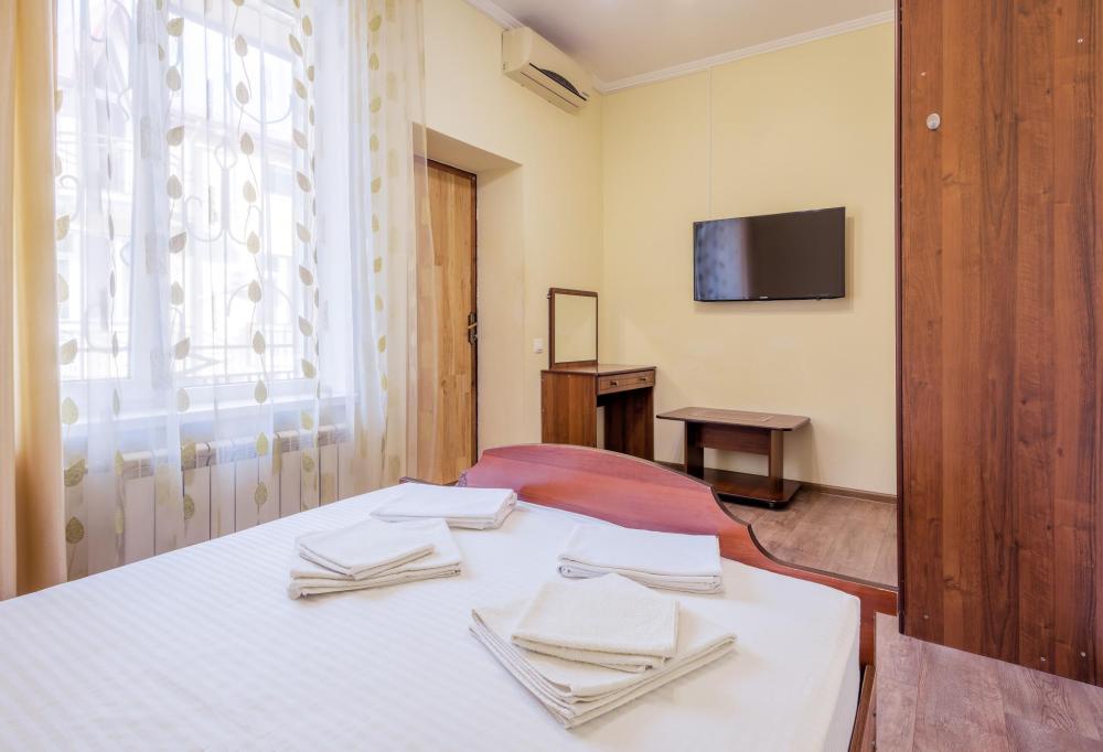 В номере двухспальная кровать. Все необходимое для комфортного пребывания. Холодильник, постельное белье, набор полотенец.