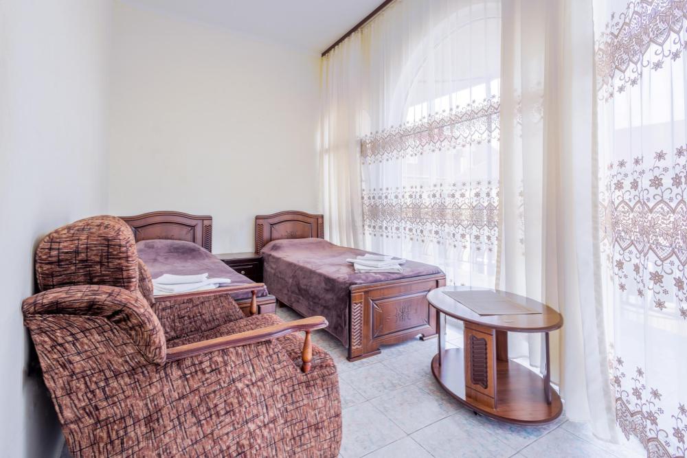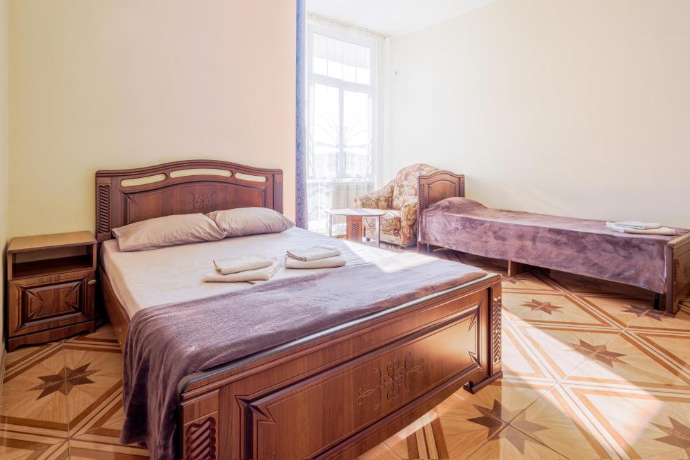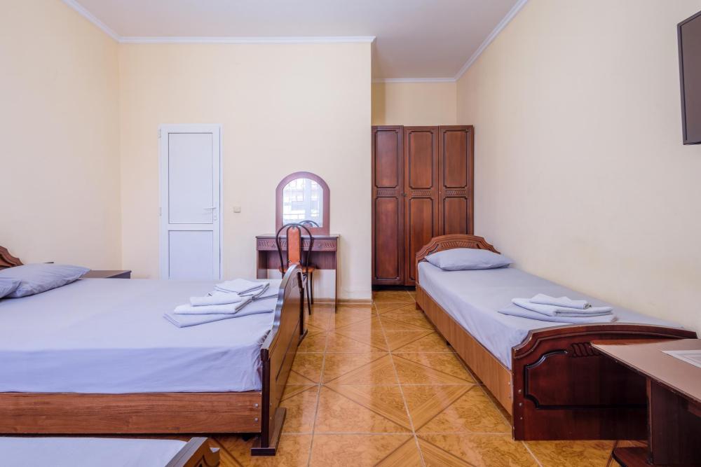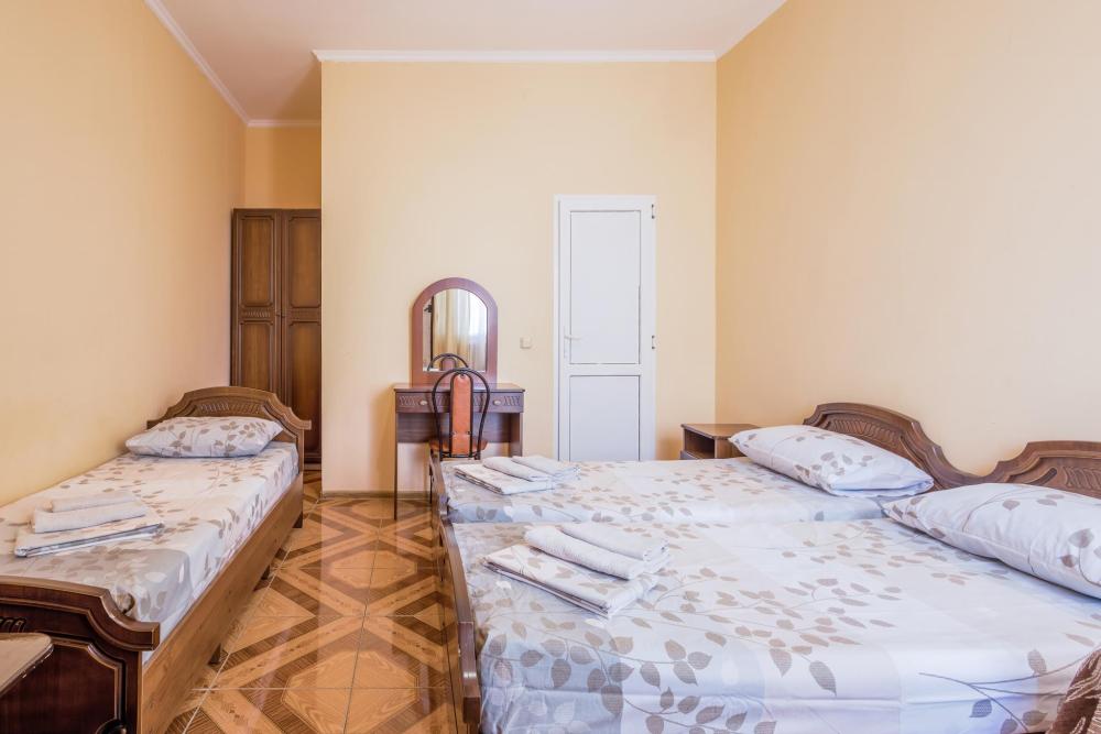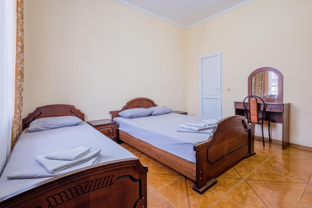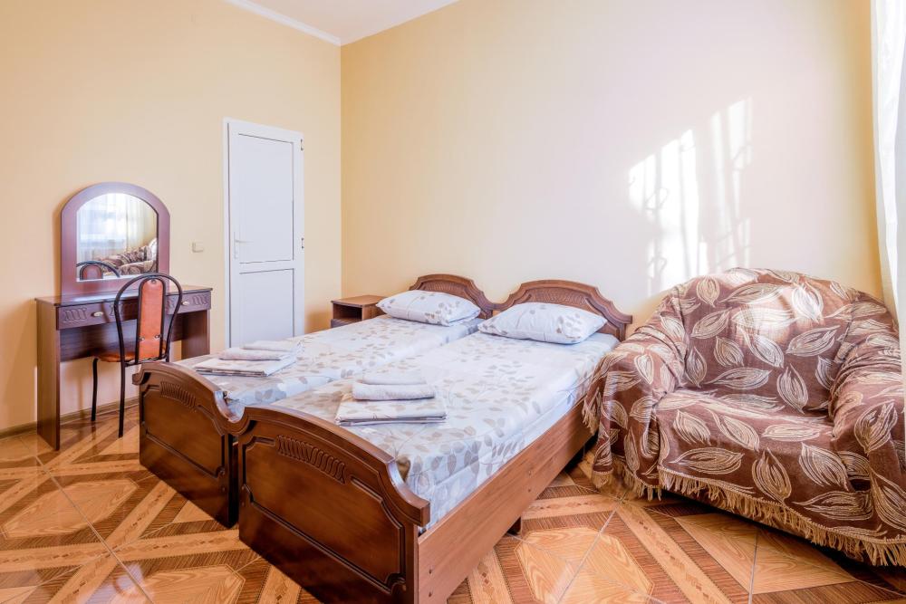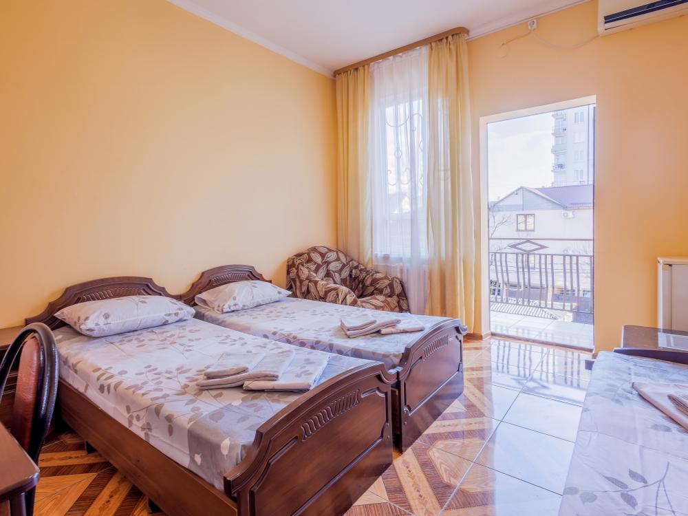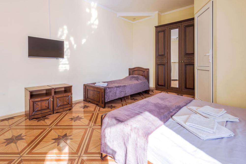 В номере двухспальная кровать и односпальная кровать. Все необходимое для комфортного пребывания. Холодильник, постельное белье, набор полотенец.