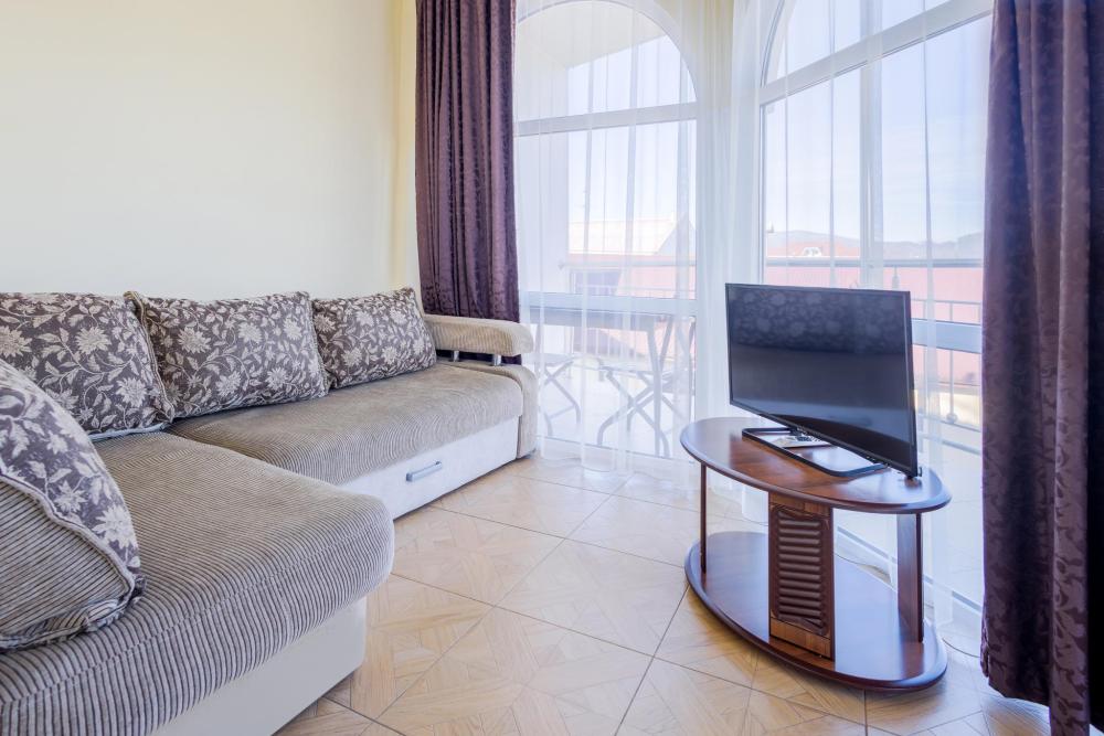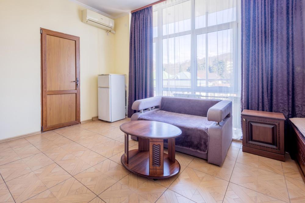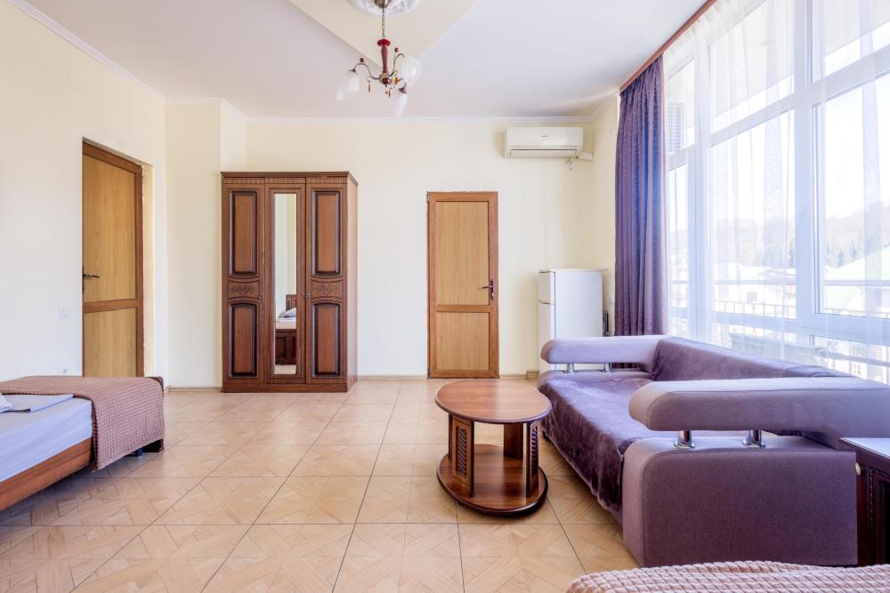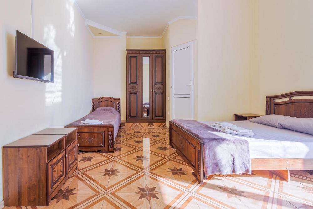 В комнате одна двухспальная кровать и две односпальные кровати. Все необходимое для комфортного пребывания. Холодильник, телевизор, постельное белье, набор полотенец.