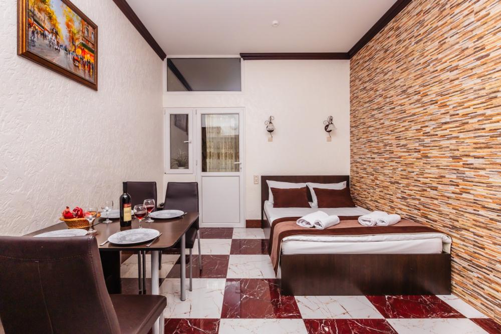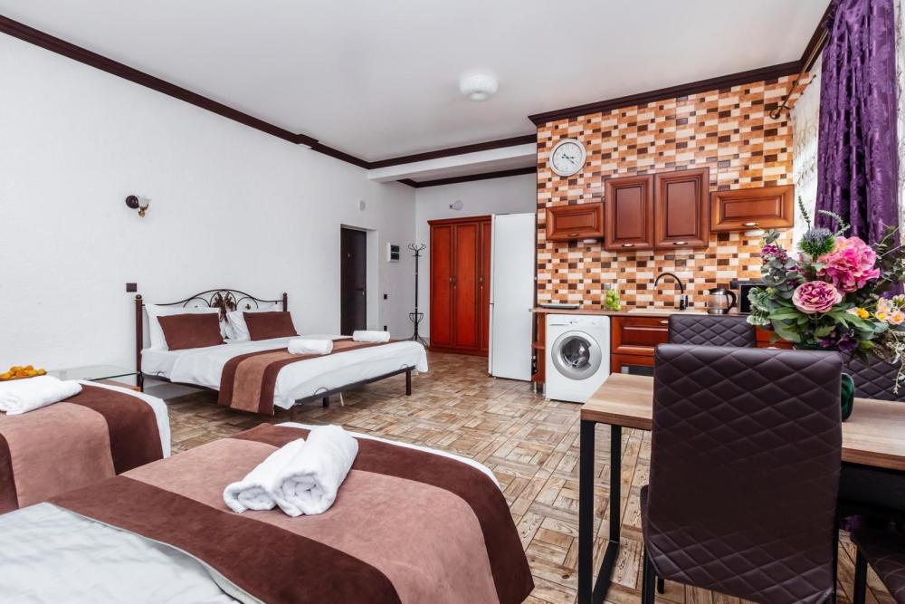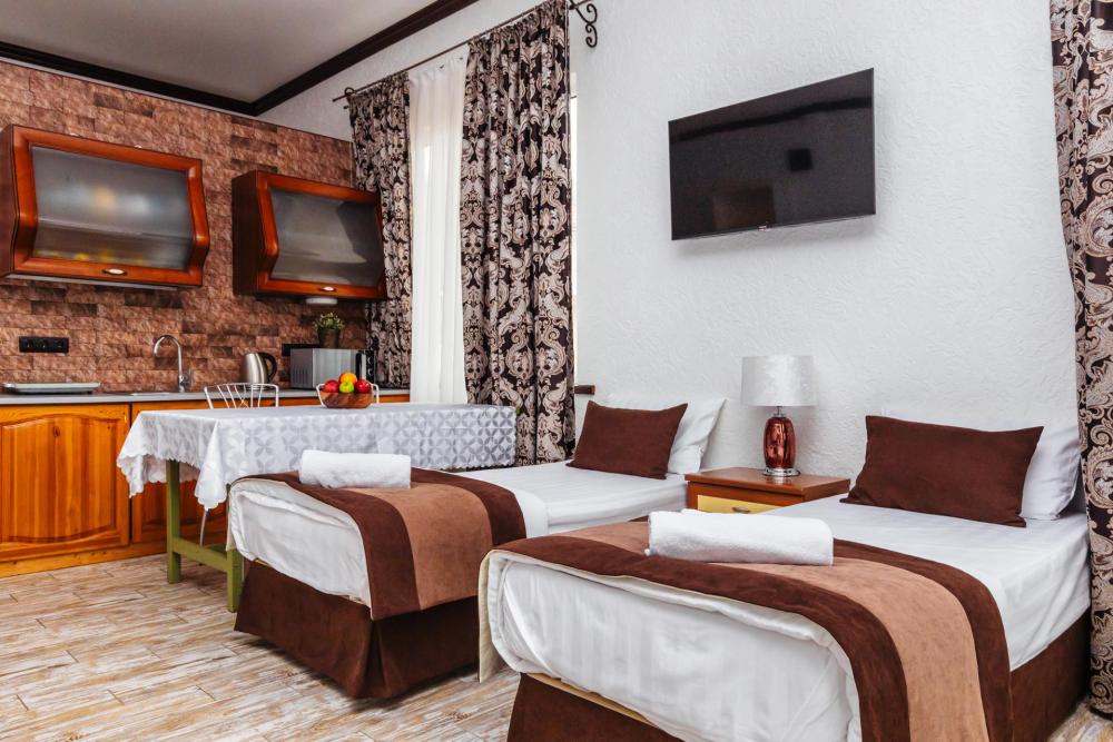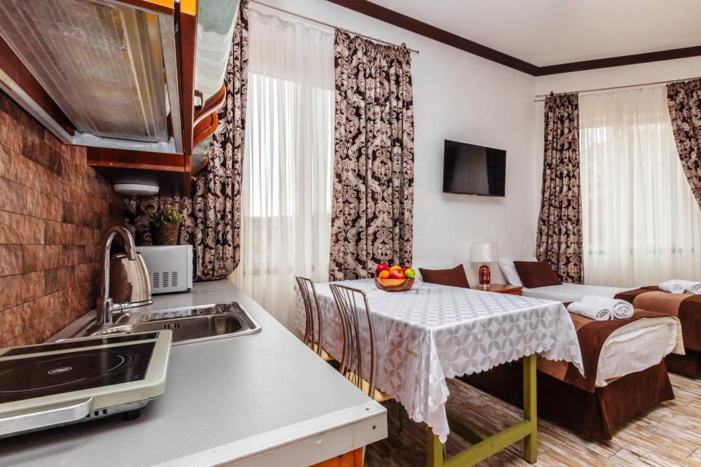Апартаменты представляют собой общее помещение с кухонным уголком и собственным санузлом. Конфигурация может быть как в виде 3 односпальных кроватей, так и в виде 1 двуспальной и 1 односпальной кровати. Из оснащения есть вся необходимая бытовая техника и мебель, которая может потребоваться для комфортного отдыха при любой длительности проживании.