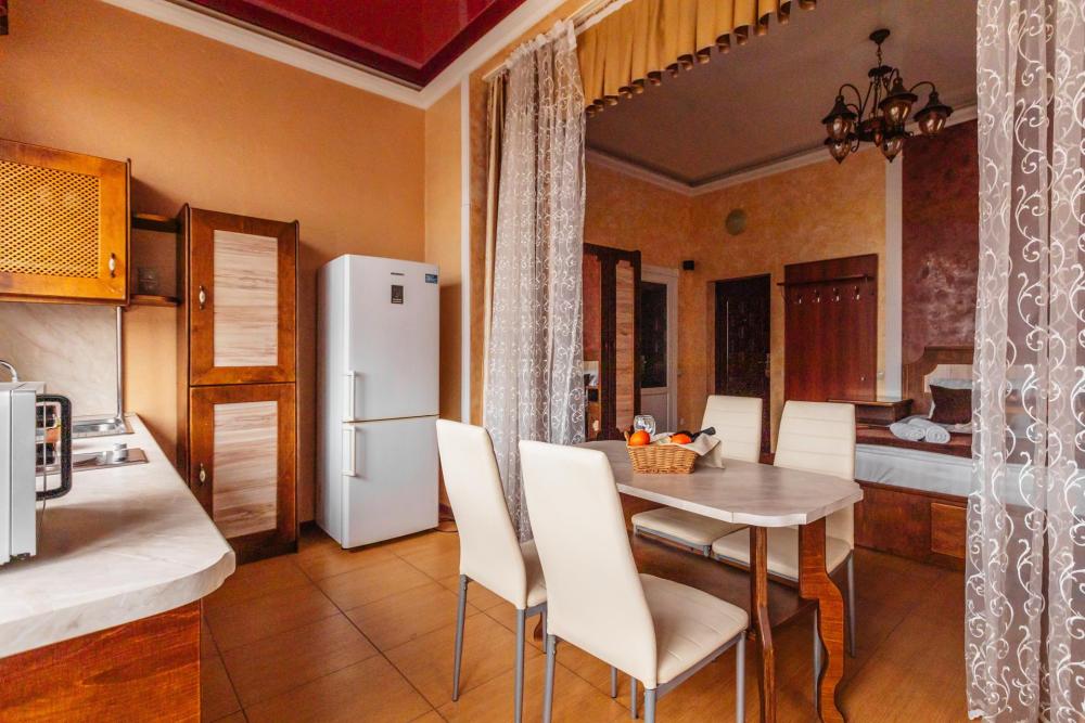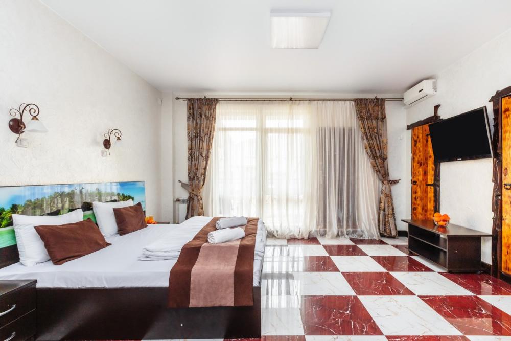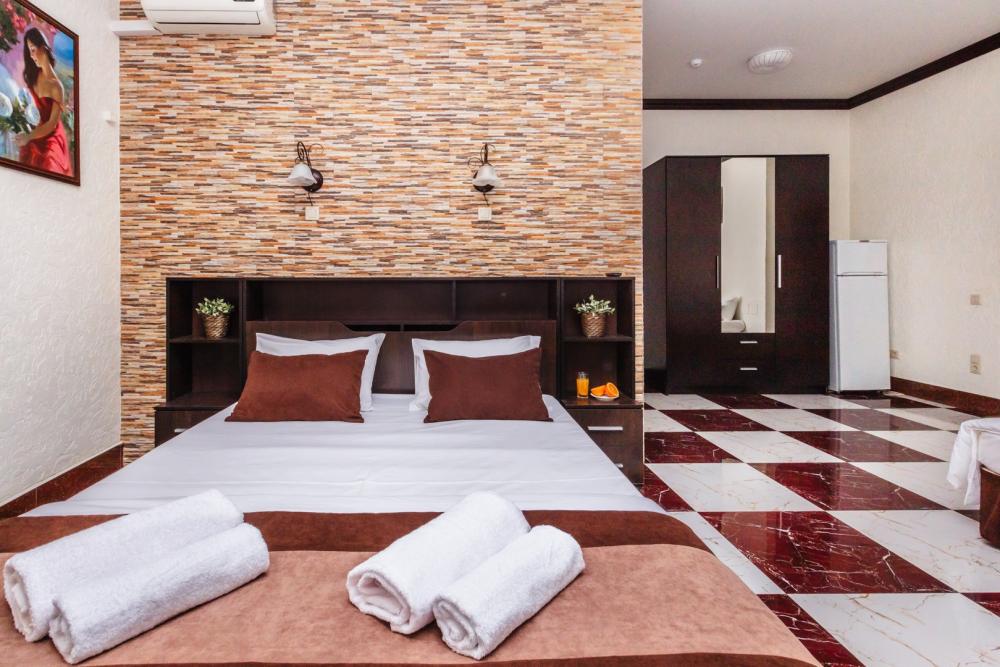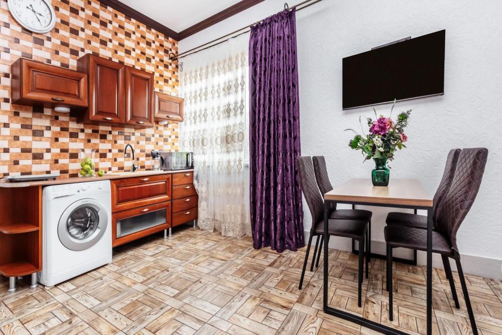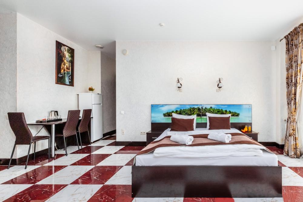 Апартаменты с большой и удобной двуспальной кроватью, собственной ванной комнатой и кухней. Из оснащения есть вся необходимая бытовая техника и мебель, которая может потребоваться для комфортного отдыха при любой длительности проживании.