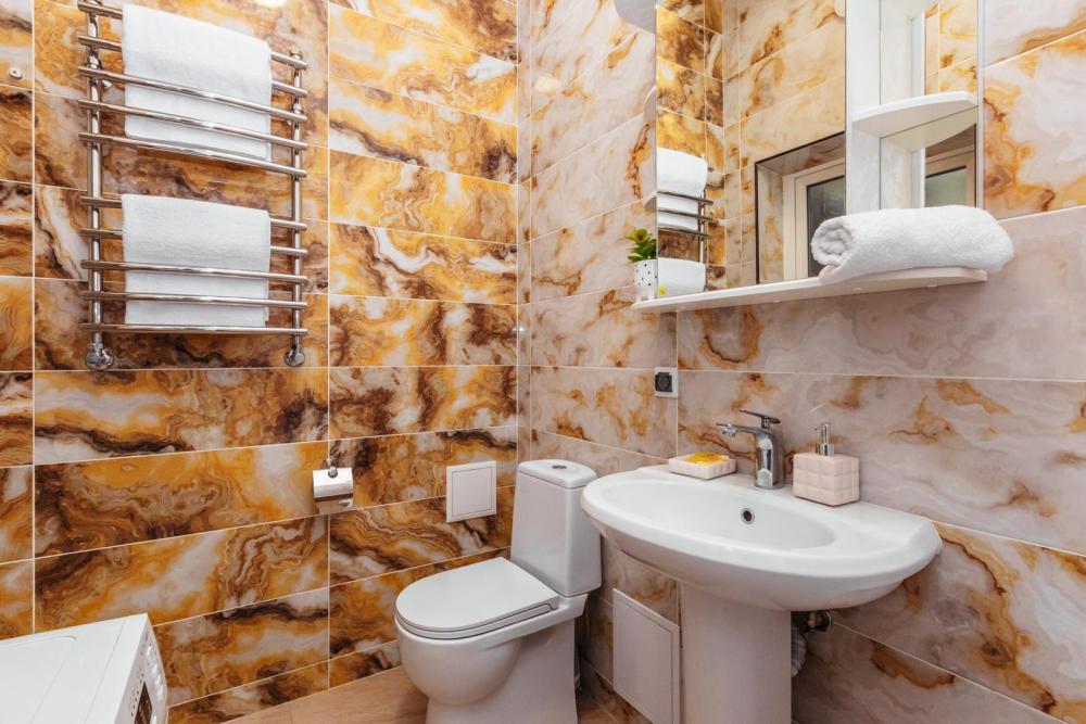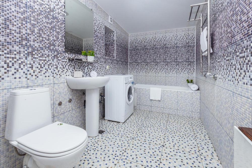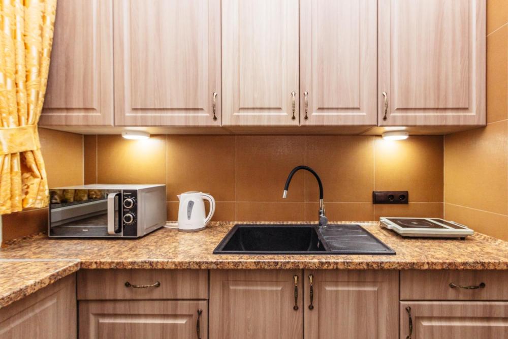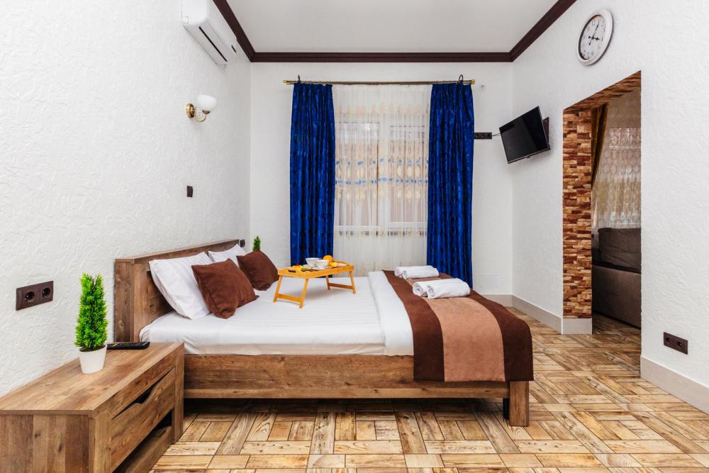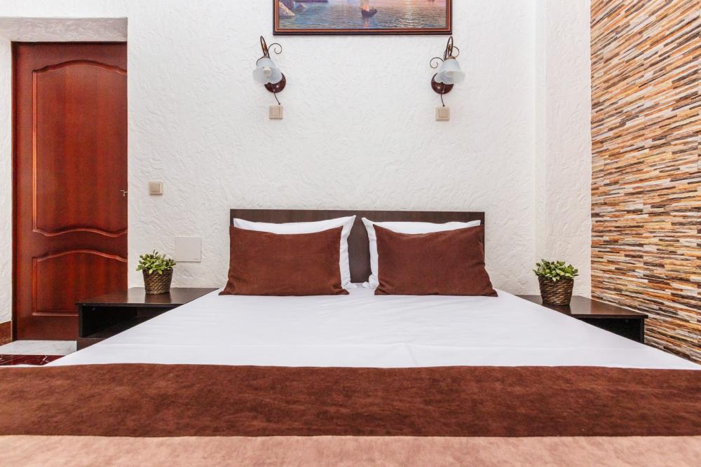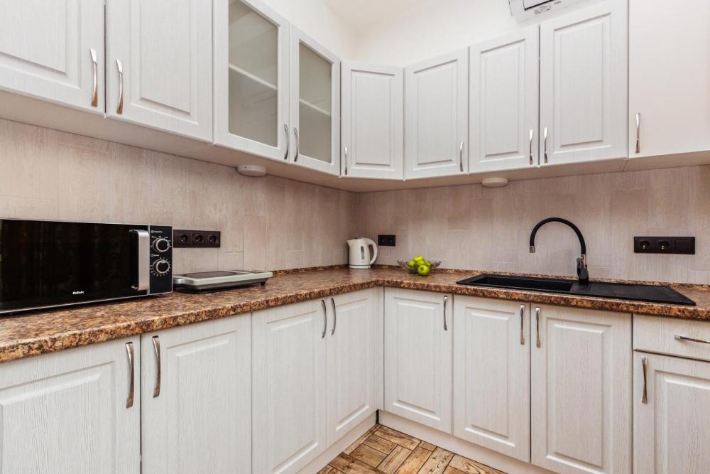 Апартаменты с большой и удобной двуспальной кроватью, собственной ванной комнатой и кухней. Из оснащения есть вся необходимая бытовая техника и мебель, которая может потребоваться для комфортного отдыха при любой длительности проживании.