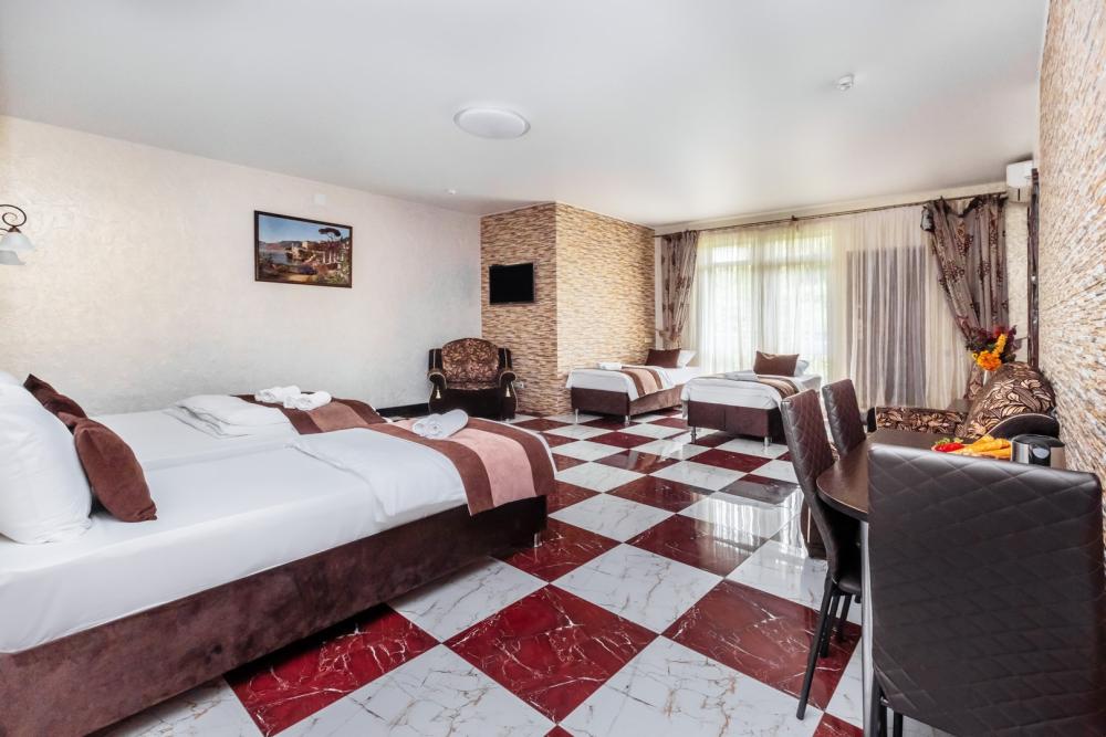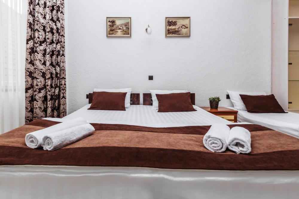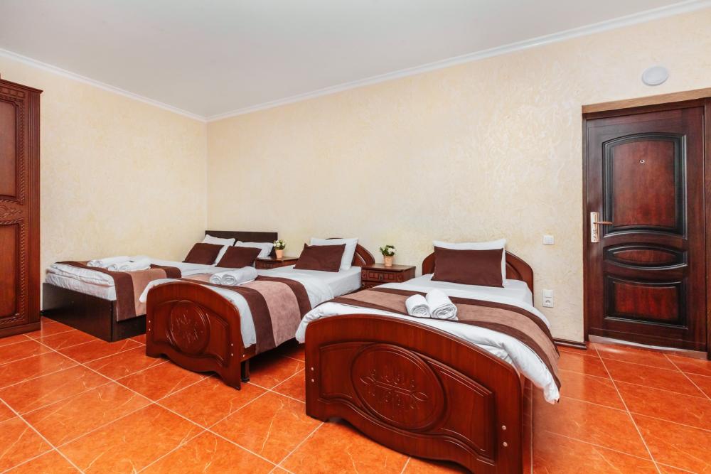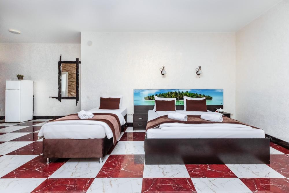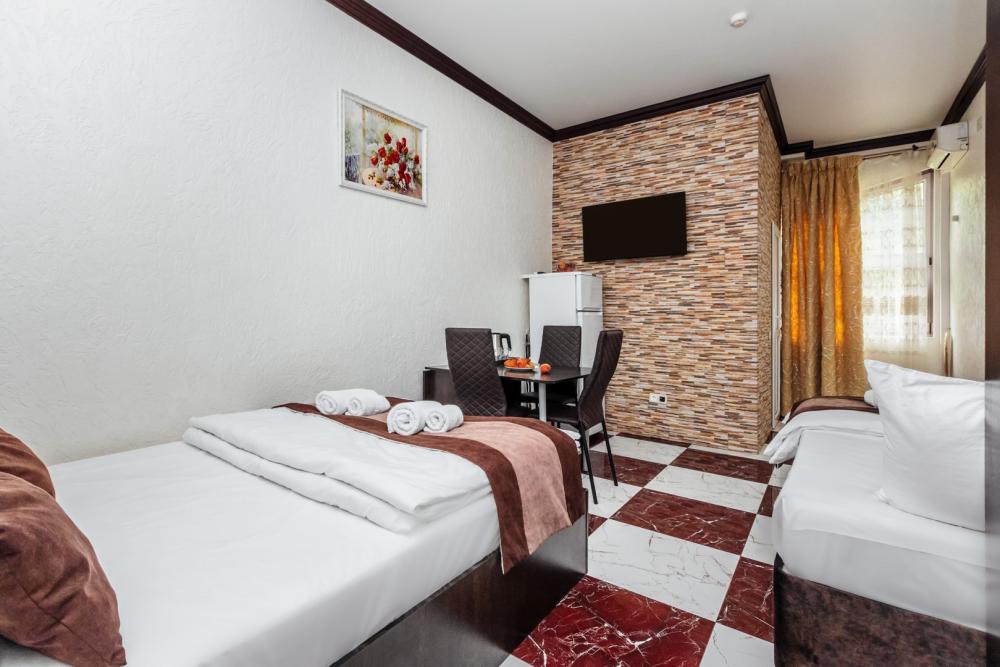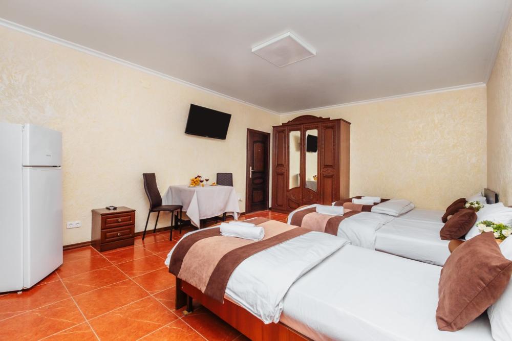 Трехместные апартаменты с собственным санузлом, прихожей и кухонным уголком. Конфигурация может быть как в виде 3 односпальных кроватей, так и в виде 1 двуспальной и 1 односпальной кровати. Из оснащения есть вся необходимая бытовая техника и мебель, которая может потребоваться для комфортного отдыха при любой длительности проживании.