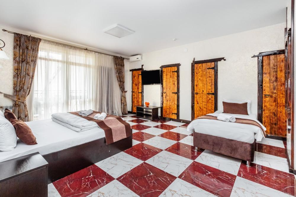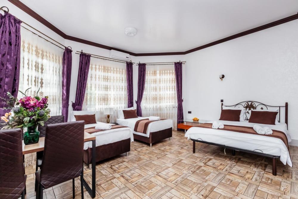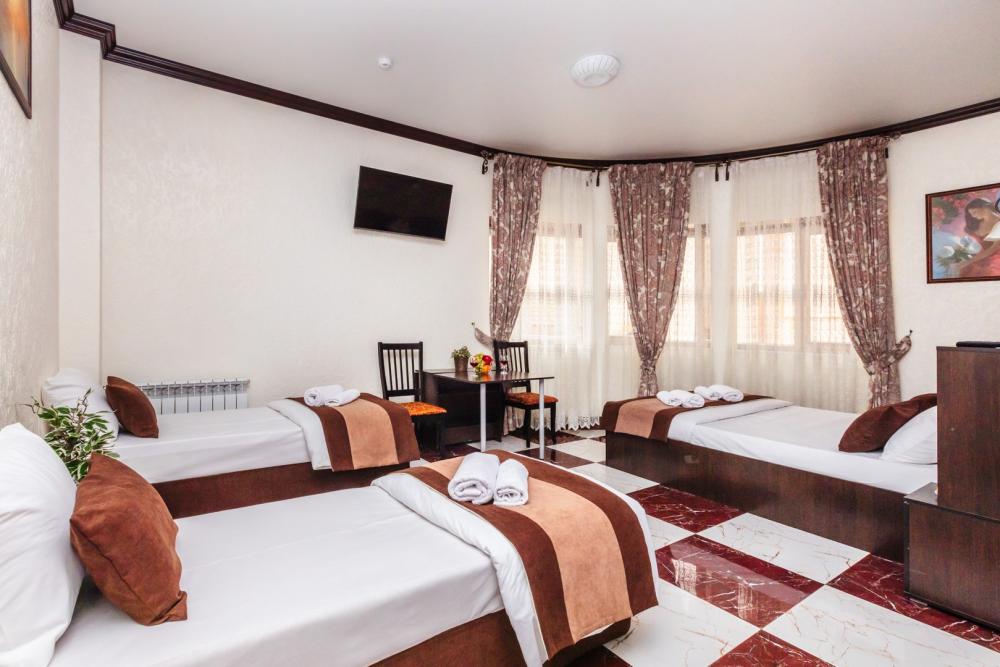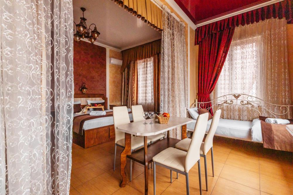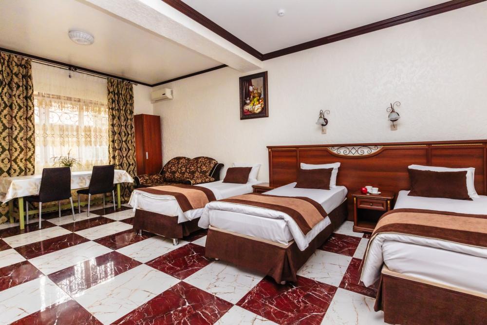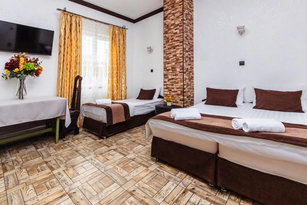 Трехместные апартаменты с собственным санузлом, прихожей и кухонным уголком. Конфигурация может быть как в виде 3 односпальных кроватей, так и в виде 1 двуспальной и 1 односпальной кровати. Из оснащения есть вся необходимая бытовая техника и мебель, которая может потребоваться для комфортного отдыха при любой длительности проживании.
