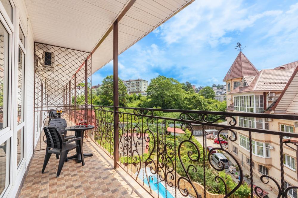 Большая четырехместная комната с собственным широким балконом и видом на бассейн. В комнате размещается 1 двуспальная кровать, 1 односпальная и диван раскладывающийся в 1,5 спальную кровать. При необходимости возможно размещение дополнительной односпальной кровати. Комната оснащена всем необходимым для комфортного проживания, в том числе кондиционером, телевизором, холодильником, чайной станцией и рабочим столом для удобства чтения и работы. Собственный санузел включает ванную с душем и основными туалетными принадлежности. В случае необходимости приготовления пищи круглосуточно работает общая кухня с обеденным залом и верандой.