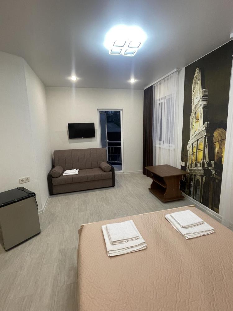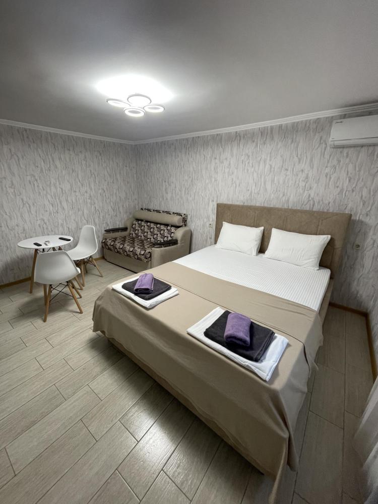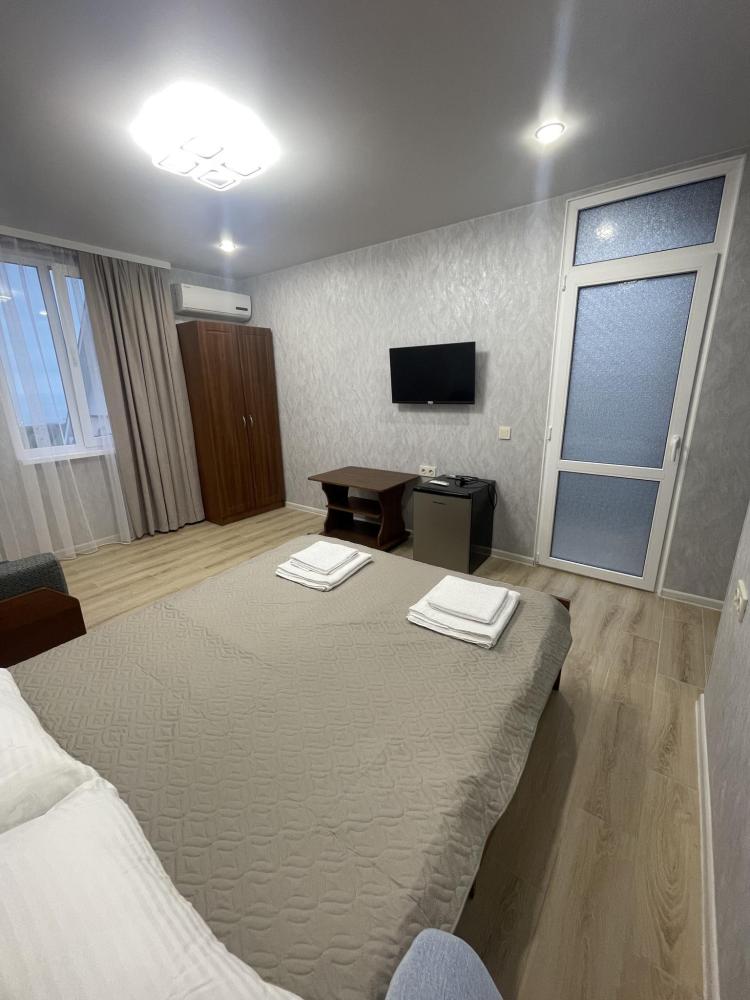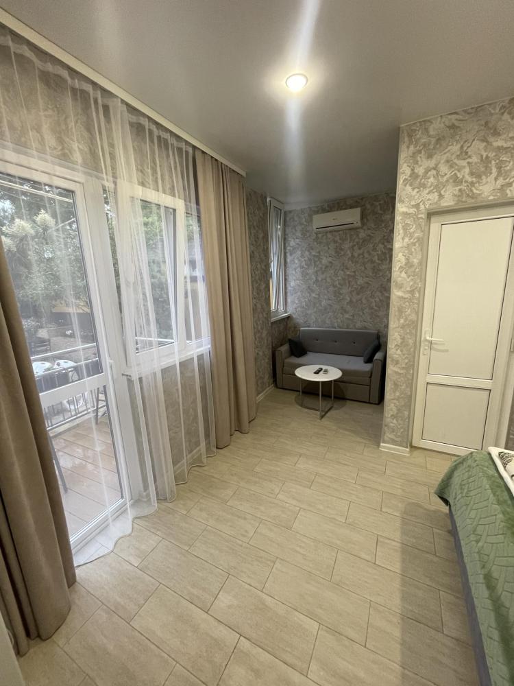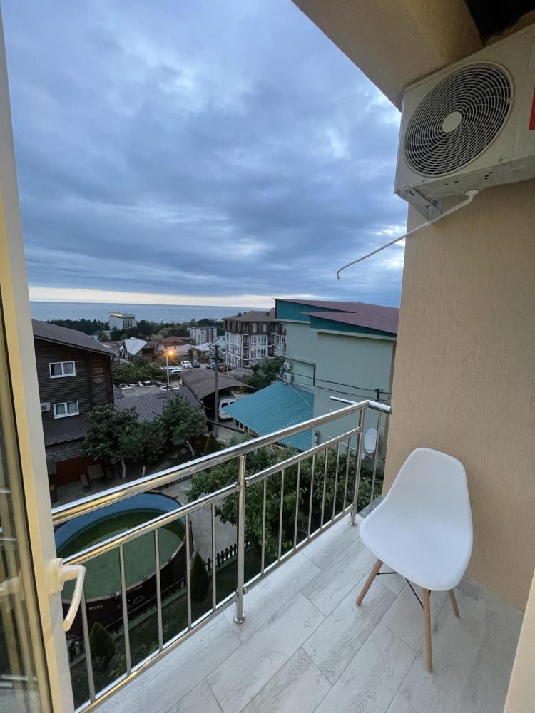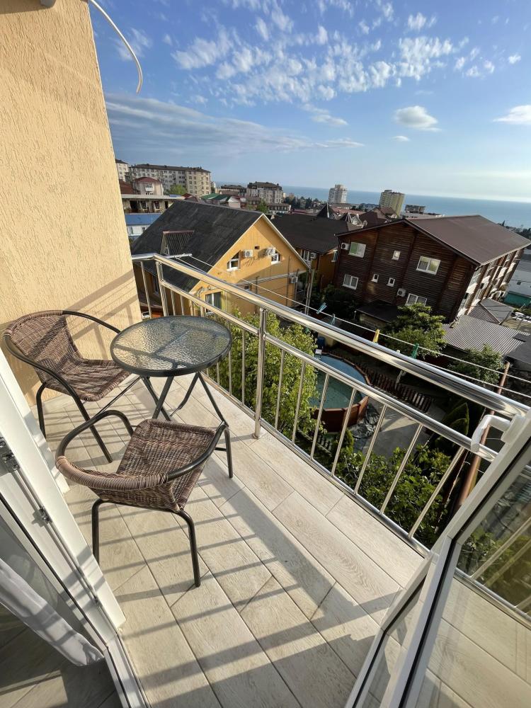 Апартаменты с диваном и с видом на море, со всем необходимым для комфортного проживания и отдыха. Апартамент оснащён собственным санузлом, холодильником, Смарт телевизором, кондиционером, чайником, обеденной зоной, феном, балконом, на балконах установлены кресла и столик. Спальные места -двуспальная кровать с ортопедическим матрасом и диван-кровать.