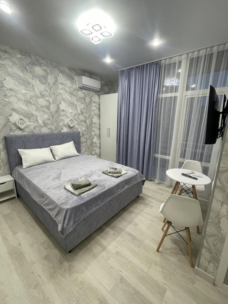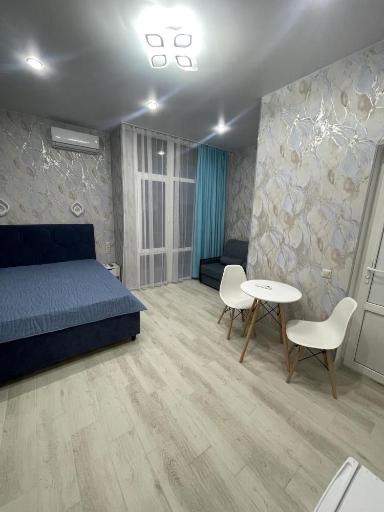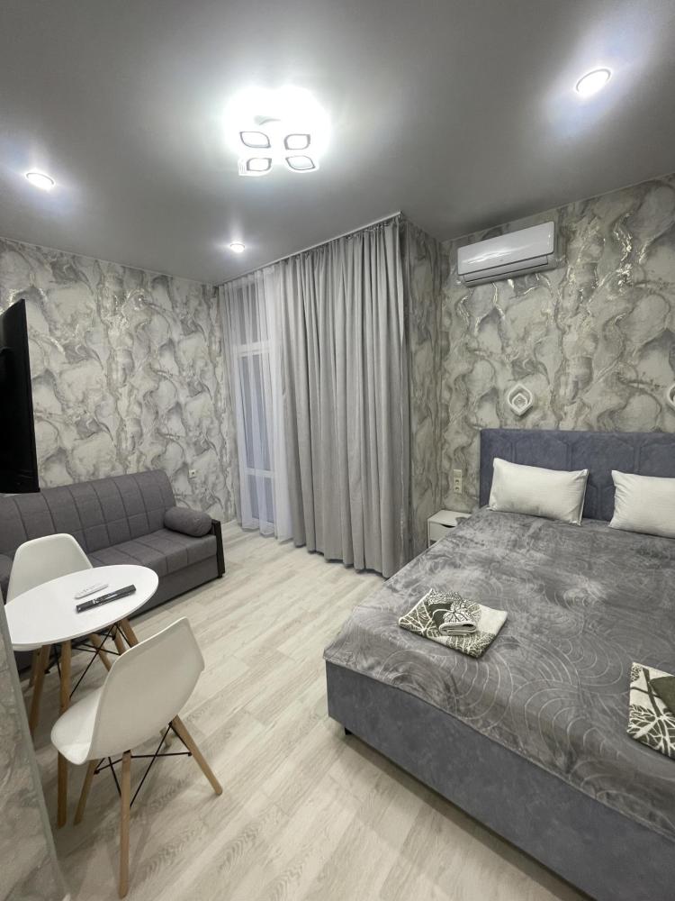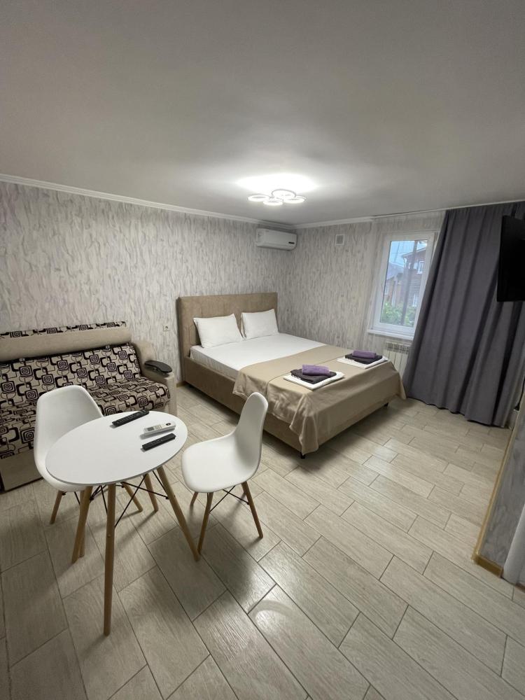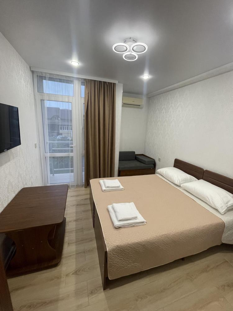 Апартаменты с диваном и с видом на море, со всем необходимым для комфортного проживания и отдыха. Апартамент оснащён собственным санузлом, холодильником, Смарт телевизором, кондиционером, чайником, обеденной зоной, феном, балконом, на балконах установлены кресла и столик. Спальные места -двуспальная кровать с ортопедическим матрасом и диван-кровать.