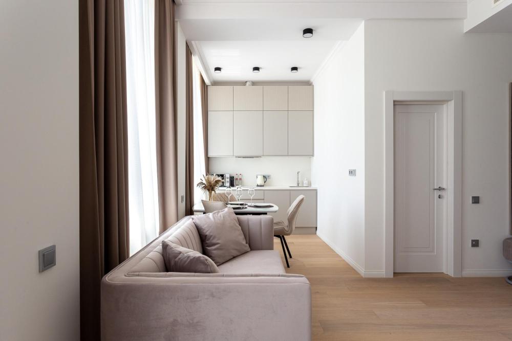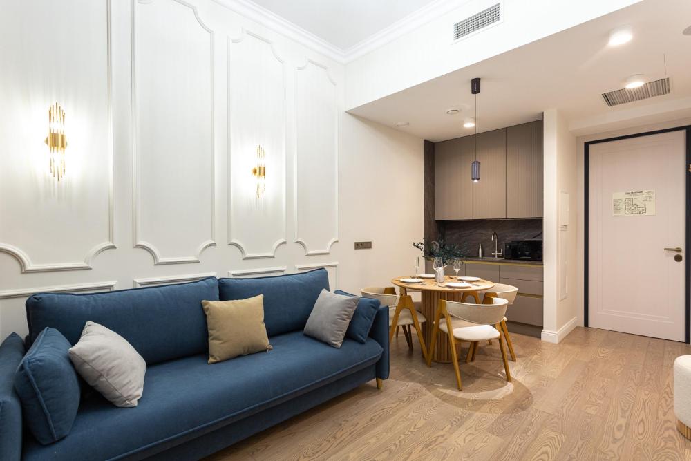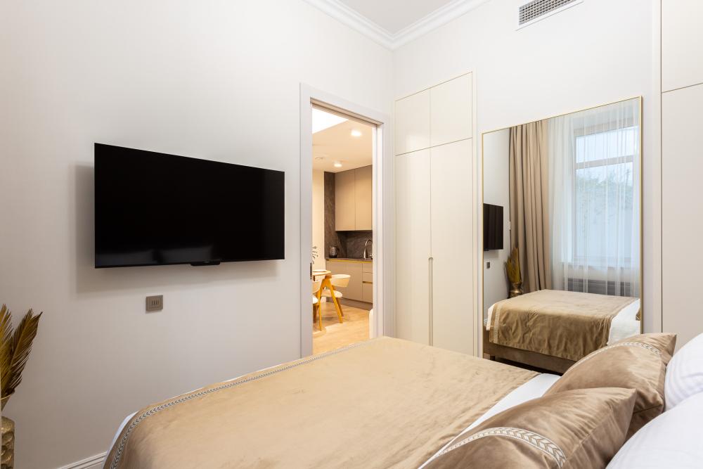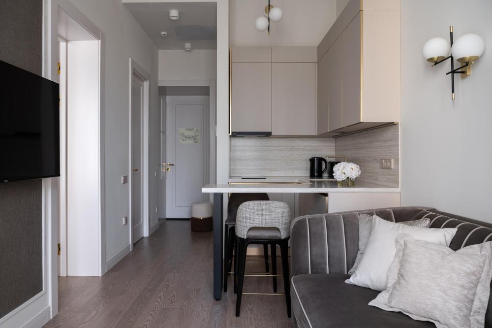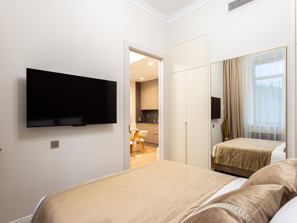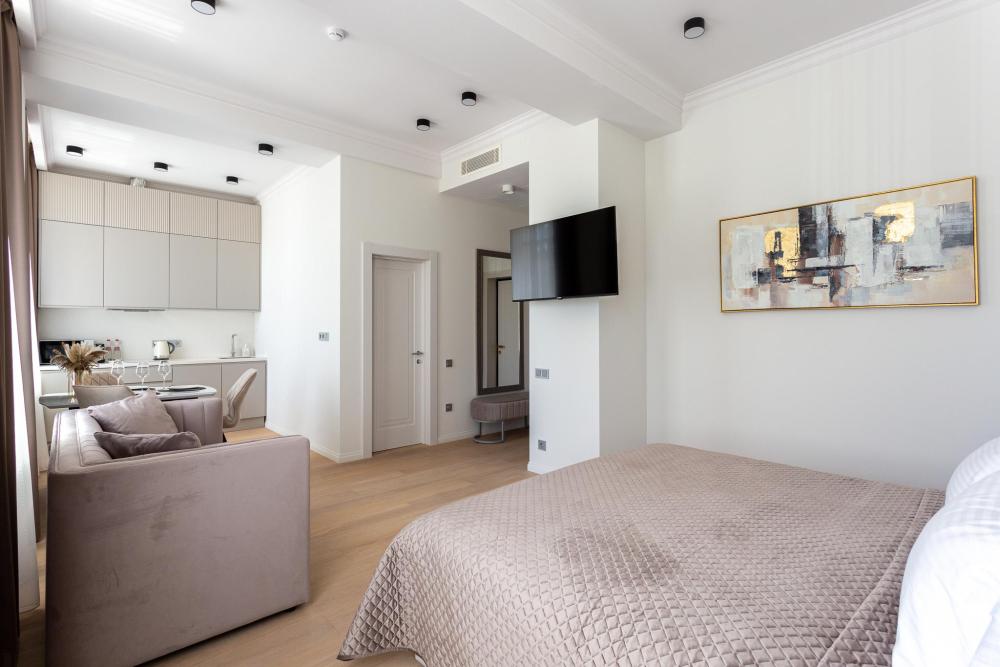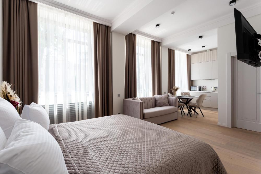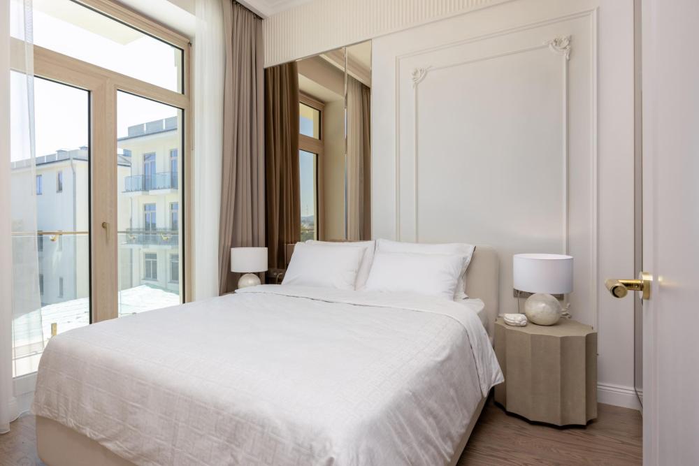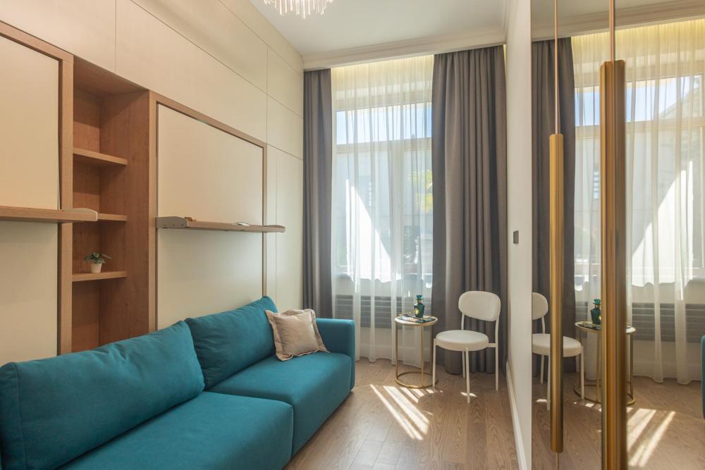 Просторный апартамент с видом на парк, площадью 35 м² разделён функциональной декоративной перегородкой, отделяющей спальную зону с двуспальной кроватью от гостиной с диваном. ✔️В каждом апартаменте есть кухонная зона, электробытовые приборы, вся необходимая посуда, холодильник встроенный двухкамерный; ✔️Комфортная температура в помещении поддерживается теплыми полами зимой и кондиционером летом, регулируется индивидуально для Вас; ✔️Wi-fi (100 Мб); ✔️Кровать "King size" 180*200 см с ортопедическим матрасом гарантирует здоровый и крепкий сон. В гостиной раскладной диван (спальное место 190*205 см); ✔️Белоснежное постельное белье, махровые полотенца, мягкие халаты и тапочки; ✔️Средства индивидуальной гигиены; ✔️Консьерж-сервис закажет для Вас билеты на мероприятия, организует морскую прогулку, забронирует яхту, позаботится о доставке и возьмет под свой контроль другие дела, освободив Вам время для отдыха.