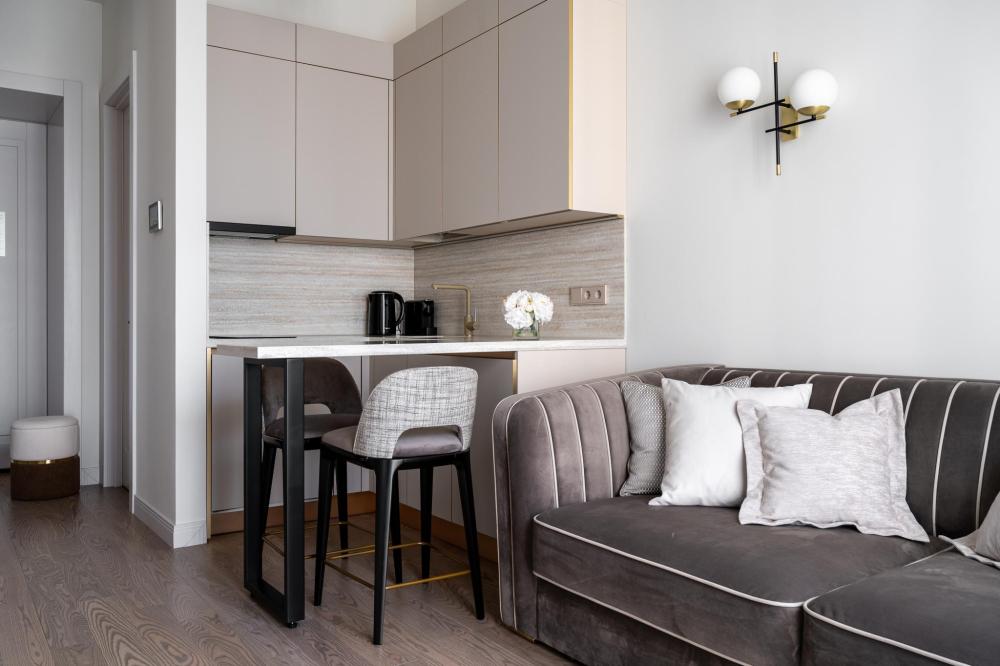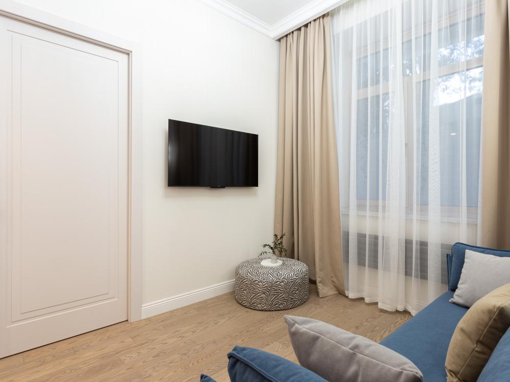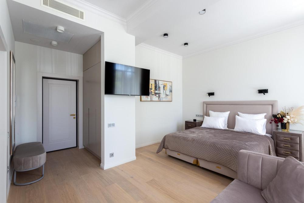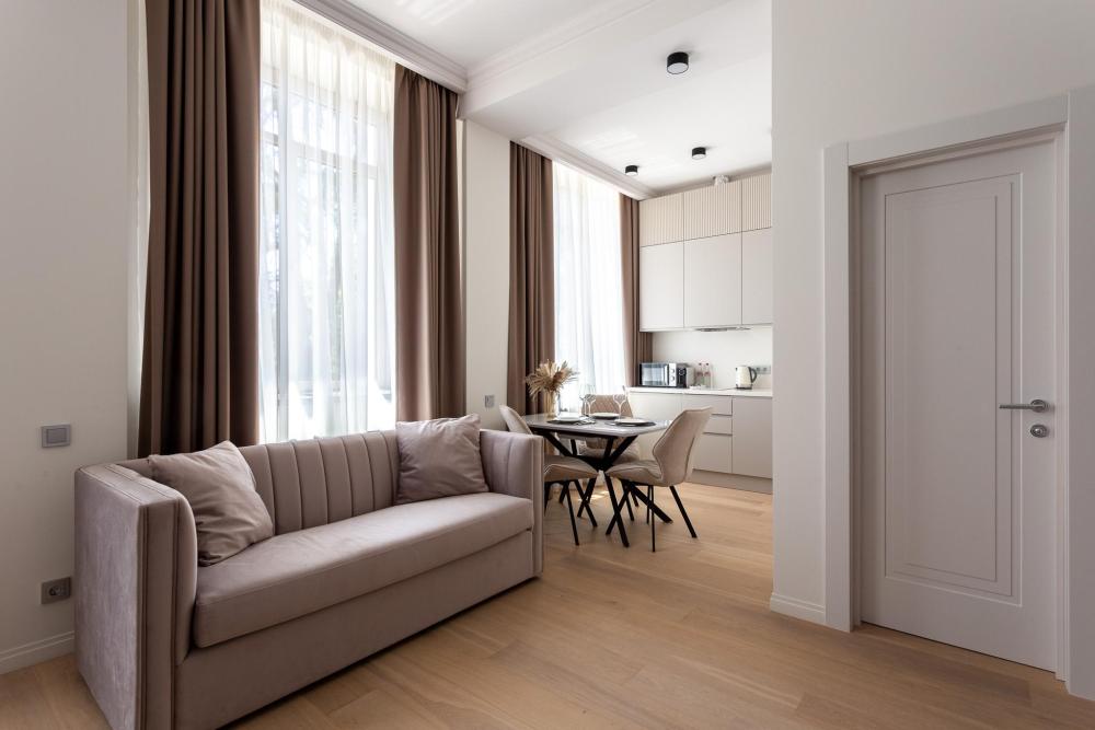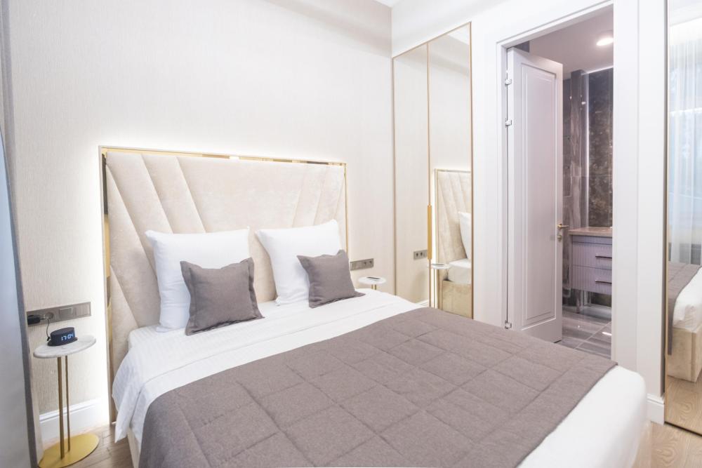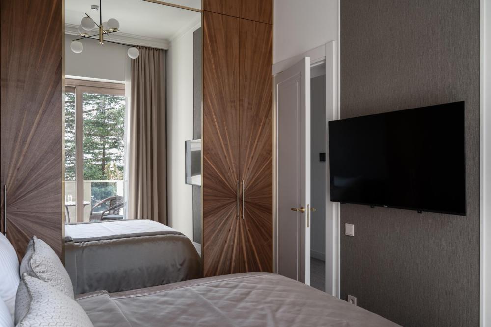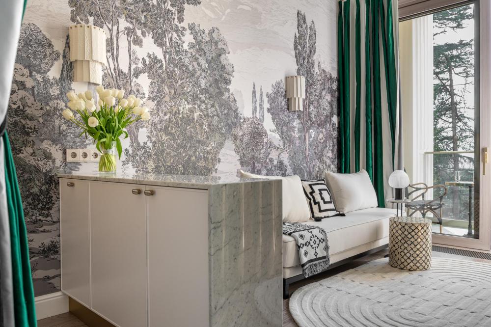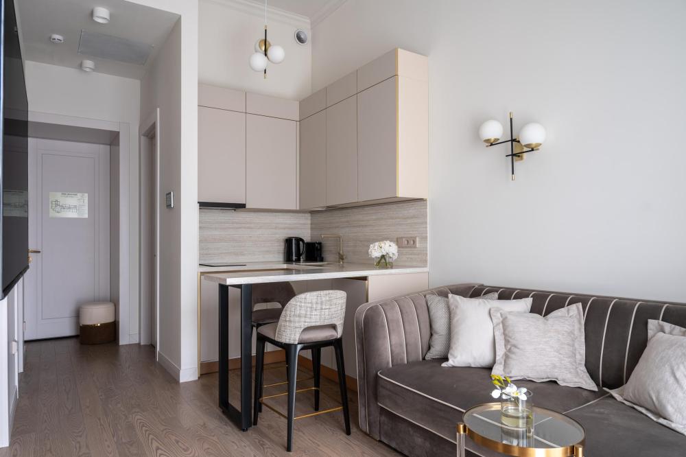 Просторный апартамент с видом на парк, площадью 35 м² разделён функциональной декоративной перегородкой, отделяющей спальную зону с двуспальной кроватью от гостиной с диваном. ✔️В каждом апартаменте есть кухонная зона, электробытовые приборы, вся необходимая посуда, холодильник встроенный двухкамерный; ✔️Комфортная температура в помещении поддерживается теплыми полами зимой и кондиционером летом, регулируется индивидуально для Вас; ✔️Wi-fi (100 Мб); ✔️Кровать "King size" 180*200 см с ортопедическим матрасом гарантирует здоровый и крепкий сон. В гостиной раскладной диван (спальное место 190*205 см); ✔️Белоснежное постельное белье, махровые полотенца, мягкие халаты и тапочки; ✔️Средства индивидуальной гигиены; ✔️Консьерж-сервис закажет для Вас билеты на мероприятия, организует морскую прогулку, забронирует яхту, позаботится о доставке и возьмет под свой контроль другие дела, освободив Вам время для отдыха.