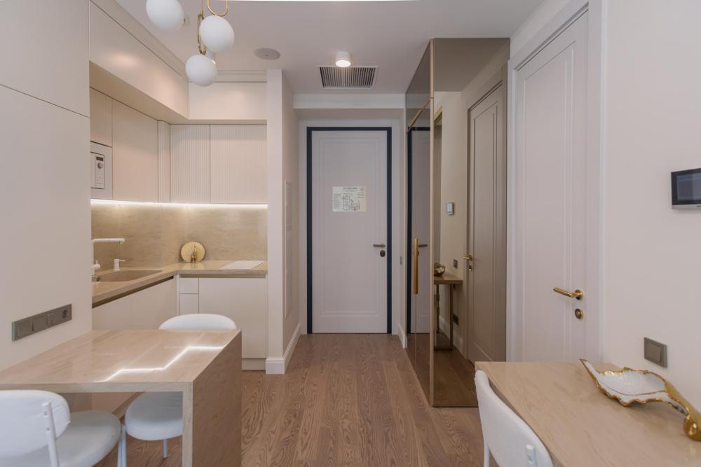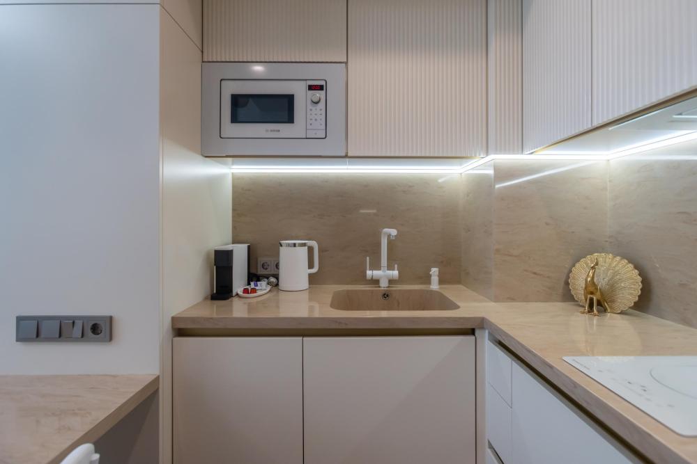 Уютная студия площадью 25 м² выполнена в современном и эргономичном дизайне, интерьер, оформленный в светлых тонах, создает располагающую к отдыху атмосферу. Апартамент расположен на -1 этаже, при этом отсутствие шикарного вида компенсирует эстетика и продуманность каждой детали интерьера. ✔️В каждой студии есть кухонная зона, электробытовые приборы, вся необходимая посуда, холодильник встроенный однокамерный; ✔️Комфортная температура в помещении поддерживается теплыми полами зимой и кондиционером летом, регулируется индивидуально для Вас; ✔️Wi-fi (100 Мб); ✔️Кровать "Queen size" 160*200 см с ортопедическим матрасом гарантирует здоровый и крепкий сон; ✔️Белоснежное постельное белье, махровые полотенца, мягкие халаты и тапочки; ✔️Средства индивидуальной гигиены; ✔️Консьерж-сервис закажет для Вас билеты на мероприятия, организует морскую прогулку, забронирует яхту, позаботится о доставке и возьмет под свой контроль другие дела, освободив Вам время для отдыха. Студия рассчитана на двоих Гостей + дополнительно возможно разместить 1 ребёнка (0-4 лет), без предоставления спального места.