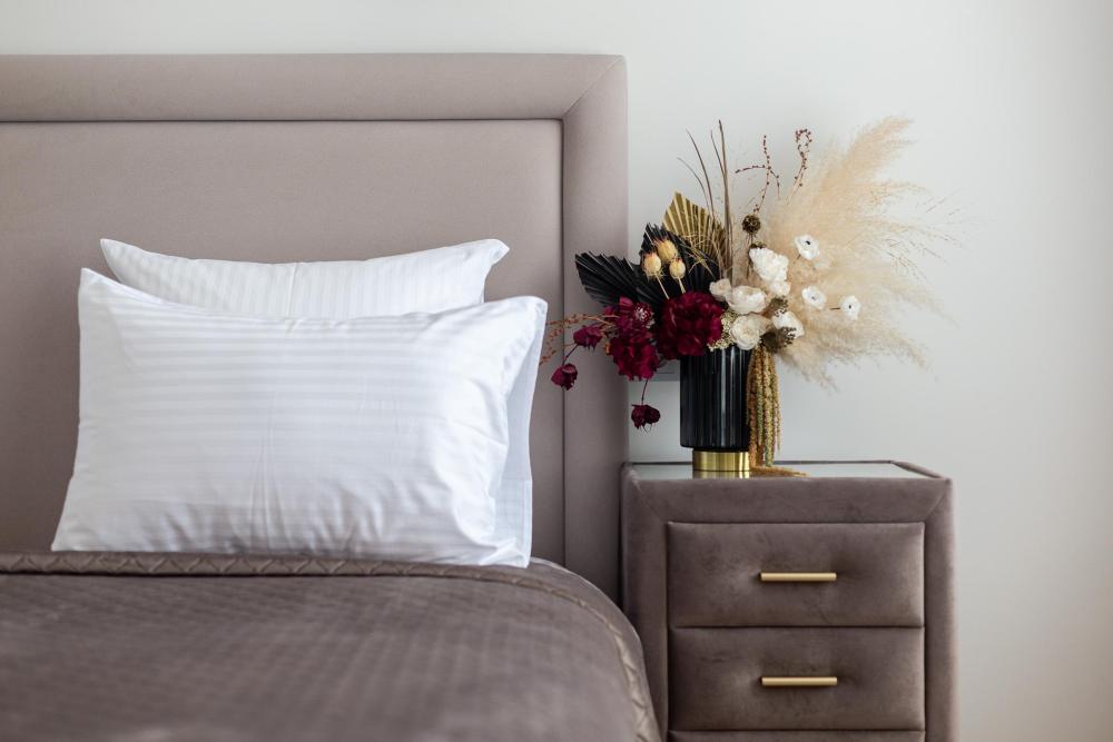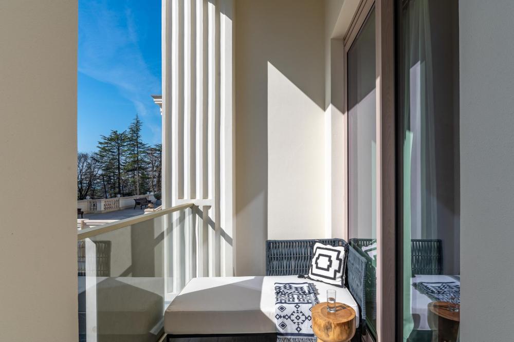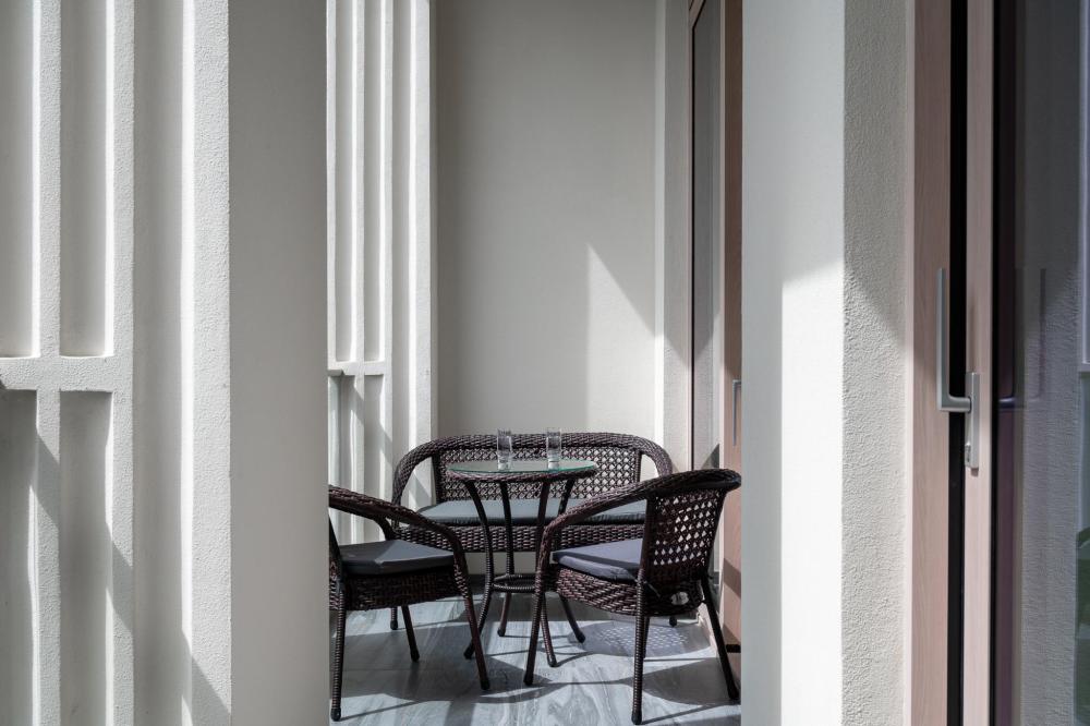 Просторный апартамент с панорамным видом на море и балконом, площадью 50 м² разделён функциональной декоративной перегородкой, отделяющей спальную зону с двуспальной кроватью от гостиной с диваном. В апартаменте предусмотрена одна кровать "King size" 180 см*200 см и нераскладной диван (спальное место) 70 см*185 см.