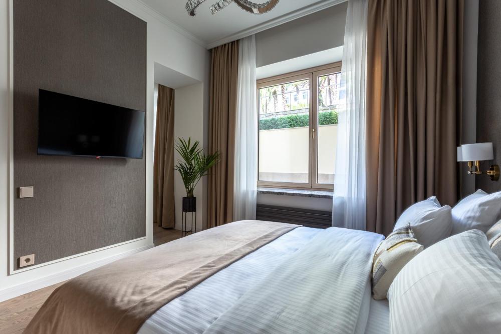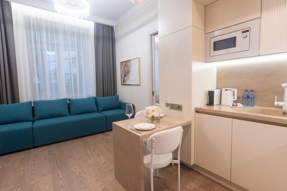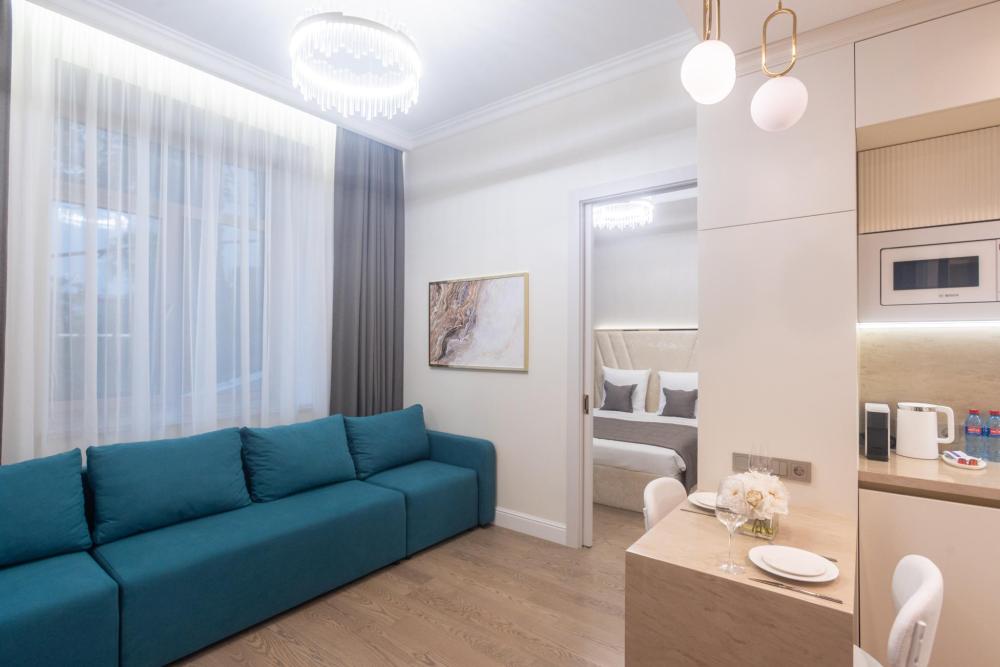 Просторный апартамент с видом на итальянский дворик, площадью 34 м² разделён функциональной декоративной перегородкой, отделяющей спальную зону с двуспальной кроватью от гостиной с диваном. ✔️В каждом апартаменте есть кухонная зона, электробытовые приборы, вся необходимая посуда, холодильник встроенный полноразмерный; ✔️Комфортная температура в помещении поддерживается теплыми полами зимой и кондиционером летом, регулируется индивидуально для Вас; ✔️Wi-fi (100 Мб); ✔️Кровать "Queen size" 160*200 см с ортопедическим матрасом гарантирует здоровый и крепкий сон. В гостиной раскладной диван (спальное место 140*185 см); ✔️Белоснежное постельное белье, махровые полотенца, мягкие халаты и тапочки; ✔️Средства индивидуальной гигиены; ✔️Консьерж-сервис закажет для Вас билеты на мероприятия, организует морскую прогулку, забронирует яхту, позаботится о доставке и возьмет под свой контроль другие дела, освободив Вам время для отдыха.