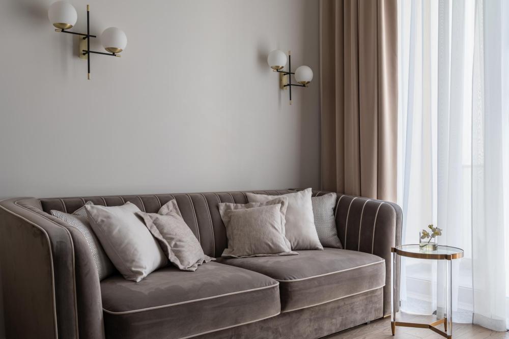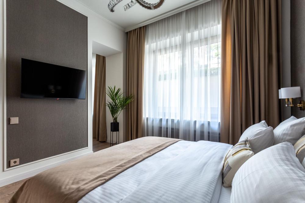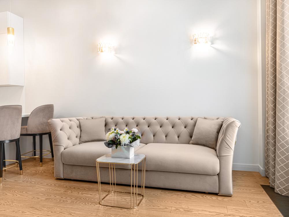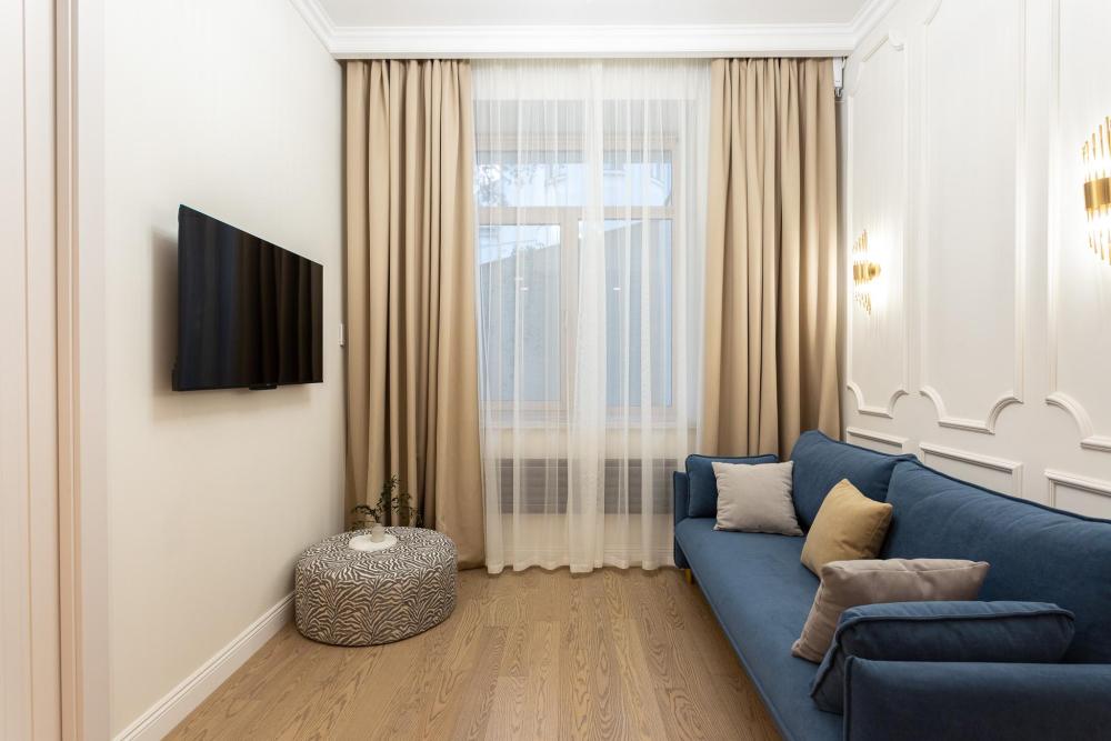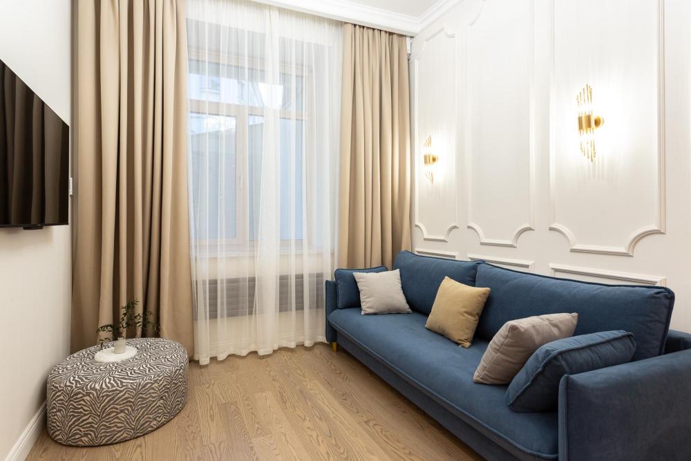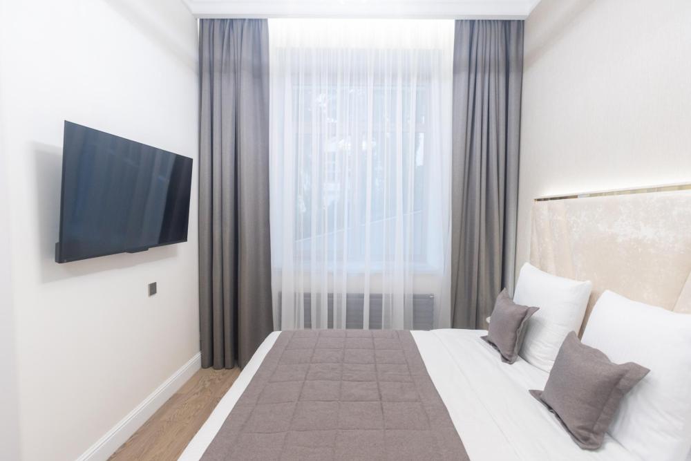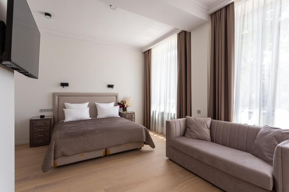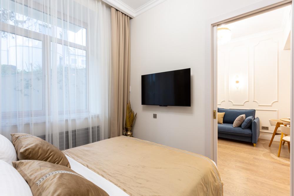 Уютные апартаменты, расположены на цокольном этаже и не имеет видовых характеристик. Просторный и комфортабельный апартамент разделён функциональной декоративной перегородкой, отделяющей спальную зону с двуспальной кроватью от гостиной с диваном. В апартаменте одна кровать "Queen size" 160 см*200 см и раскладной диван 140 см*190 см.