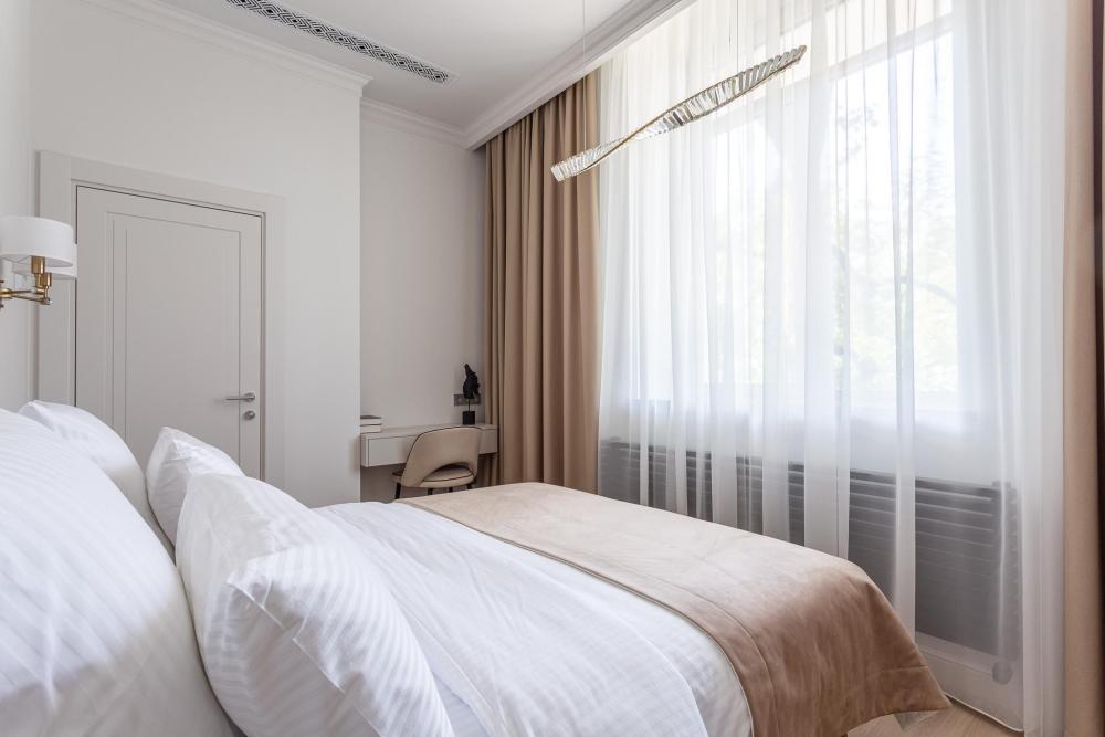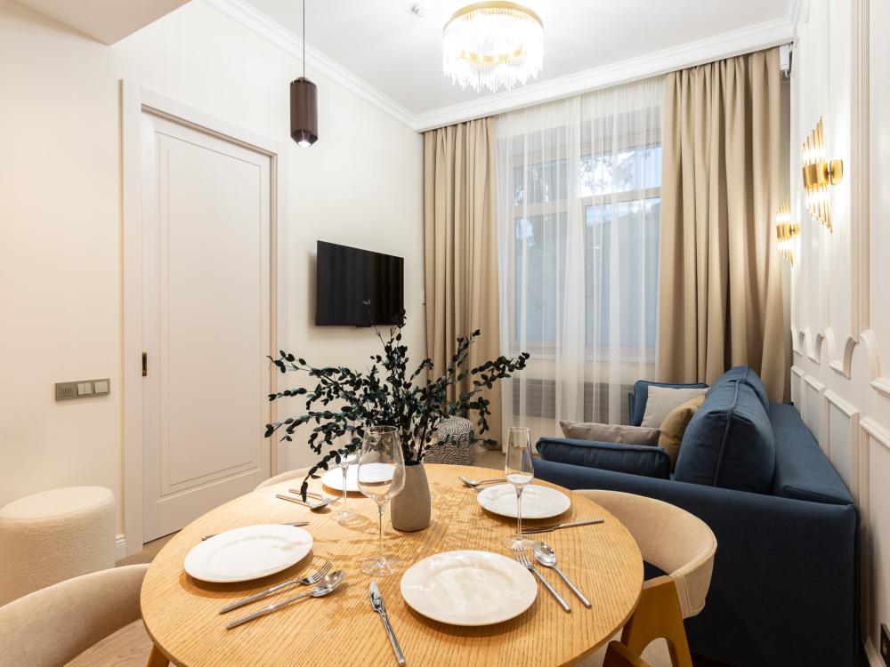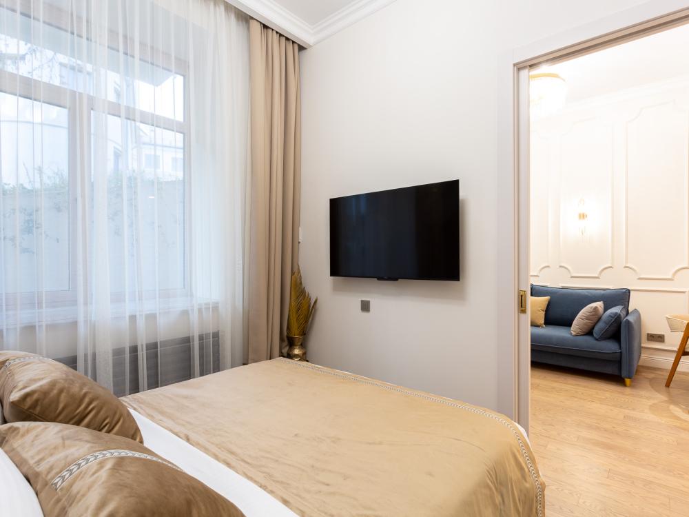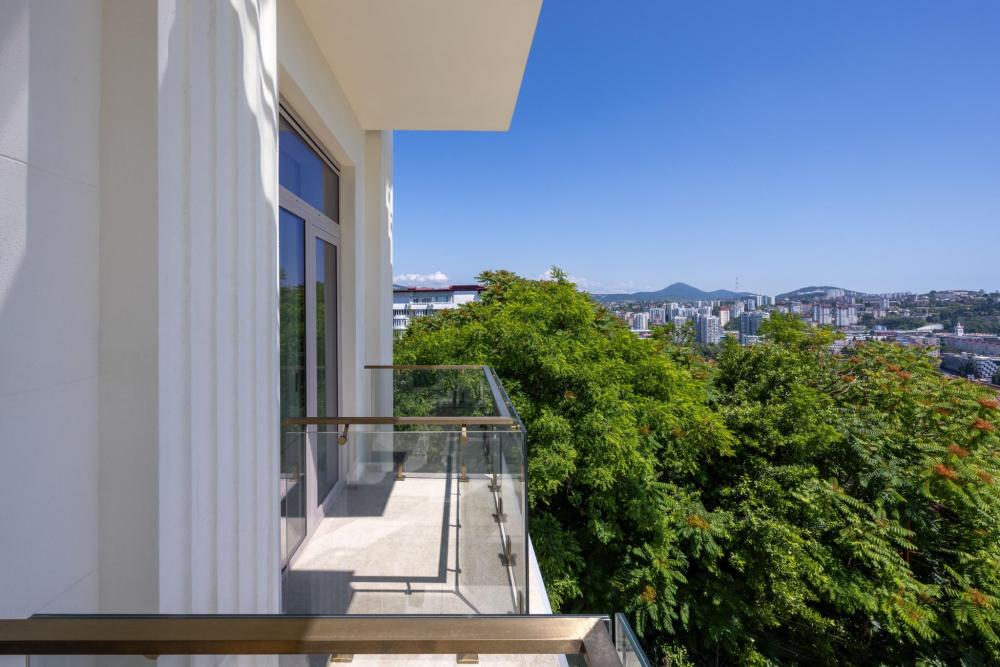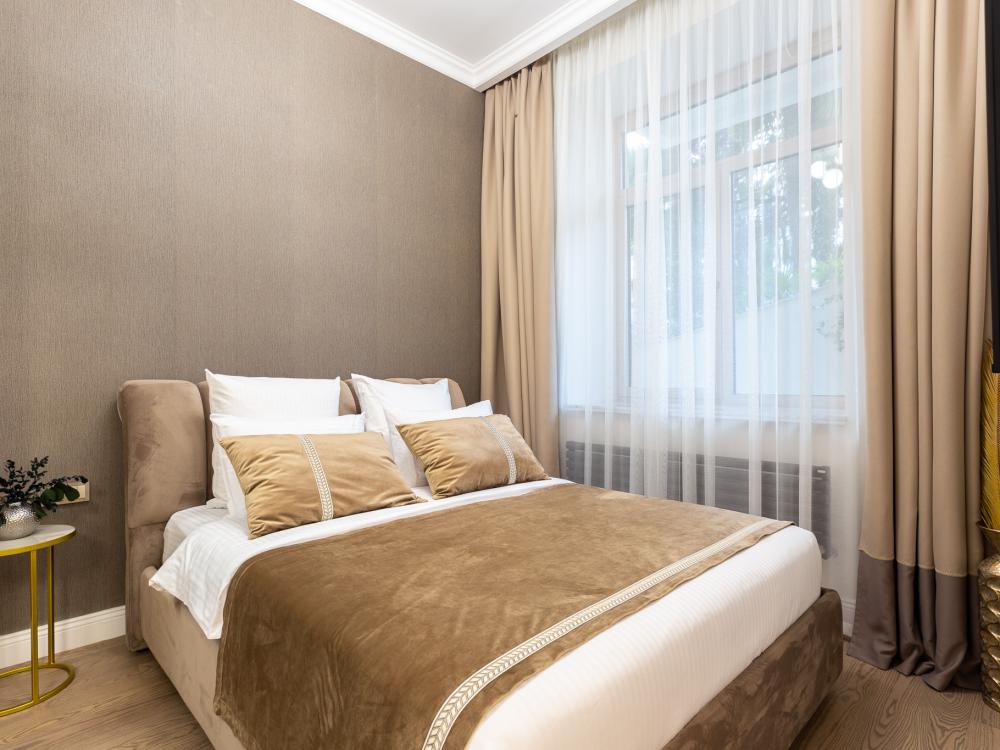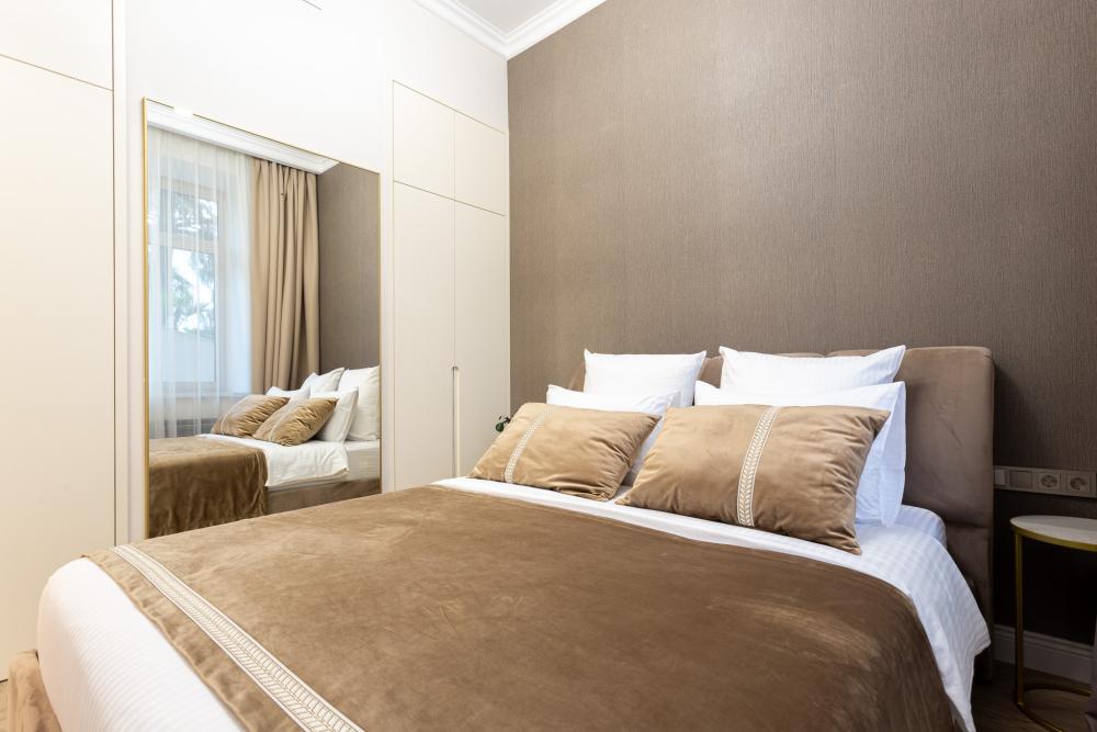 Эксклюзивный и единственный в своем роде апартамент высокого уровня, для Гостей, ценящих качество, стиль, комфорт и индивидуальность. Просторный апартамент с балконом и великолепным видом на парк и город, площадью 118 м² распланирован в гостиную с зоной кухни, спальню и самостоятельную студию с отдельным входом, которую можно использовать для персонала. В отделке выбраны материалы природного происхождения, пол и стены отделаны траониксом, привезенным из Ирана. Мебель, текстиль и декор выполнены по индивидуальному заказу в единственном экземпляре. ✔️В каждом апартаменте есть кухонная зона, электробытовые приборы, вся необходимая посуда, холодильник встроенный полноразмерный; ✔️Комфортная температура в помещении поддерживается теплыми полами зимой и кондиционером летом, регулируется индивидуально для Вас; ✔️Wi-fi (100 Мб); ✔️Кровать "King size" 180*200 см с ортопедическим матрасом гарантирует здоровый и крепкий сон; ✔️Белоснежное постельное белье, махровые полотенца, мягкие халаты и тапочки; ✔️Средства индивидуальной гигиены. Апартамент рассчитан на четверых Гостей + дополнительно возможно разместить 1 ребёнка (0-7 лет), без предоставления спального места.