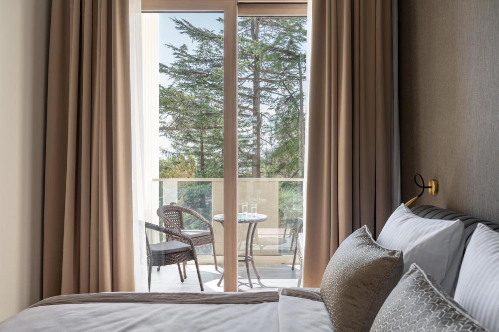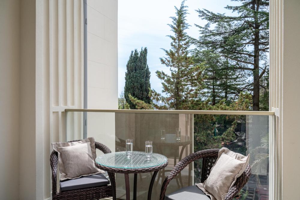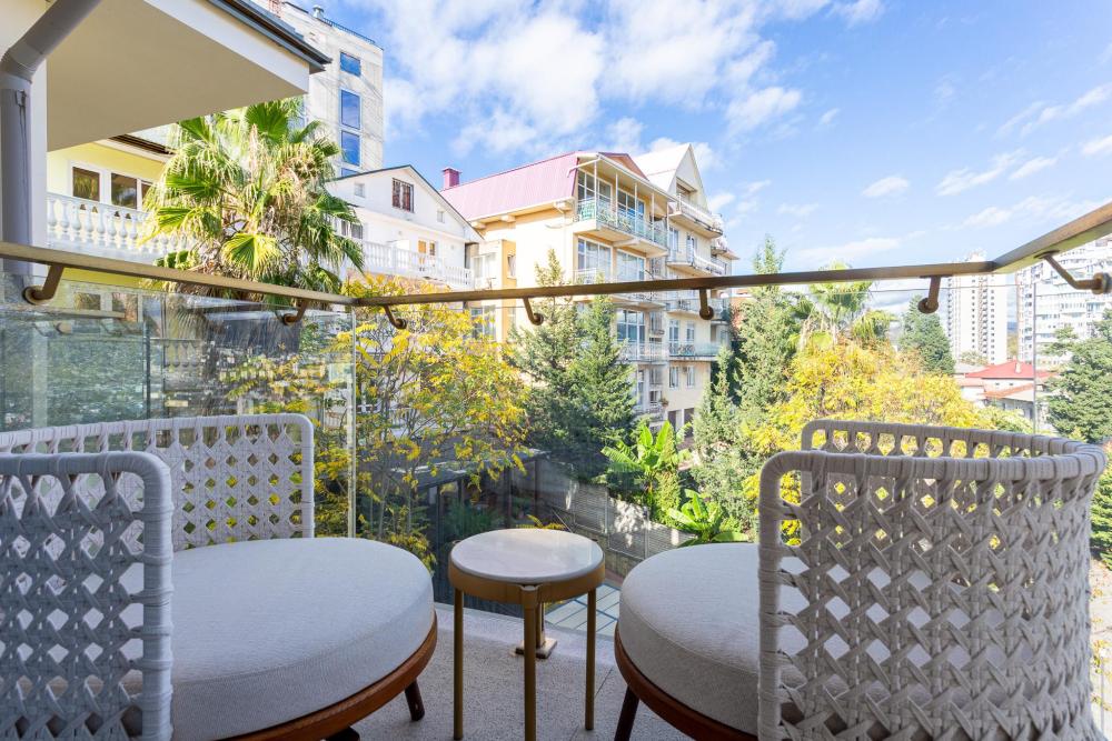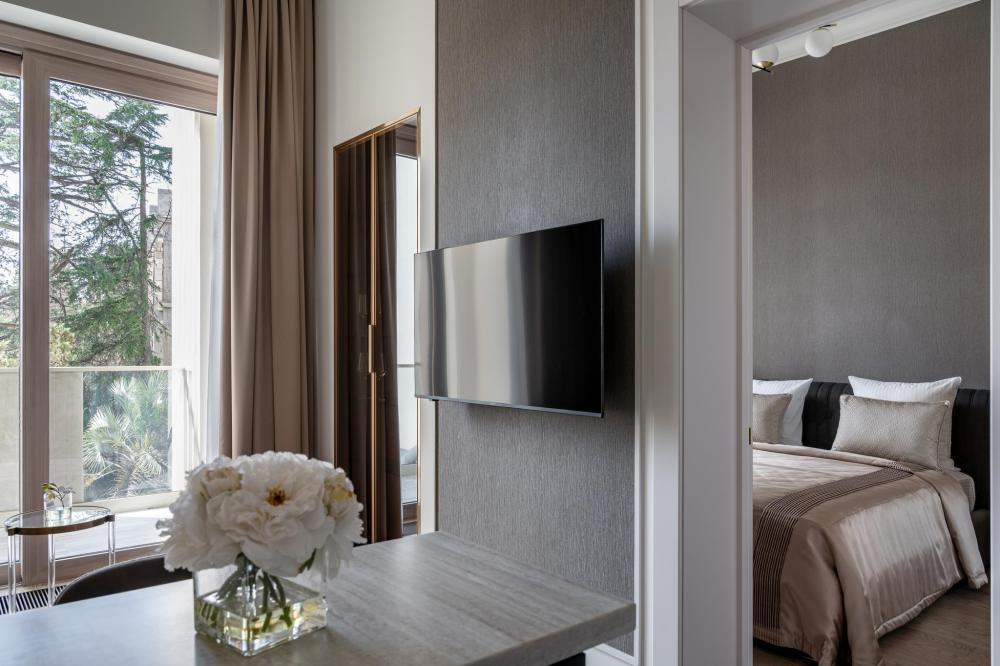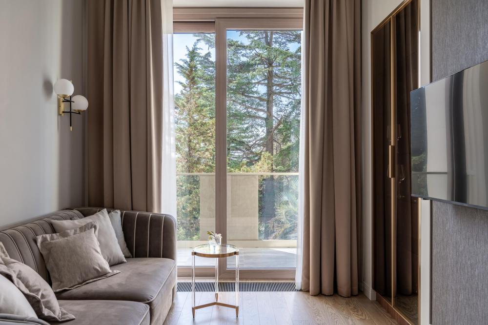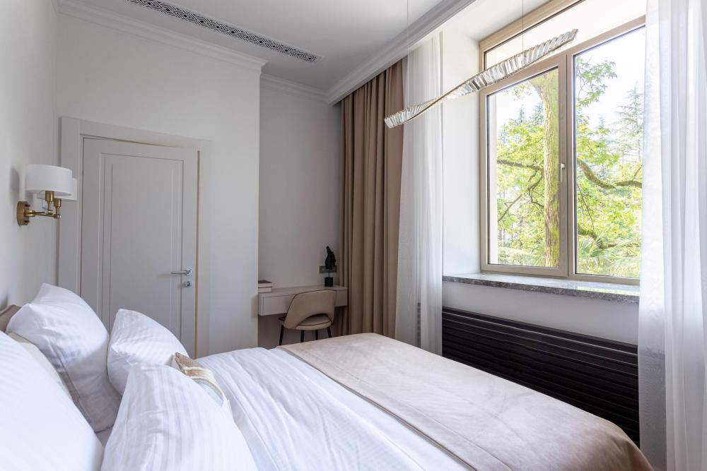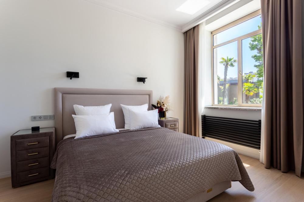Просторный апартамент с видом на дендрарий, площадью 34 м² разделён функциональной декоративной перегородкой, отделяющей спальную зону с двуспальной кроватью от гостиной с диваном. ✔️В каждом апартаменте есть кухонная зона, электробытовые приборы, вся необходимая посуда, холодильник встроенный полноразмерный; ✔️Комфортная температура в помещении поддерживается теплыми полами зимой и кондиционером летом, регулируется индивидуально для Вас; ✔️Wi-fi (100 Мб); ✔️Кровать "Queen size" 160*200 см с ортопедическим матрасом гарантирует здоровый и крепкий сон. В гостиной раскладной диван (спальное место 140*200 см); ✔️Белоснежное постельное белье, махровые полотенца, мягкие халаты и тапочки; ✔️Средства индивидуальной гигиены; ✔️Консьерж-сервис закажет для Вас билеты на мероприятия, организует морскую прогулку, забронирует яхту, позаботится о доставке и возьмет под свой контроль другие дела, освободив Вам время для отдыха. Апартамент рассчитан на четверых Гостей + дополнительно возможно разместить 1 ребёнка (0-4 лет), без предоставления спального места.