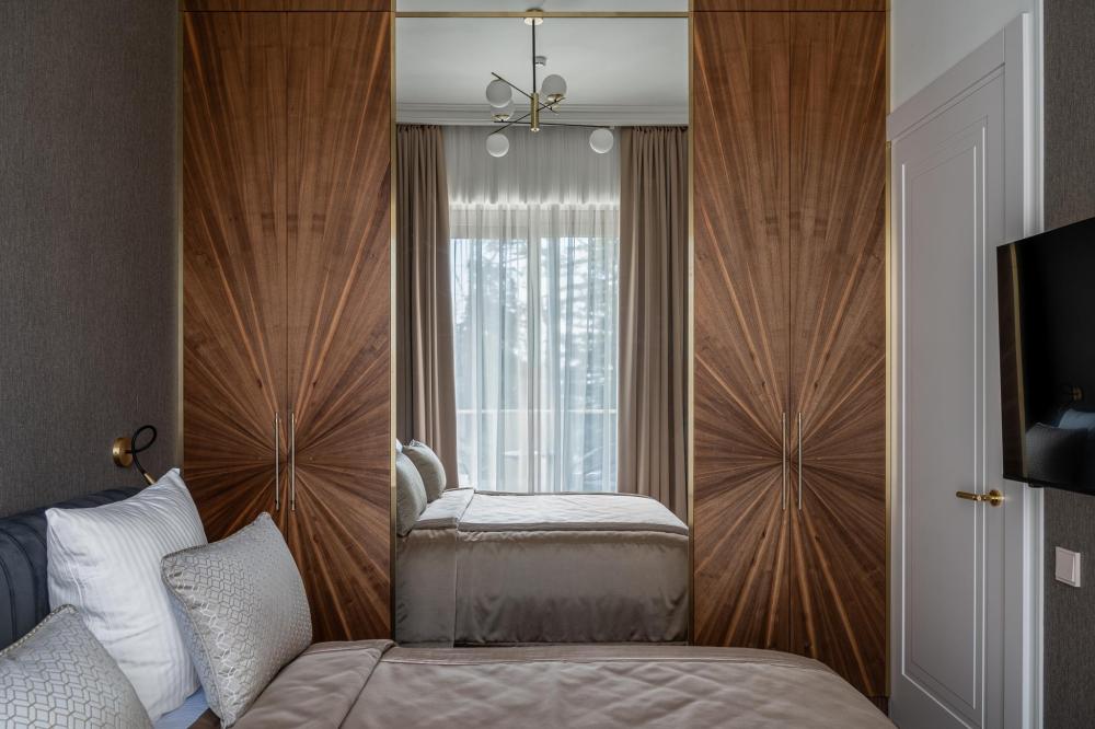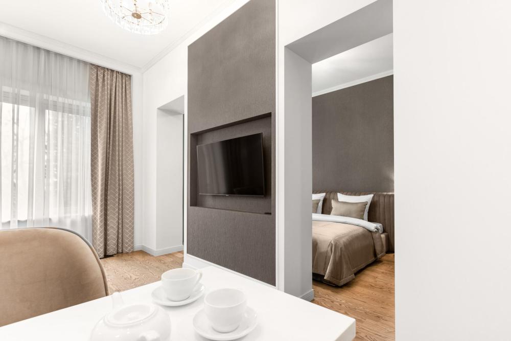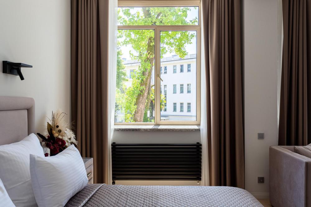 Просторные апартаменты с видом на парк, площадью 46 м² разделён функциональной декоративной перегородкой, отделяющей спальную зону с двуспальной кроватью от гостиной с диваном. В апартаментах возможно размещение до 4 человек. В апартаменте одна кровать "King size" 180 см*200 см и раскладной диван (спальное место) 140 см*190 см.