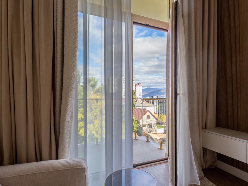 Просторный апартамент с видом на горы, площадью 35 м² разделён функциональной декоративной перегородкой, отделяющей спальную зону с двуспальной кроватью от гостиной с диваном. ✔️В каждом апартаменте есть кухонная зона, электробытовые приборы, вся необходимая посуда, холодильник встроенный однокамерный; ✔️Комфортная температура в помещении поддерживается теплыми полами зимой и кондиционером летом, регулируется индивидуально для Вас; ✔️Wi-fi (100 Мб); ✔️Кровать "King size" 160*200 см с ортопедическим матрасом гарантирует здоровый и крепкий сон. В гостиной раскладной диван (спальное место 140*200 см); ✔️Белоснежное постельное белье, махровые полотенца, мягкие халаты и тапочки; ✔️Средства индивидуальной гигиены; ✔️Консьерж-сервис закажет для Вас билеты на мероприятия, организует морскую прогулку, забронирует яхту, позаботится о доставке и возьмет под свой контроль другие дела, освободив Вам время для отдыха. Апартамент рассчитан на троих Гостей + дополнительно возможно разместить 1 ребёнка (0-12 лет), без предоставления спального места.