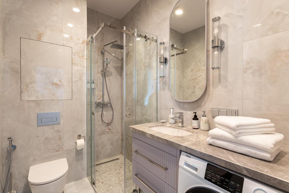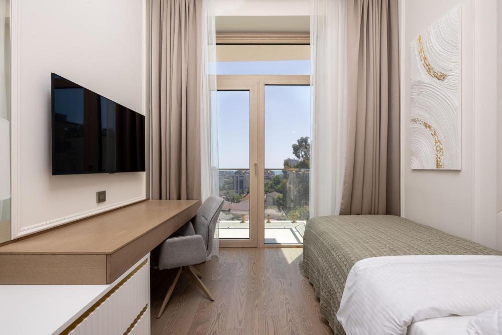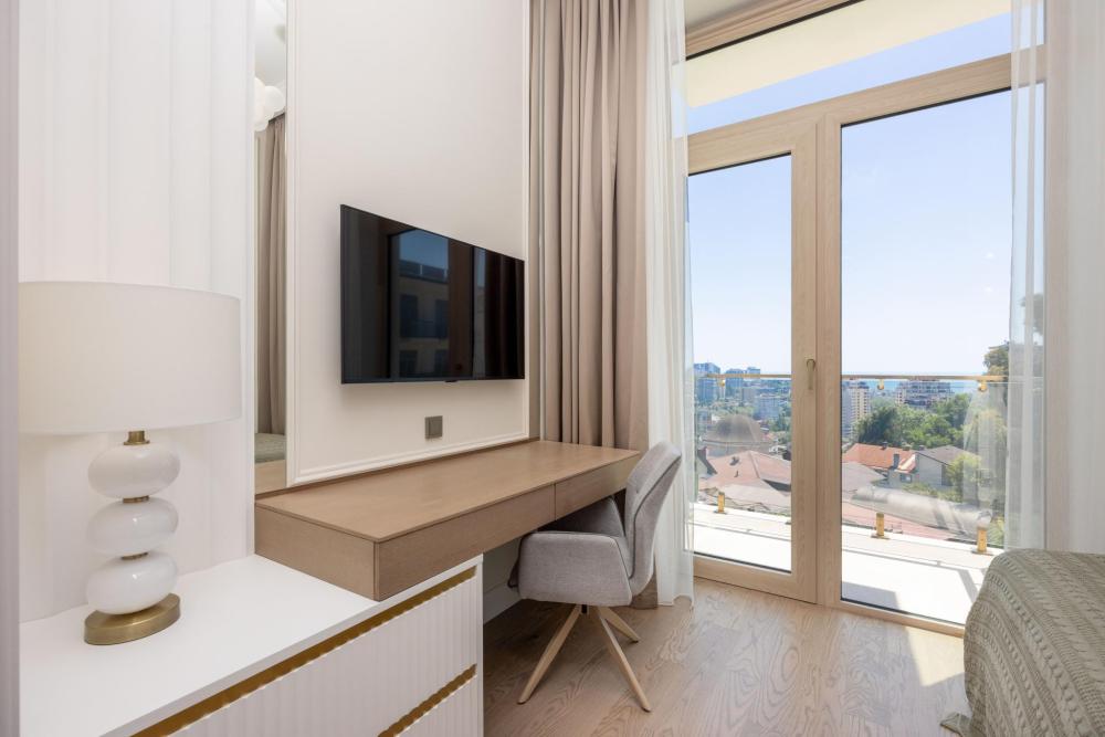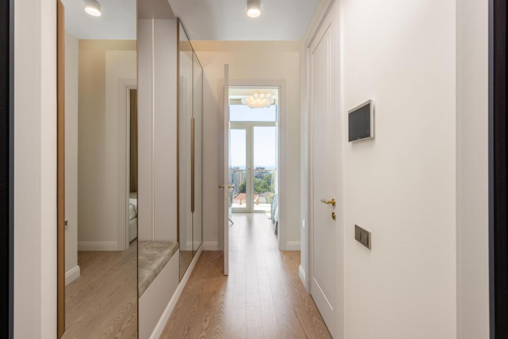 Просторный апартамент с двумя террасами и великолепным видом на море, площадью 70 м² разделён функциональной декоративной перегородкой, отделяющей спальную зону с двуспальной кроватью от гостиной с обеденной зоной. ✔️В каждом апартаменте есть кухонная зона, электробытовые приборы, вся необходимая посуда, холодильник встроенный полноразмерный; ✔️Комфортная температура в помещении поддерживается теплыми полами зимой и кондиционером летом, регулируется индивидуально для Вас; ✔️Wi-fi (100 Мб); ✔️Кровать "King size" 180*200 см с ортопедическим матрасом гарантирует здоровый и крепкий сон. В гостиной раскладное кресло (спальное место 90*200 см), диван не разборный (спальное место 110*220 см); ✔️Белоснежное постельное белье, махровые полотенца, мягкие халаты и тапочки; ✔️Средства индивидуальной гигиены; ✔️Консьерж-сервис закажет для Вас билеты на мероприятия, организует морскую прогулку, забронирует яхту, позаботится о доставке и возьмет под свой контроль другие дела, освободив Вам время для отдыха. Апартамент рассчитан на троих Гостей + дополнительно возможно разместить 1 ребёнка (12-18 лет).