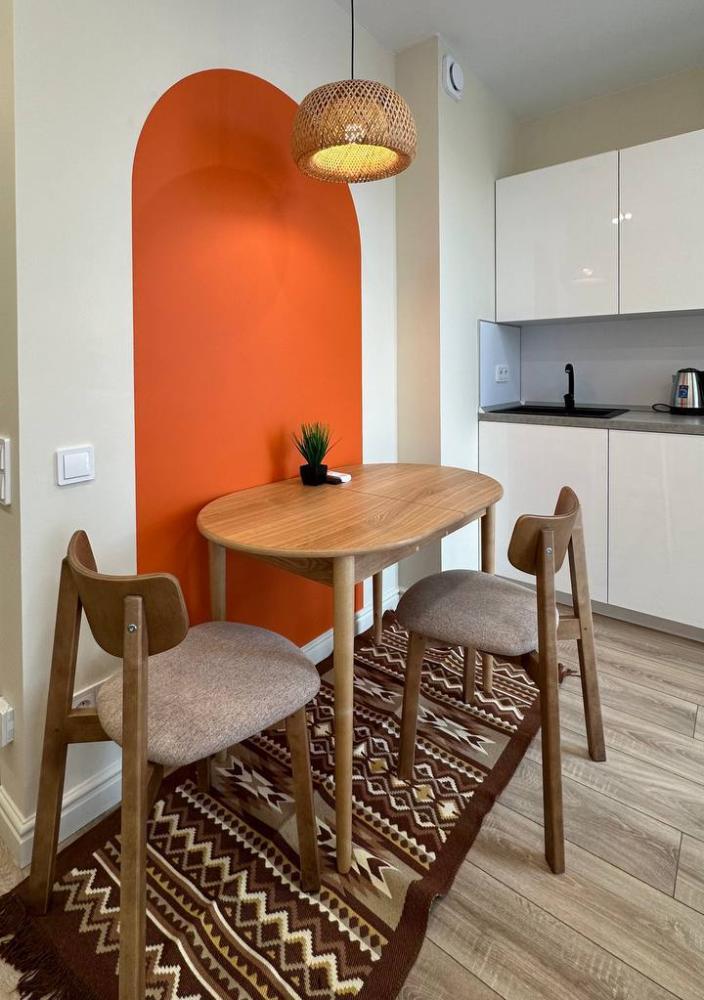Дизайнерская студия с балконом и видом на море. Квартира полностью оборудована для проживания 2+1 человек. Имеется кухонная зона со всеми удобствами, а именно: чайник, микроволновая печь, варочная панель, так же в студии есть стиральная машина, утюг, фен, кондиционер. Домашние халаты и набор полотенец для каждого отдыхающего.