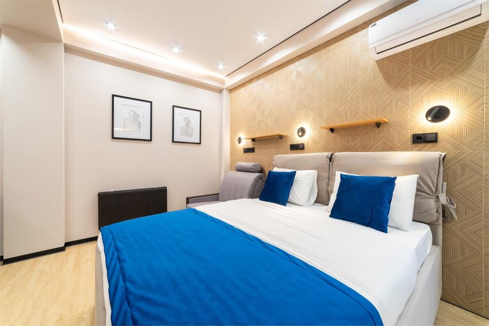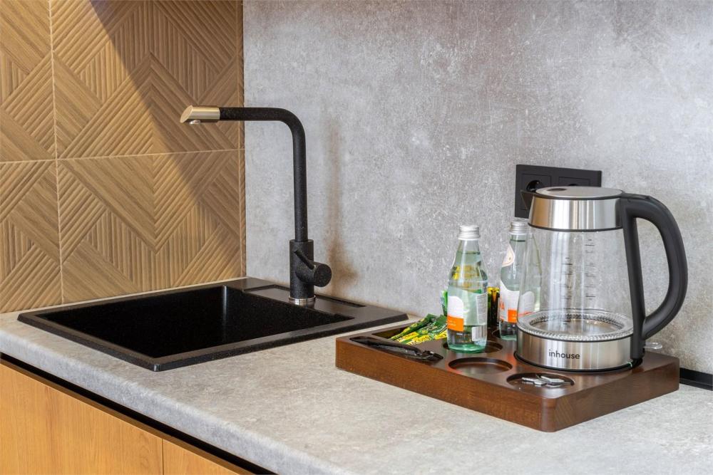 Комфортный однокомнатный номер с панорамными окнами, двуспальной кроватью и кухонной зоной.