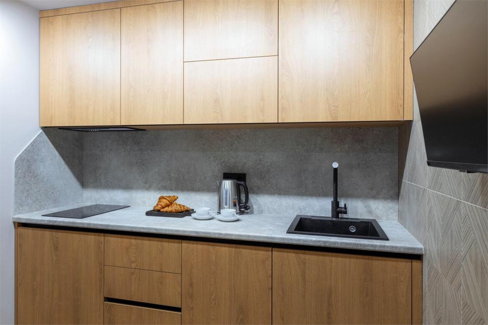 Комфортный однокомнатный номер с двуспальной кроватью, одноместным раскладным диваном и кухонной зоной.
